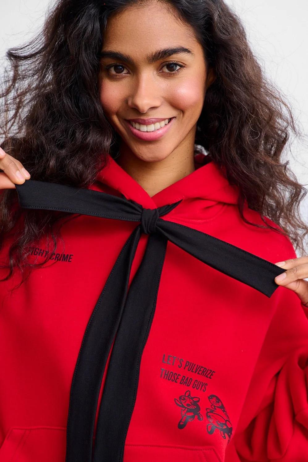 Bluza z wiązaniem No Mercy Club to energetyczna propozycja dla fanek "Powerpuff Girls". Czerwona bluza o swobodnym kroju została ozdobiona grafiką walecznych Atomówek i hasłem "LET'S PULVERIZE THOSE BAD GUYS". To manifest dziewczęcej siły!