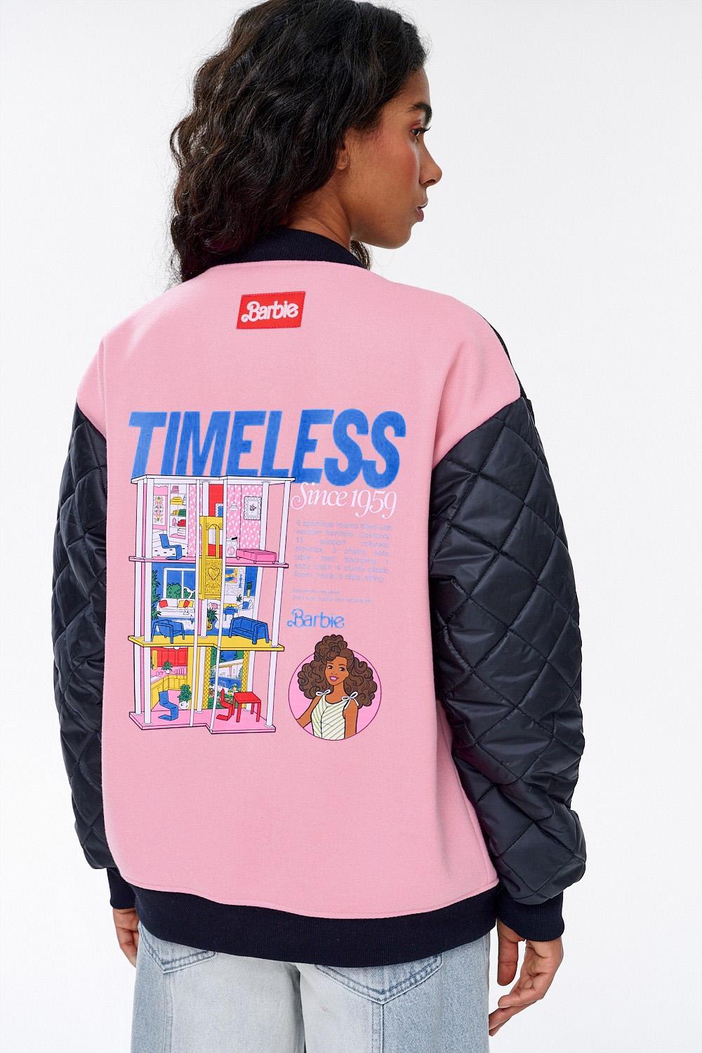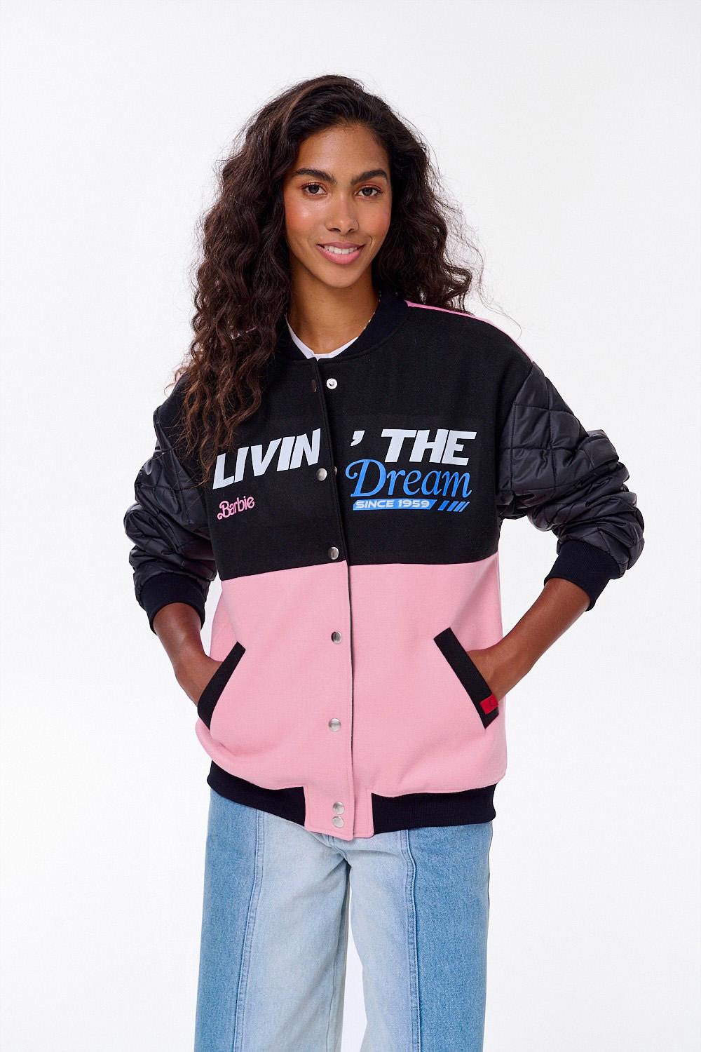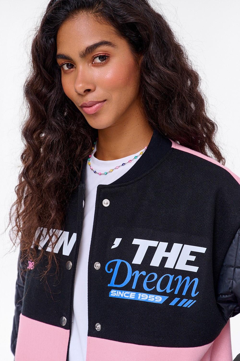 Z przodu znajdują się ozdobne napisy, a tył kurtki zdobi duży, kolorowy nadruk przedstawiający domek Dreamhouse™. Ta bomberka to idealne okrycie przejściowe, które doda charakteru każdej stylizacji – od sportowej sukienki po proste jeansy i T-shirt.