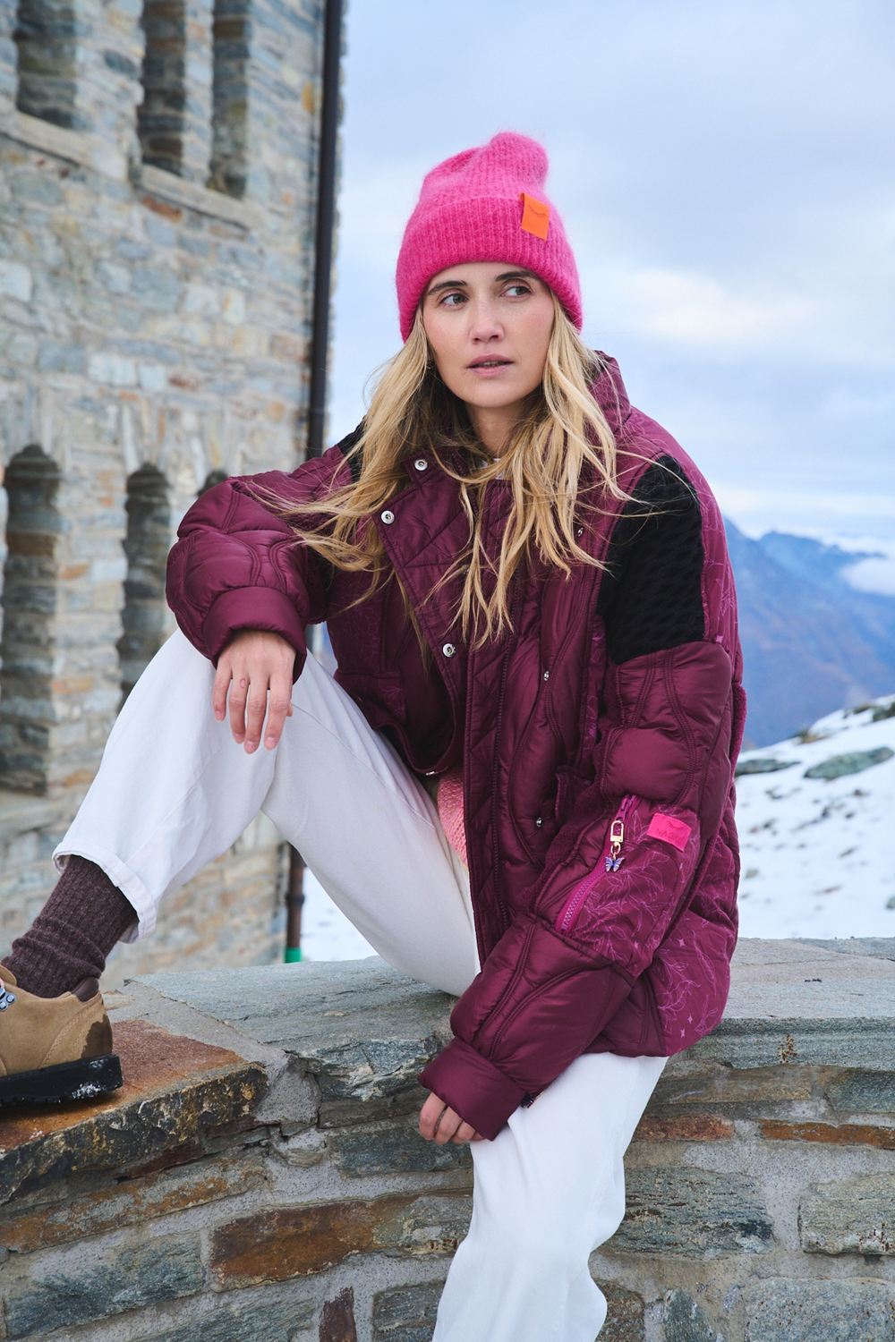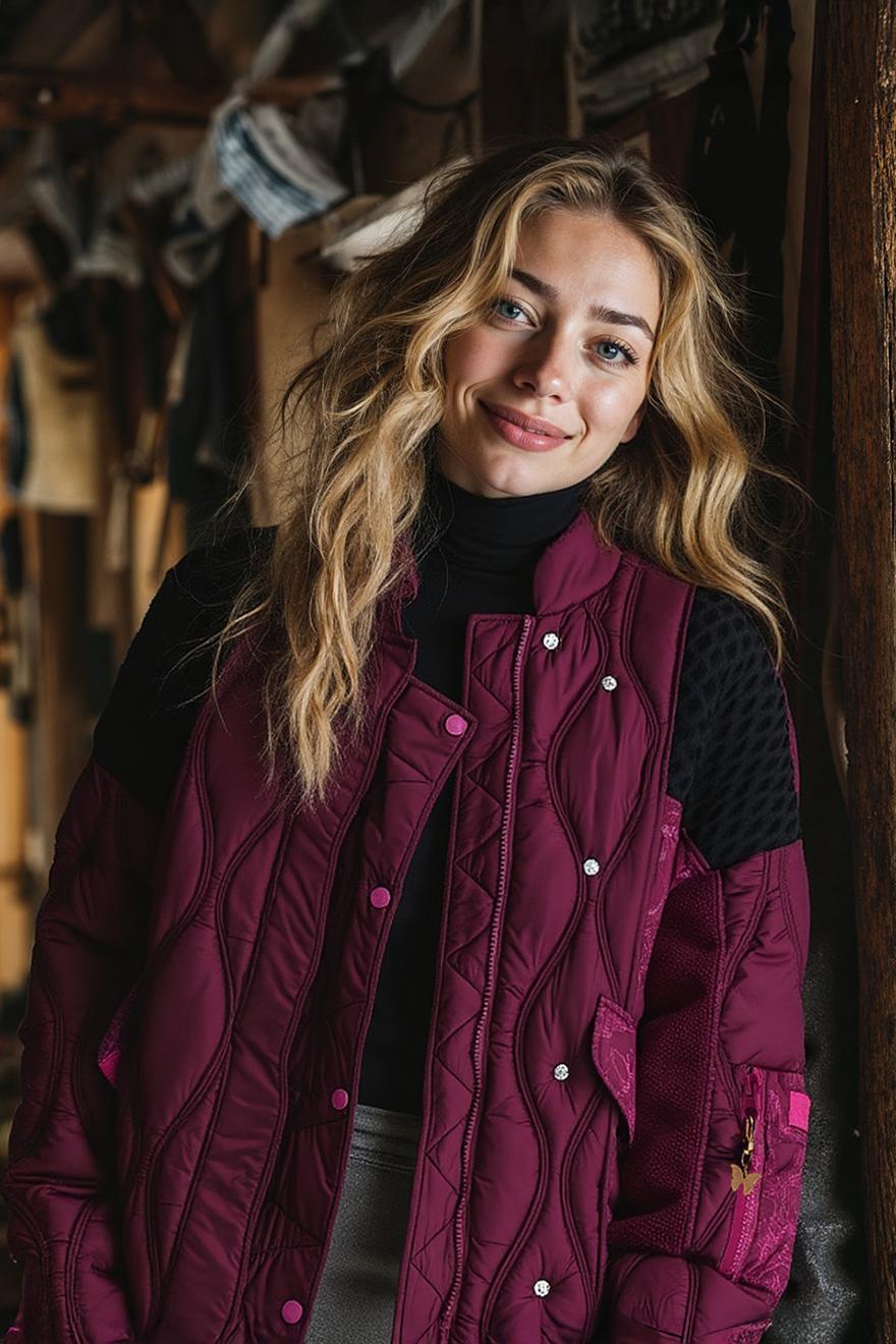 Bomberka pikowana Berry Snuggle to gra faktur i wzorów w ciepłej, bordowej tonacji. Połączenie subtelnego, kwiatowego wzoru z fakturowanymi panelami na ramionach i rękawie nadaje jej głębi i oryginalności. To kurtka, w której poczujesz się otulona i stylowa.
