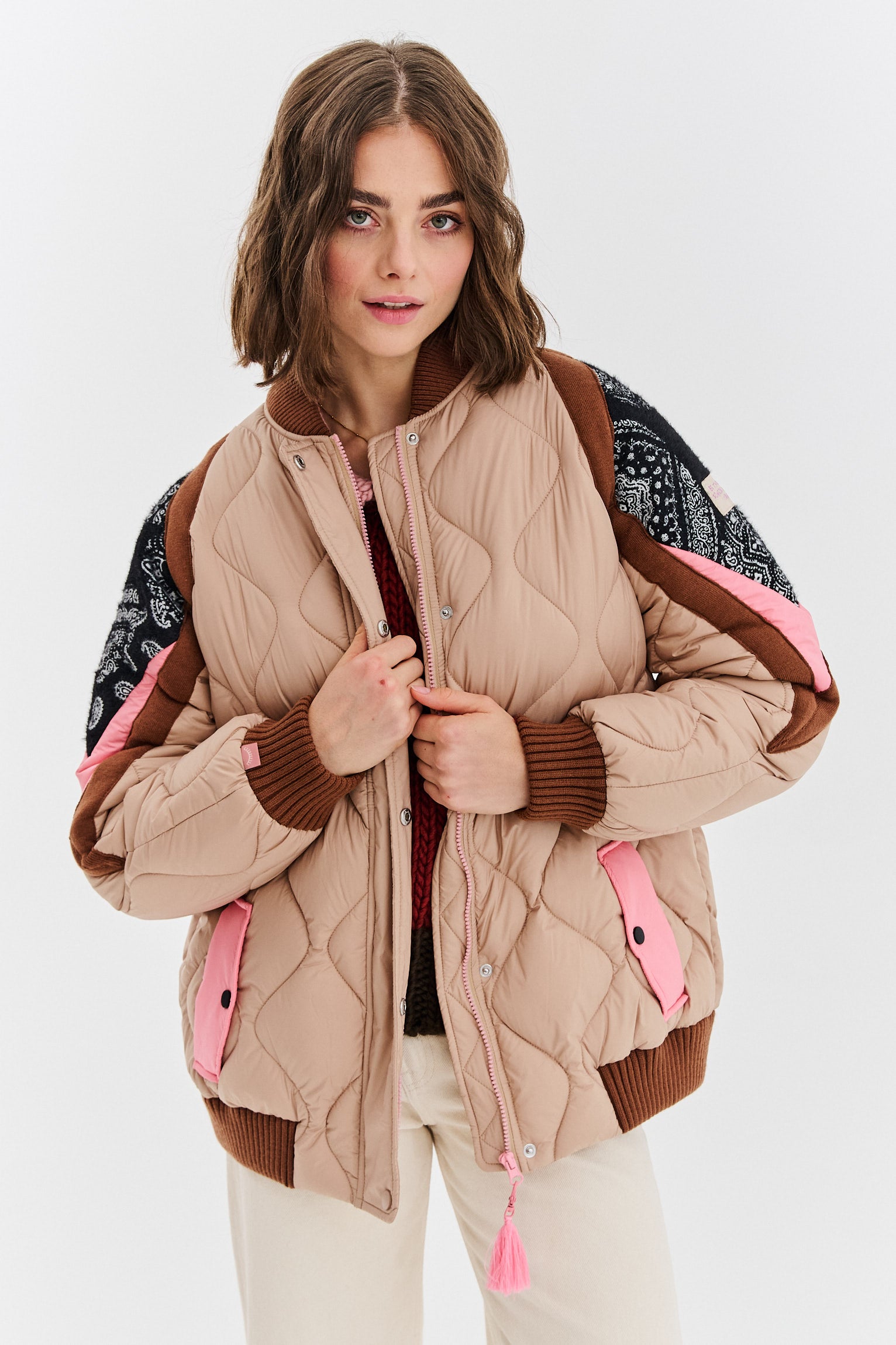 Bomberka pikowana Milkshake to przepis na modowy sukces. Bazą jest klasyczna, pikowana kurtka o luźnej formie, a charakteru dodają jej wstawki z materiału w deseń paisley oraz urocze, różowe kieszonki. To połączenie, które jest jednocześnie subtelne i wyraziste.