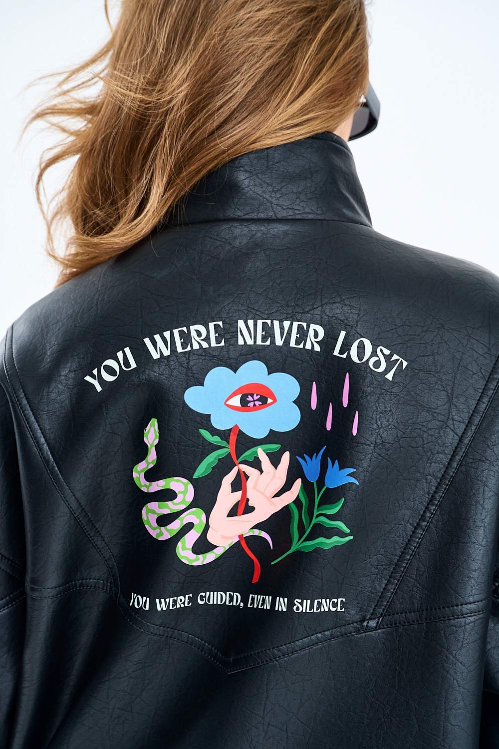 Bomberka Vintage Bloom to kurtka, która ma duszę. Przód zdobią hafty z okiem, płomieniem i kwiatem, a na plecach znajduje się duża, hipnotyzująca grafika z wężem i dłonią trzymającą kwiat. Napisy "Guided by the unseen" oraz "You were never lost" to przesłanie, które możesz nosić na sobie.