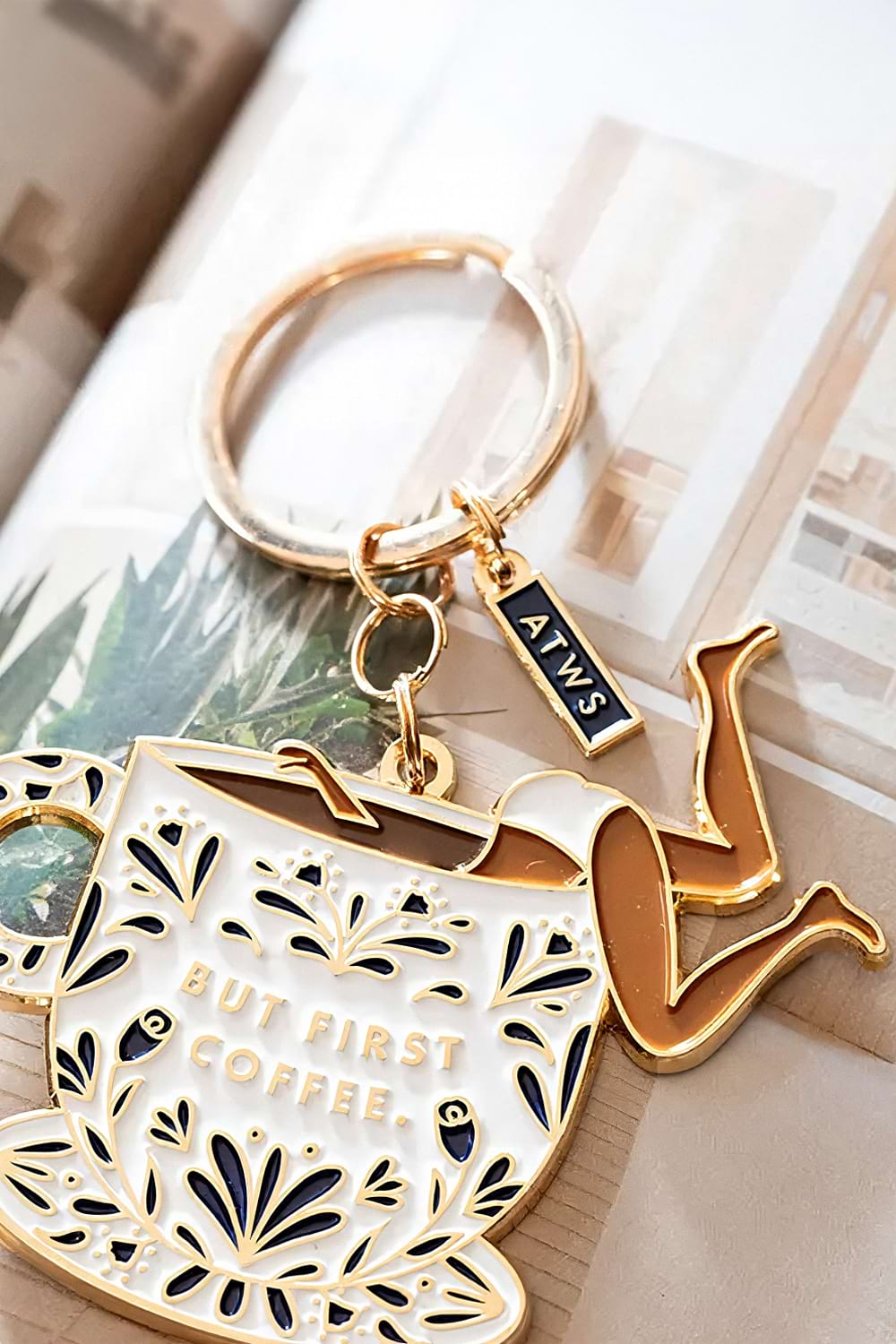 Złote wykończenie dodaje mu elegancji, a hasło „But first coffee” to jasny komunikat dla otoczenia: najpierw przyjemność, potem obowiązki. Przypnij go do kluczy lub ulubionej torebki, by mieć przy sobie małą przypominajkę o tym, co w porankach najważniejsze. To też fantastyczny pomysł na drobny prezent dla każdej miłośniczki kofeiny.
