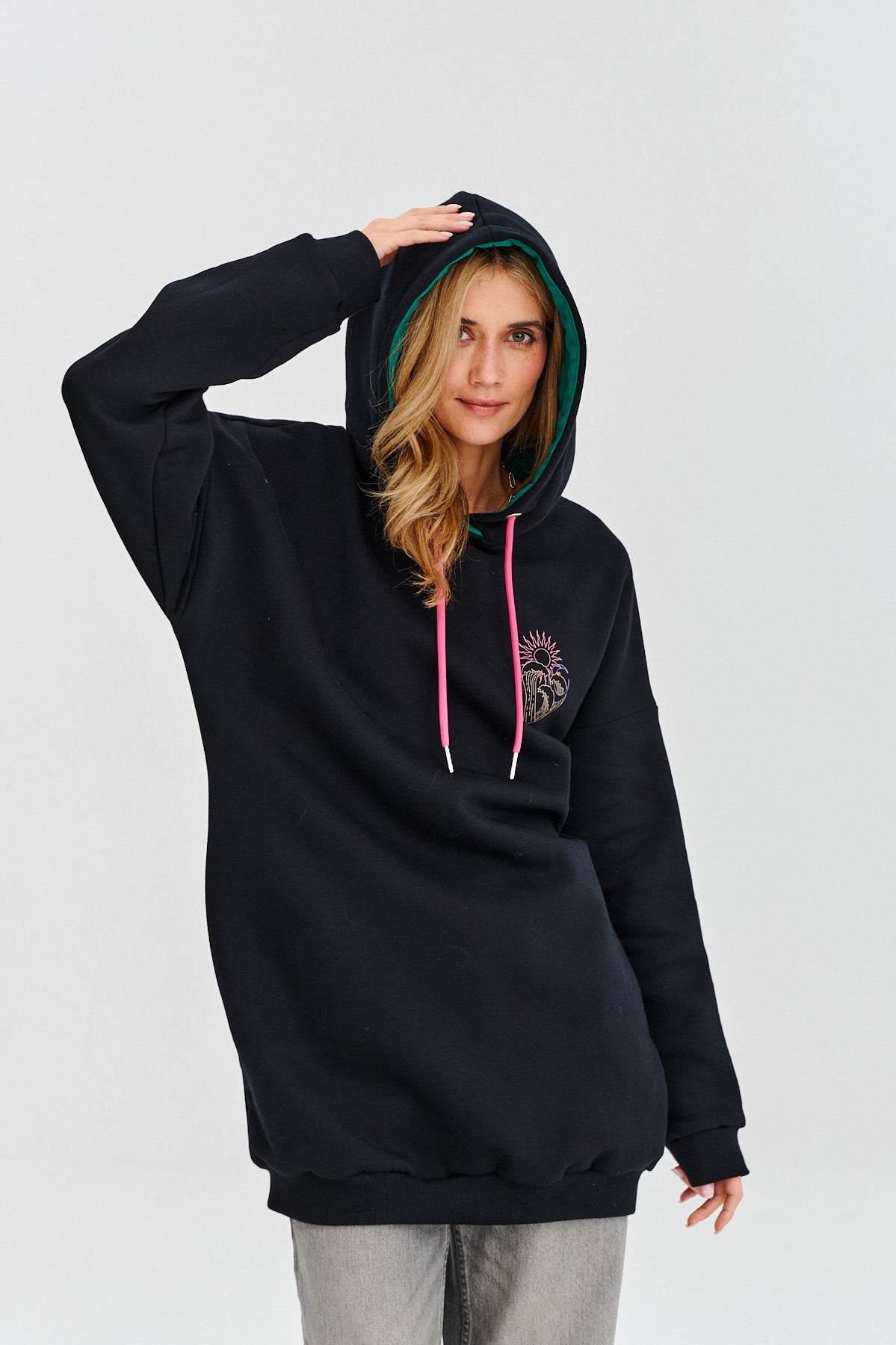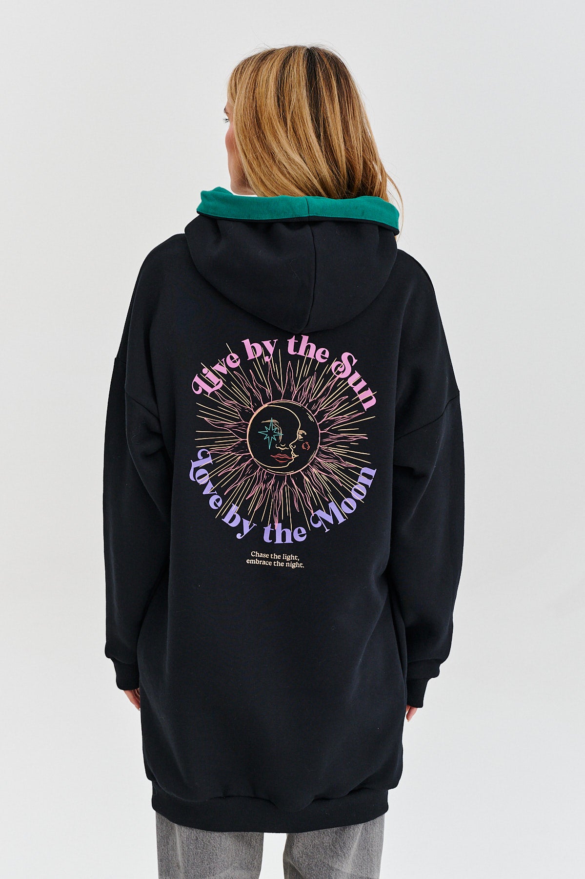 Dług bluza z kapturem Harmony to połączenie wygody i wyjątkowego designu, które wnosi do codziennych stylizacji odrobinę magii. Przedłużony krój otula i gwarantuje komfort podczas noszenia. Tył bluzy przyciąga uwagę inspirującym napisem „Live by the Sun, Love by the Moon”, otoczonym promienistym wzorem. Kaptur z butelkowym wnętrzem, wykończony został efektownym sznurkiem w fuksjowym kolorze z kontrastowymi końcówkami, które dodają nieoczywistego akcentu.