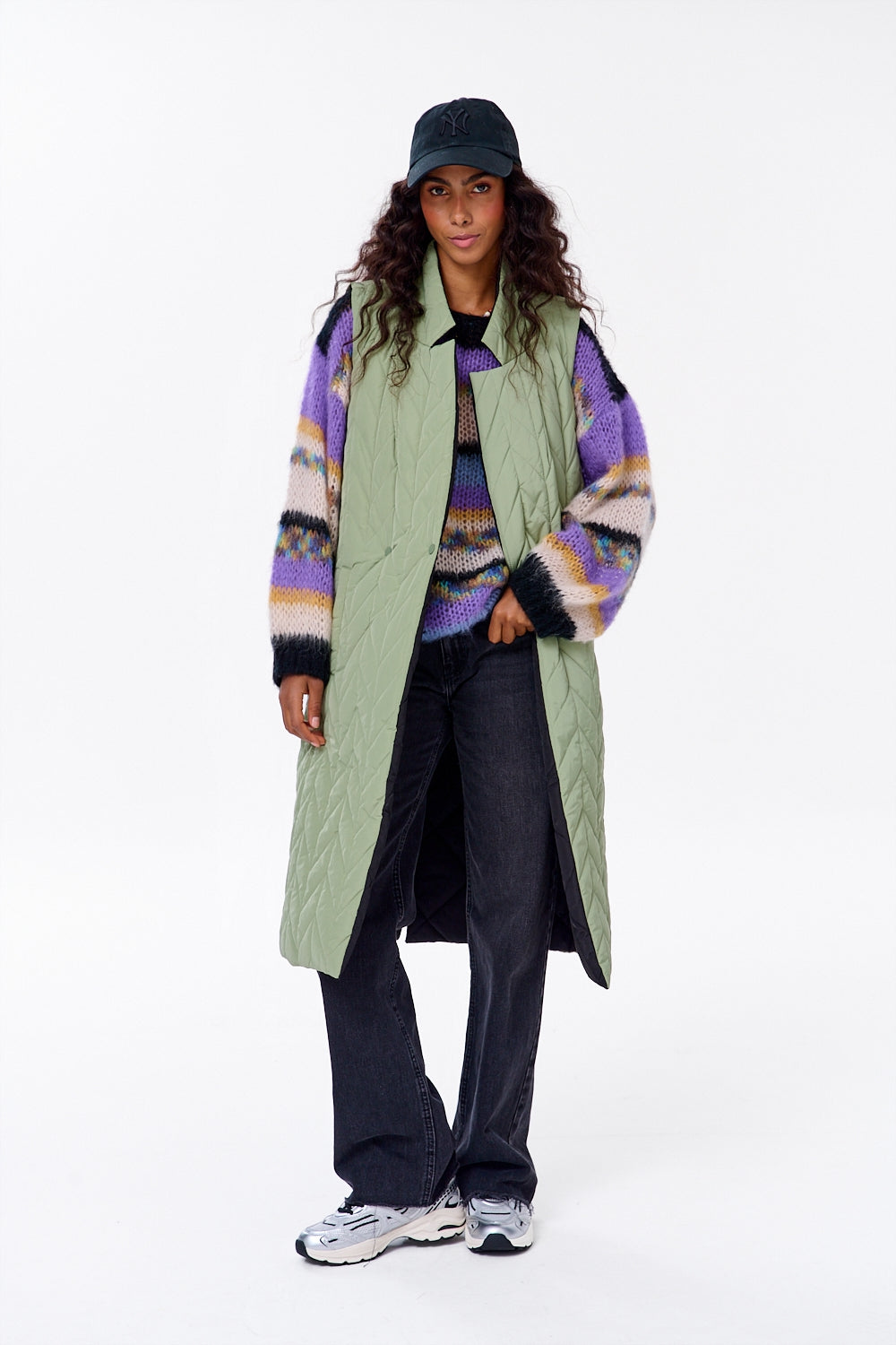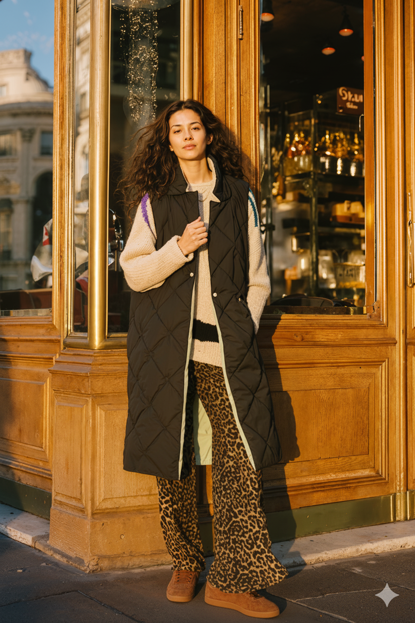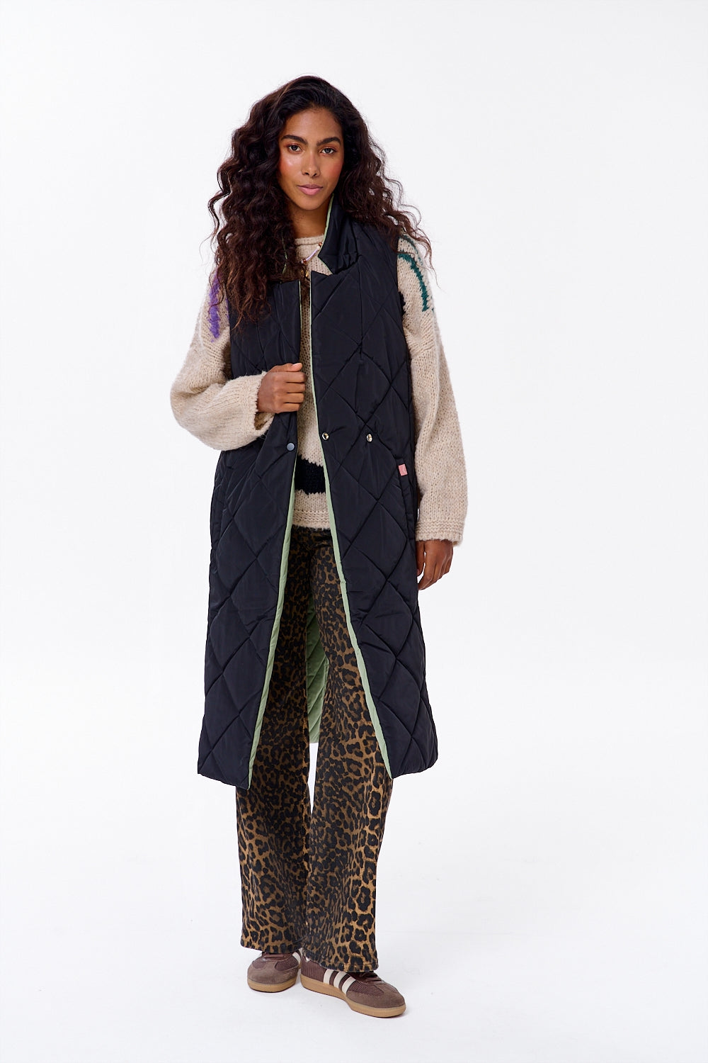 Długa kamizelka dwustronna Grove Walk to idealne połączenie praktyczności i nowoczesnego designu. Dzięki dwóm stronom – eleganckiej czerni oraz delikatnej, zgaszonej zieleni – możesz dopasować ją do swojego nastroju i okazji. To jak posiadanie dwóch stylowych kamizelek w jednej!