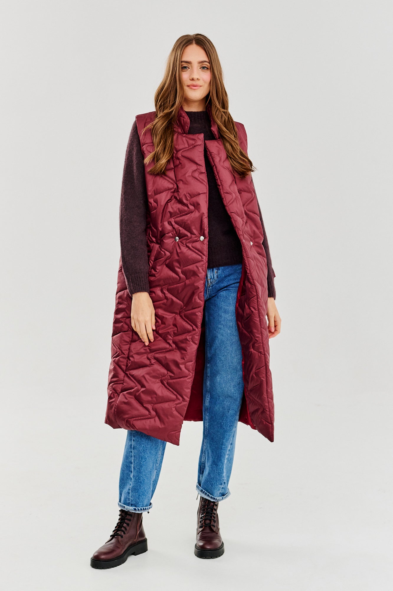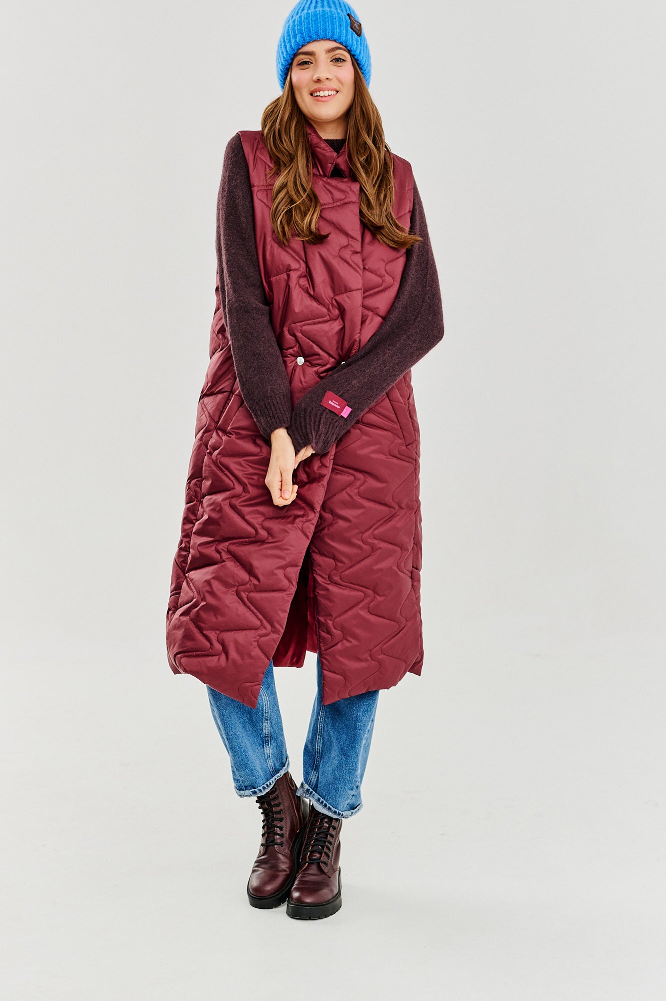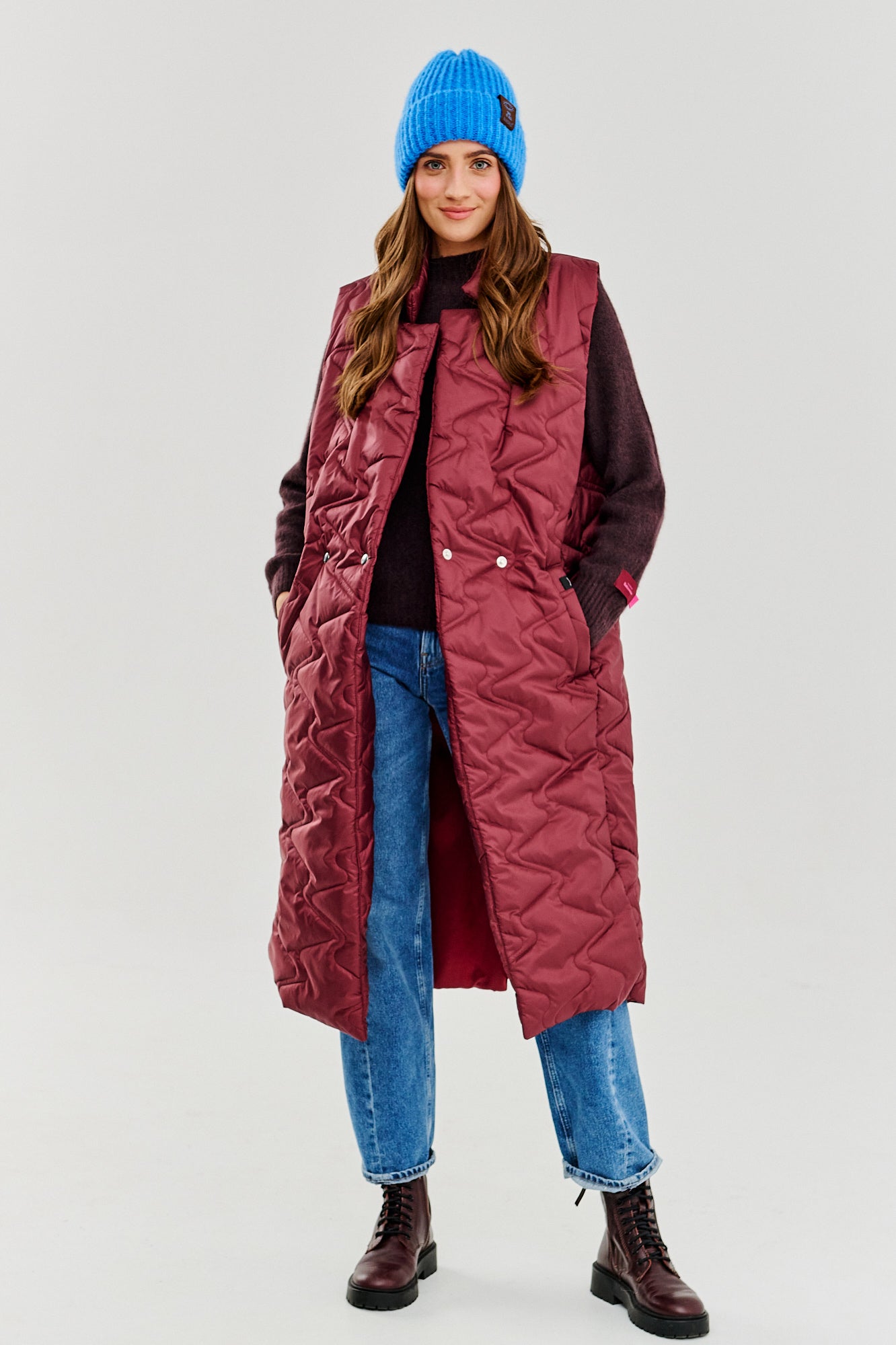 Długa kamizelka Maroon Dream ma ogromny potencjał stać się ulubionym ubraniem wierzchnim w Twojej szafie. Spełnia ona najbardziej wygórowane oczekiwania. Posiada długość midi, dzięki czemu doskonale grzeje i osłania przed wiatrem. Posiada napy, dzięki czemu gwarantuje szybkie i wygodne zapinanie.