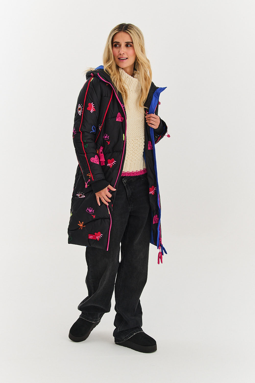 Czarna baza płaszcza jest idealnym tłem dla energetycznych serc, oczu i symboli. Luźny krój z lekko nietoperzowymi rękawami zapewnia pełną swobodę ruchów. Ciepłe wypełnienie, wysoki kołnierz i obszerny kaptur z niebieską podszewką to gwarancja komfortu w najzimniejsze dni.