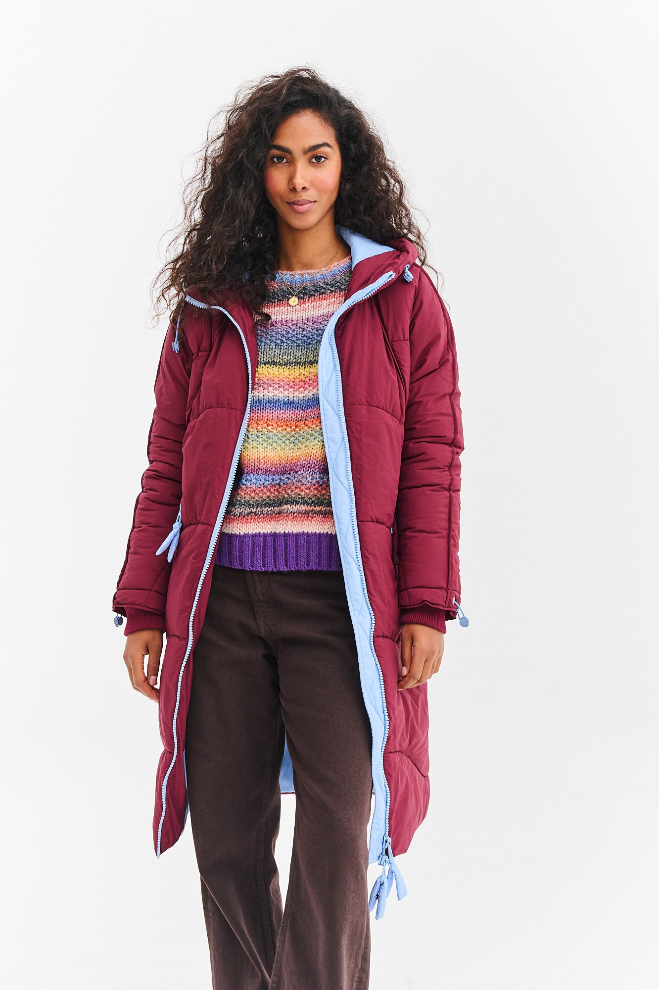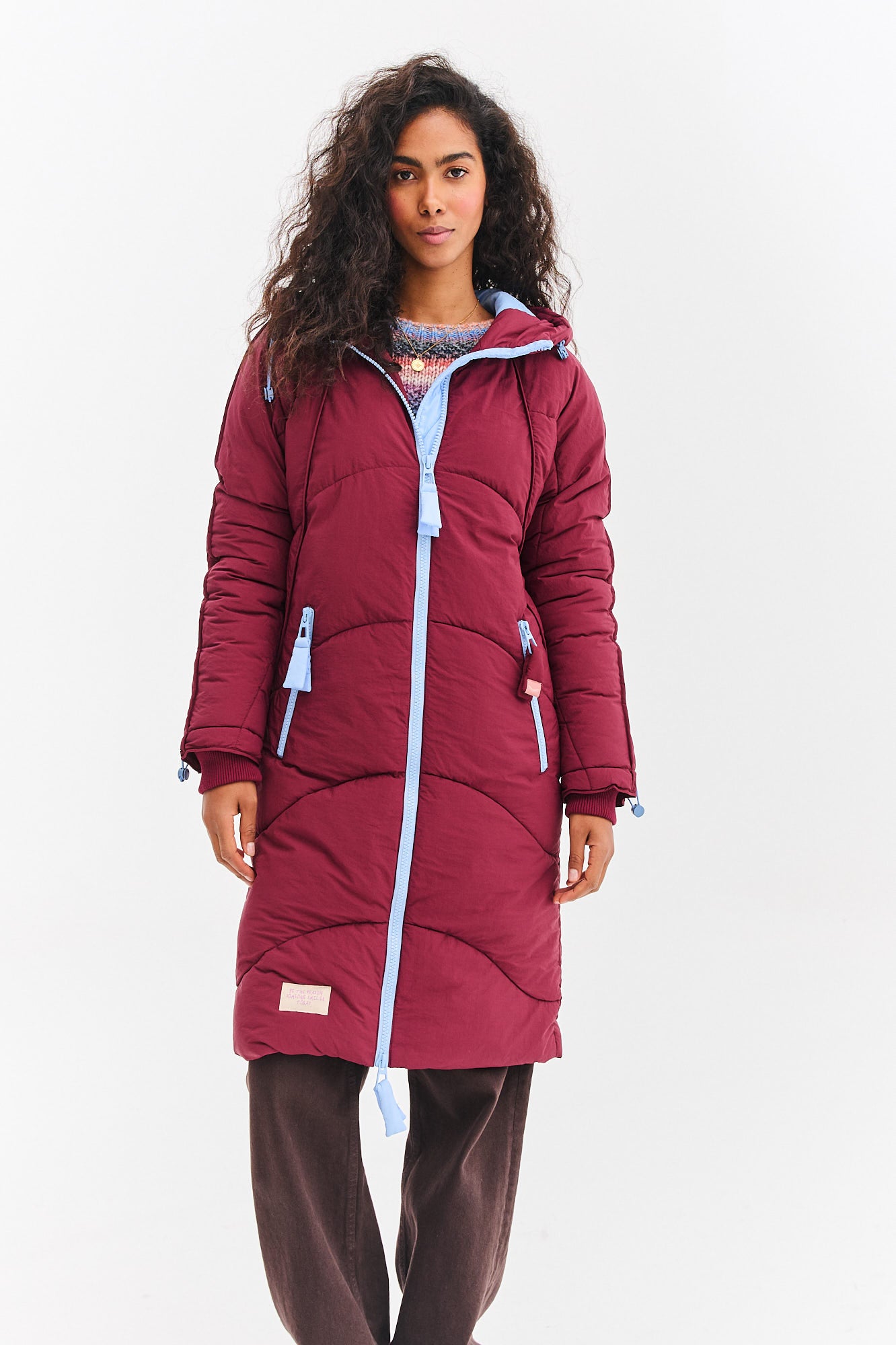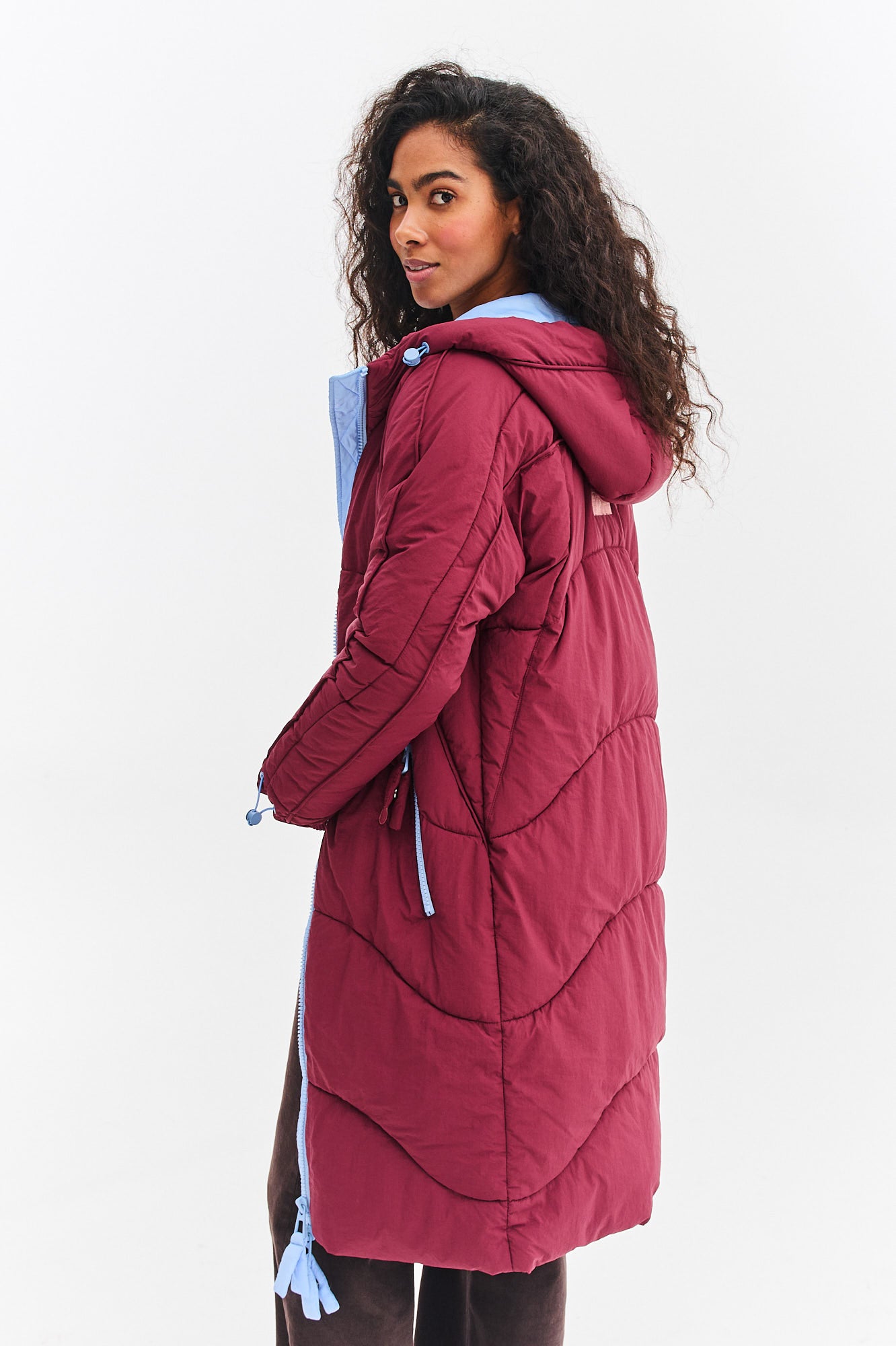 Długa kurtka zimowa Montreal Skyline Rouge łączy w sobie elegancję i sportowy luz. Jej głęboki, bordowy kolor jest niezwykle twarzowy, a jasnoniebieska podszewka kaptura stanowi ciekawy, kontrastowy detal. Delikatne, faliste pikowanie dodaje jej lekkości i kobiecego charakteru.