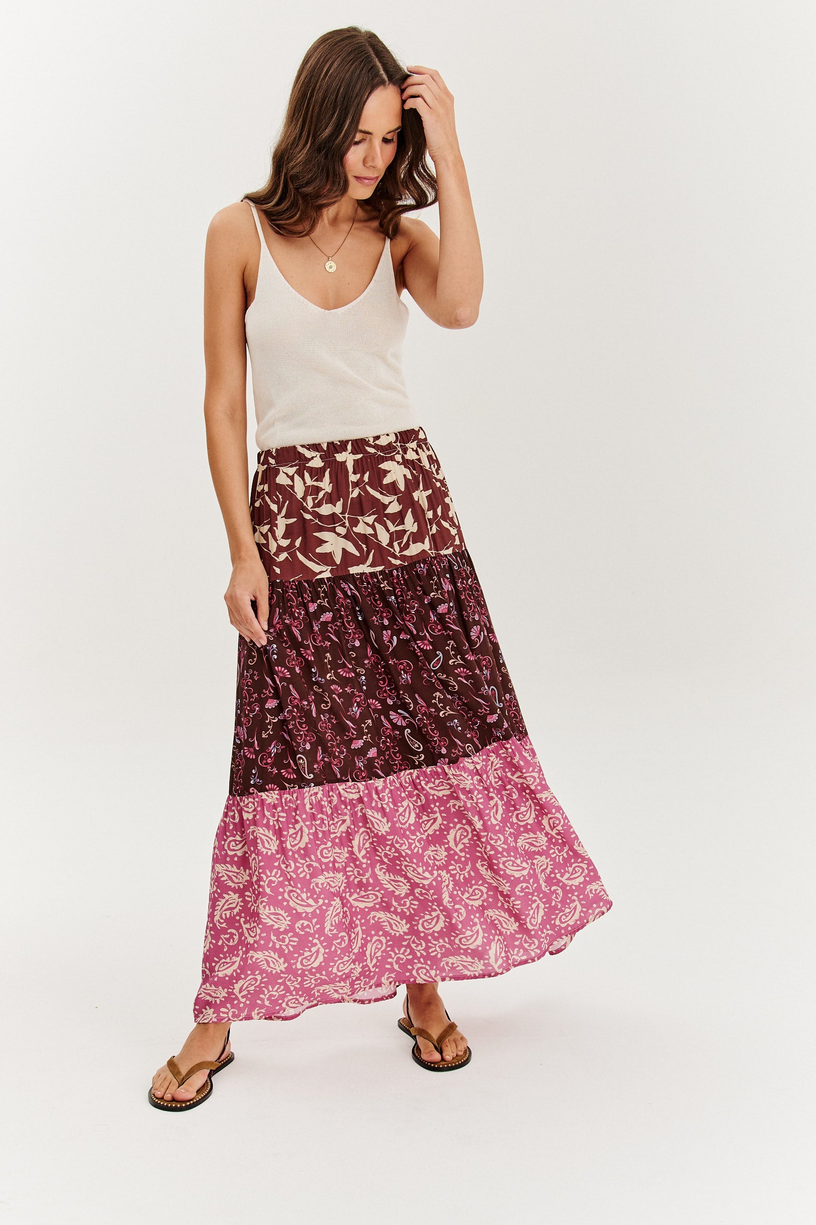 Długa spódnica Blossom Zen to kwintesencja boho stylu z nutą romantyzmu. Wykonana z lekkiej, przewiewnej wiskozy, zachwyca warstwowym fasonem i efektownymi falbanami, które nadają sylwetce lekkości i swobody. Kompozycja trzech różnych printów – od motywów florystycznych po subtelne paisley – tworzy harmonijną całość pełną naturalnego uroku.