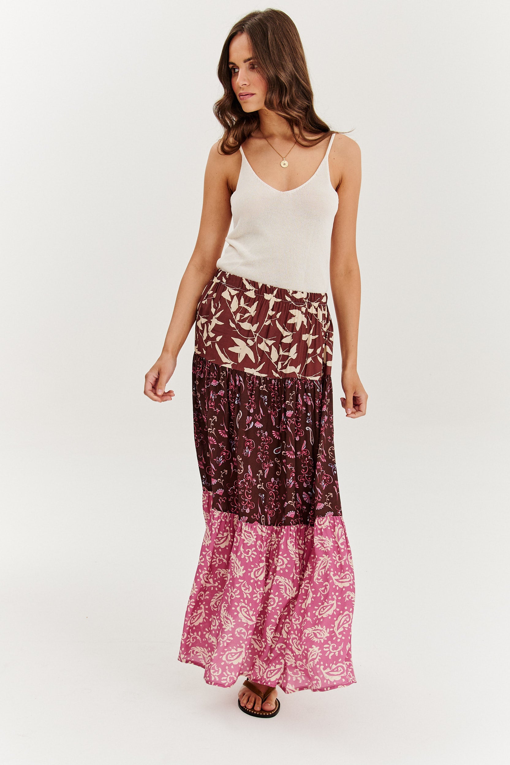 Długa spódnica Blossom Zen to kwintesencja boho stylu z nutą romantyzmu. Wykonana z lekkiej, przewiewnej wiskozy, zachwyca warstwowym fasonem i efektownymi falbanami, które nadają sylwetce lekkości i swobody. Kompozycja trzech różnych printów – od motywów florystycznych po subtelne paisley – tworzy harmonijną całość pełną naturalnego uroku.