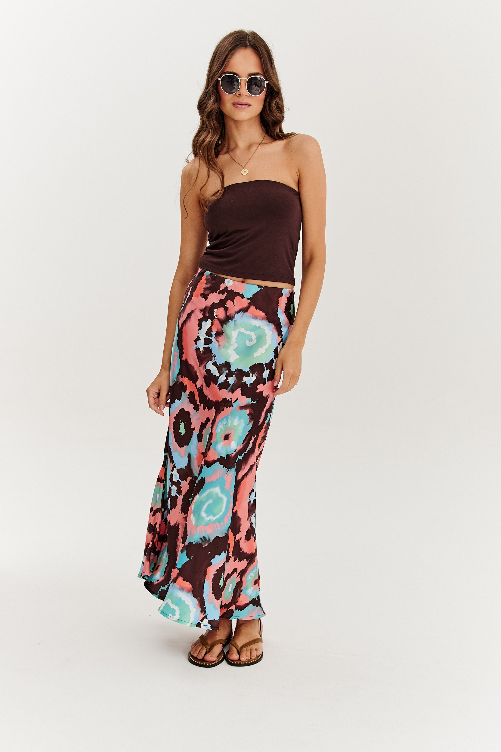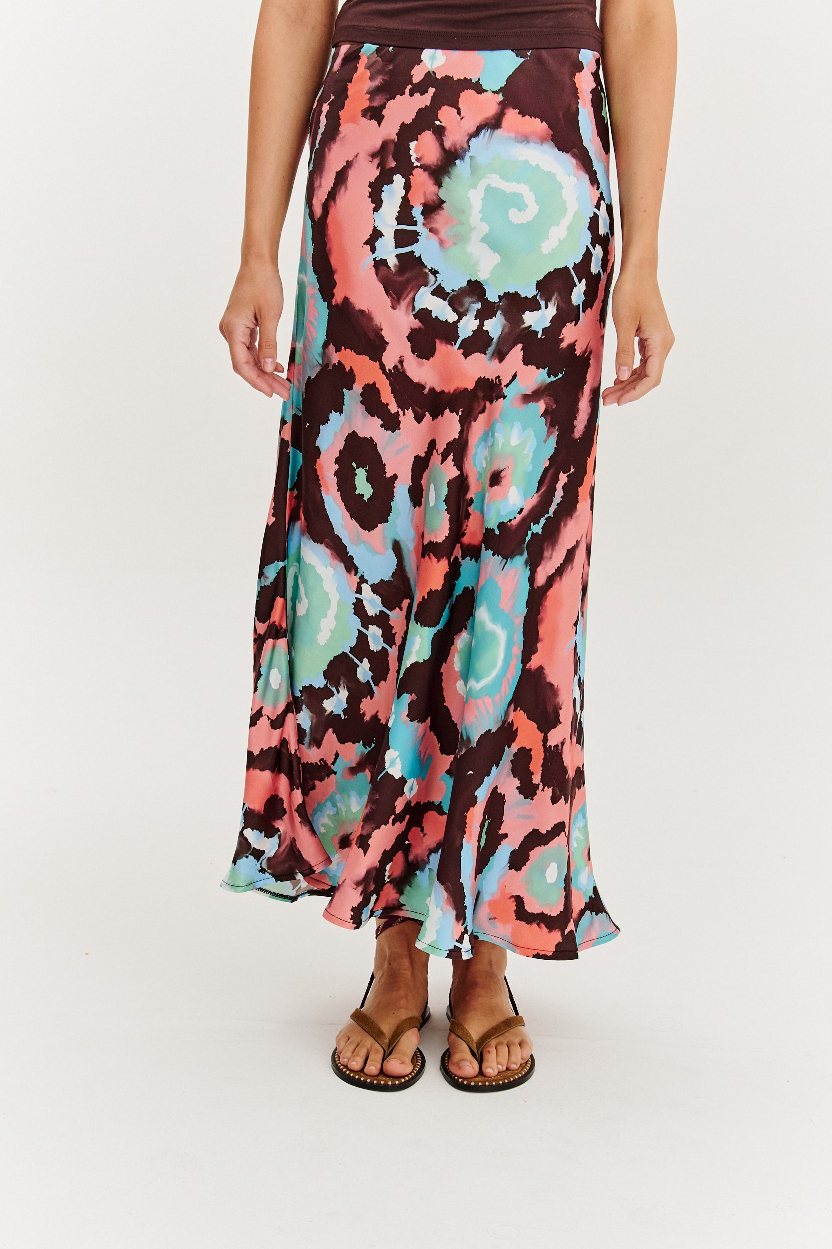 Długa spódnica Boho Storm to odważna propozycja dla miłośniczek sztuki wyrażania siebie. Materiał o intensywnym, tie-dye'owym princie w odcieniach turkusu, różu i brązu tworzy unikalny efekt, który przyciąga wzrok i budzi wyobraźnię.