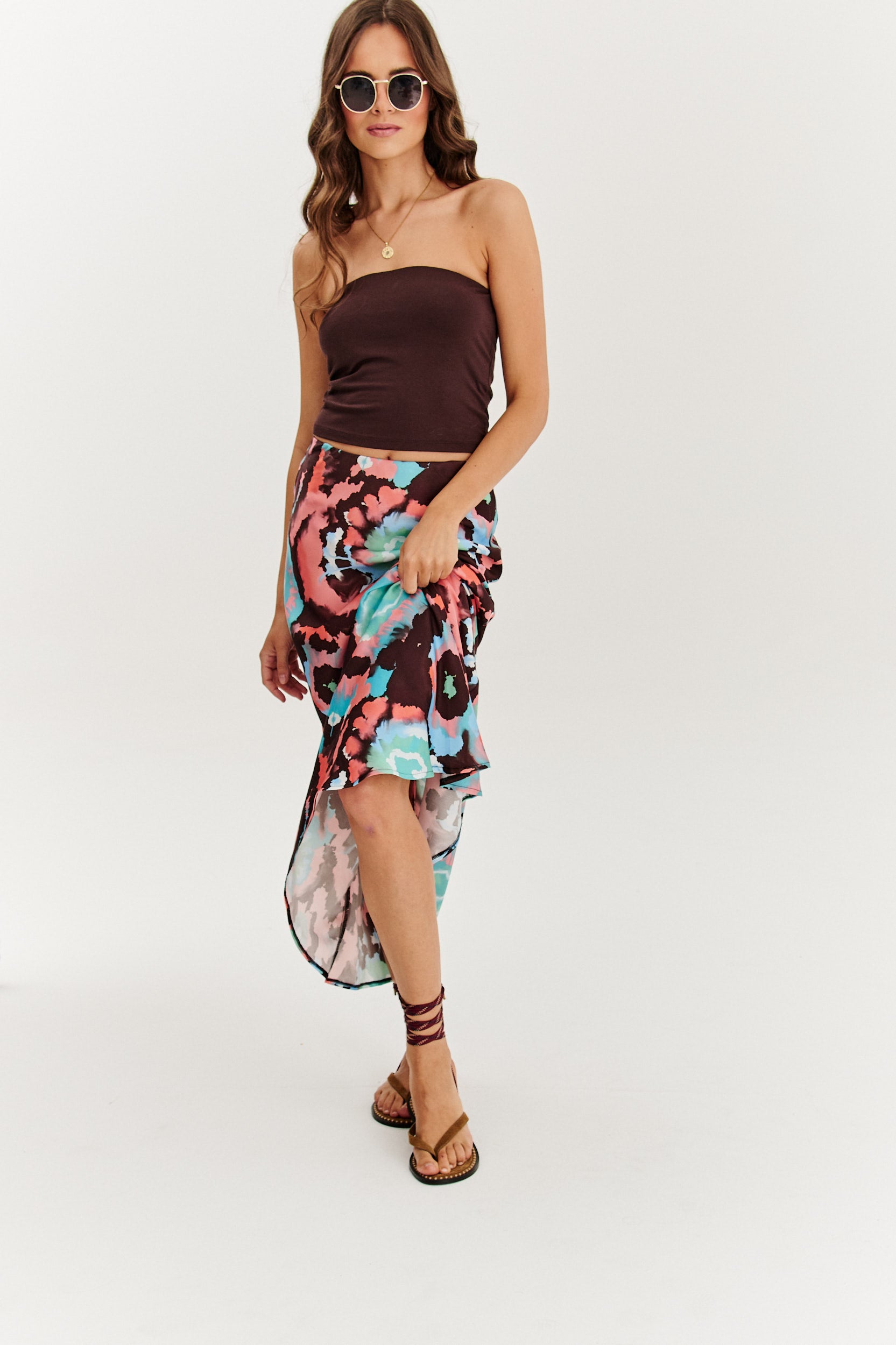Długa spódnica Boho Storm to odważna propozycja dla miłośniczek sztuki wyrażania siebie. Materiał o intensywnym, tie-dye'owym princie w odcieniach turkusu, różu i brązu tworzy unikalny efekt, który przyciąga wzrok i budzi wyobraźnię.