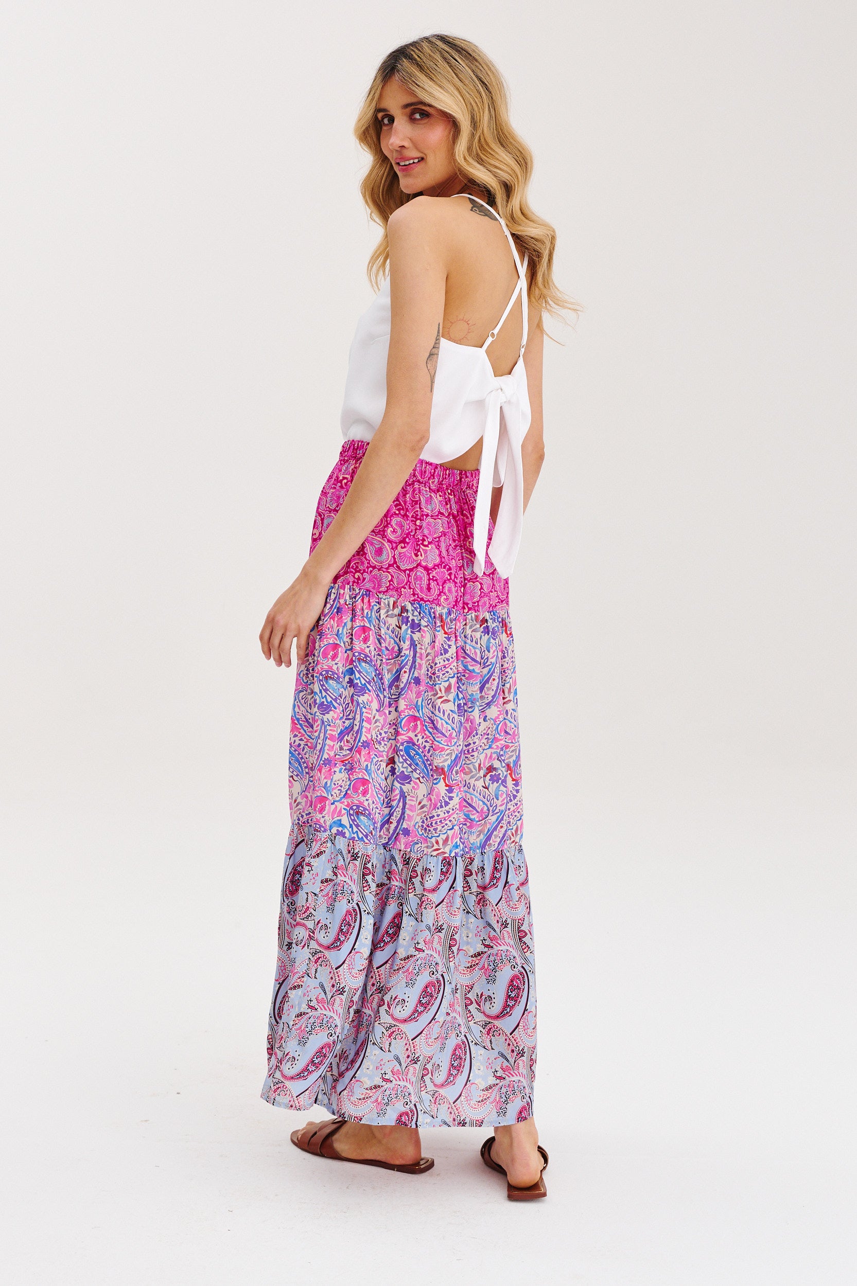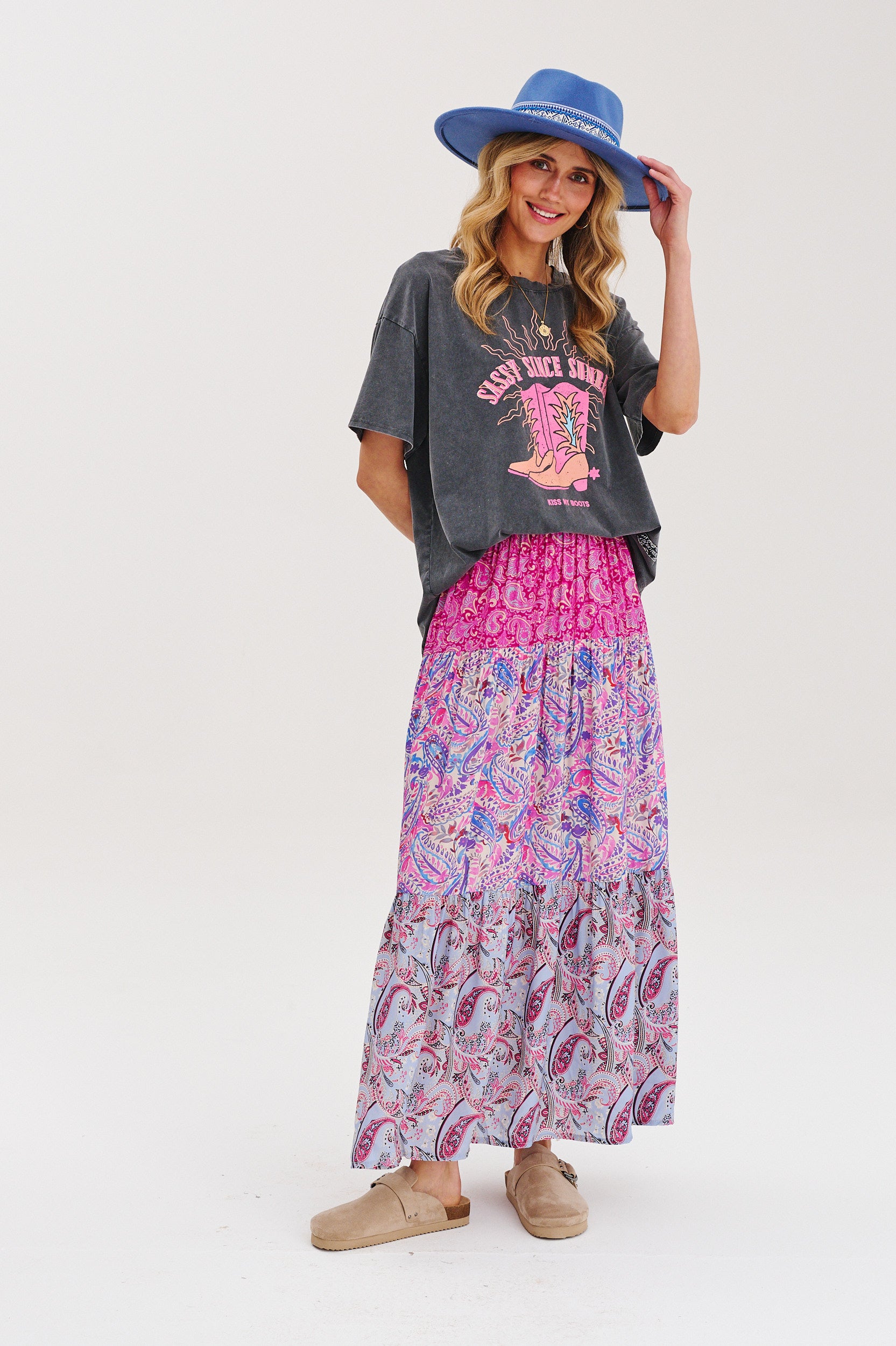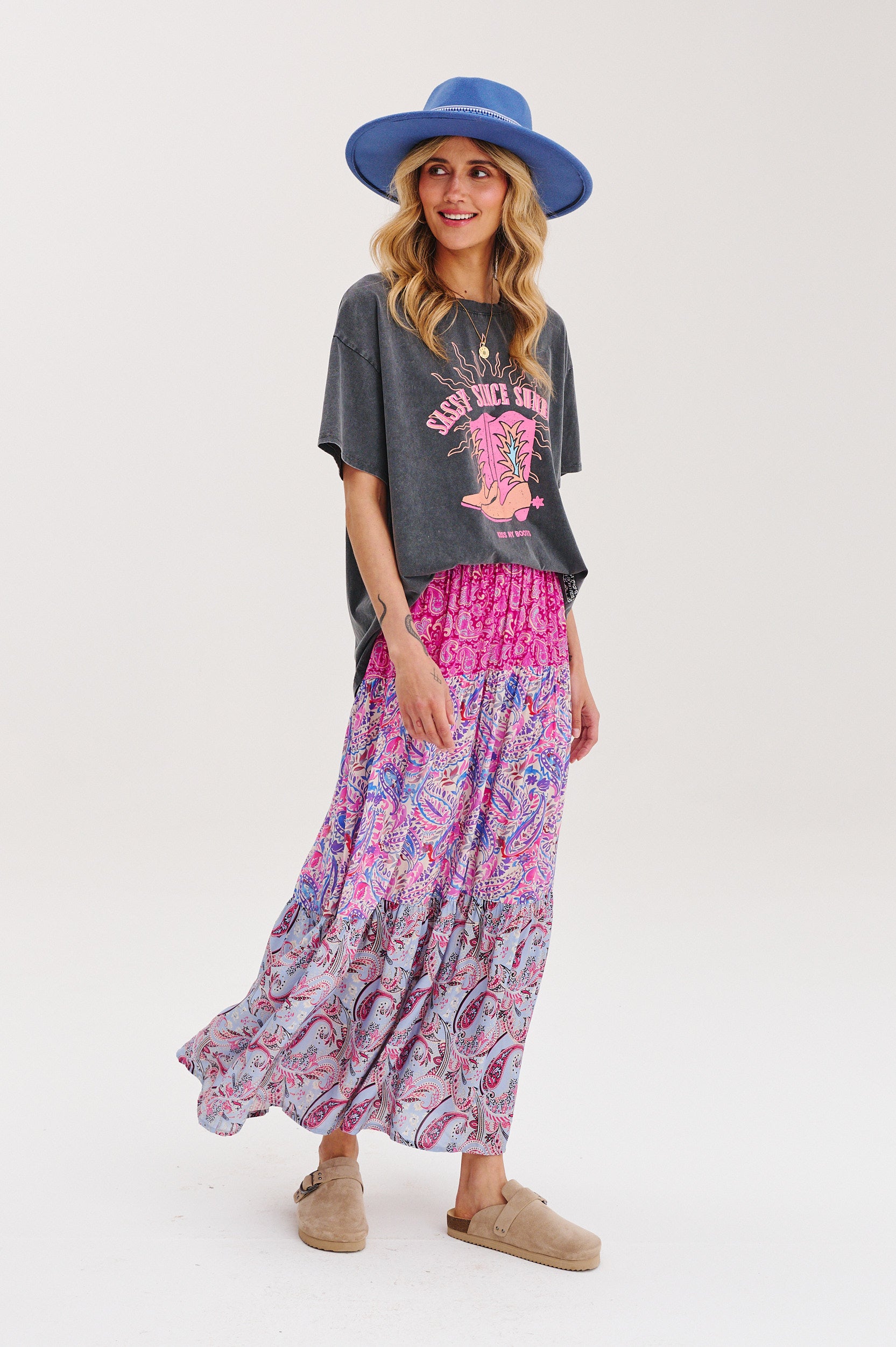 Długa spódnica Dusty Valley to eksplozja barw zamknięta w eterycznym, boho kroju. Trzy kontrastujące pasy z motywami paisley w odcieniach różu, błękitu i fioletu tworzą wzór, który przyciąga wzrok i przenosi myślami w doliny pełne kurzu, kolorów i magii. Wykonana z przyjemnej wiskozowej tkaniny, pięknie faluje przy każdym ruchu.
