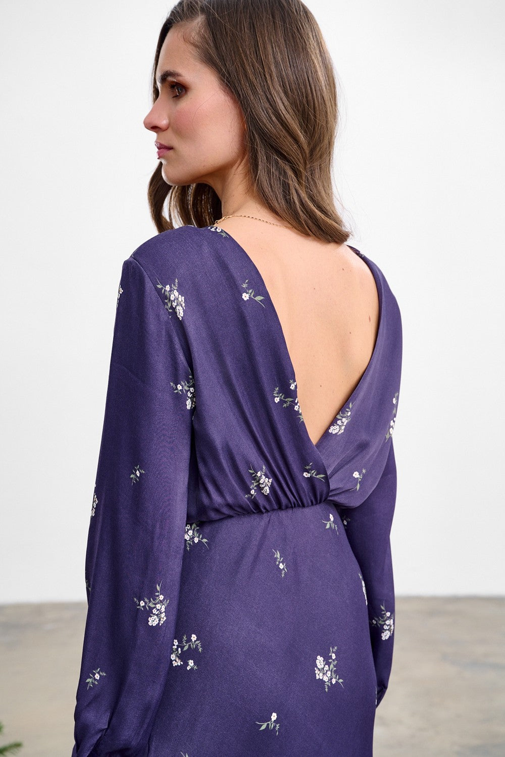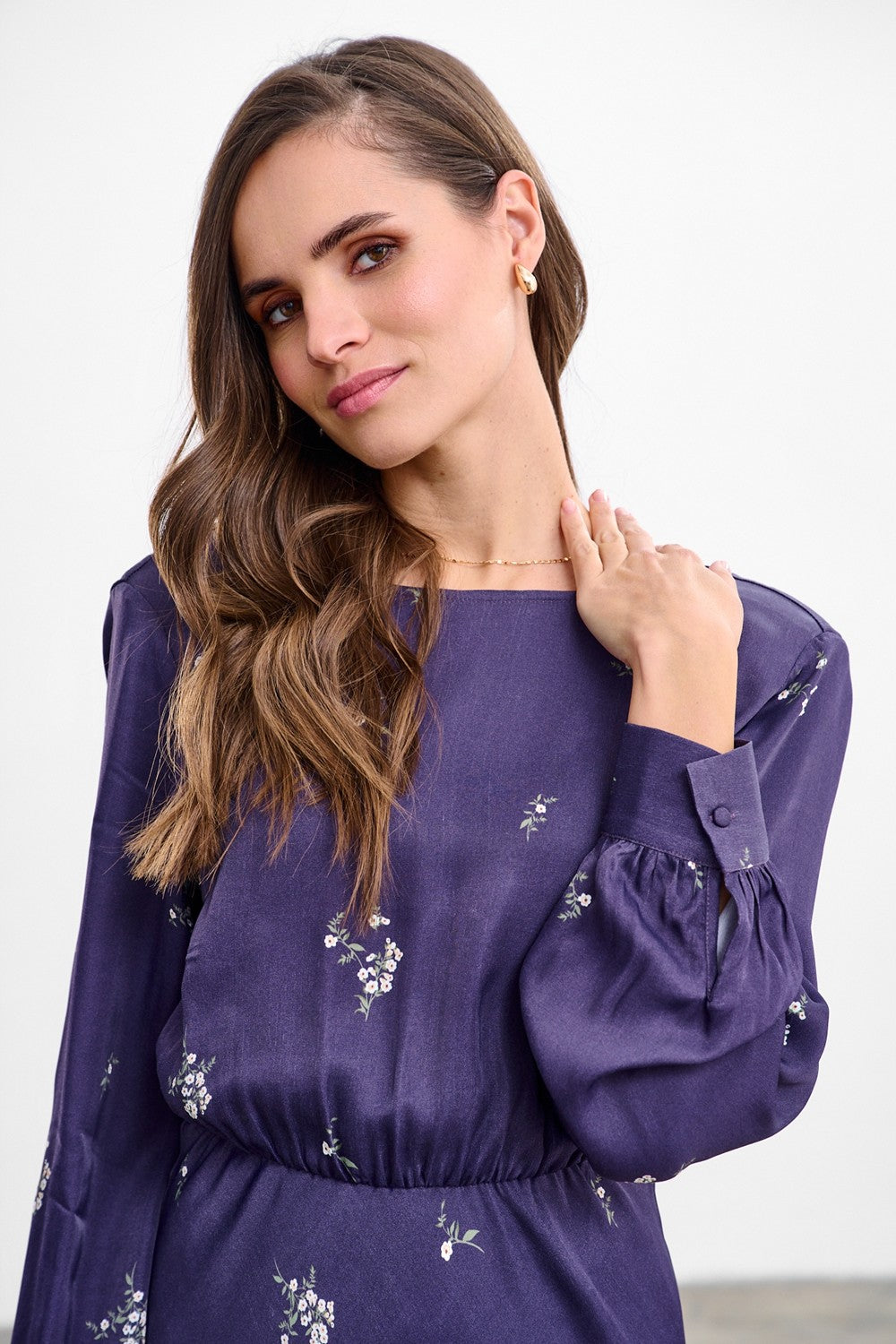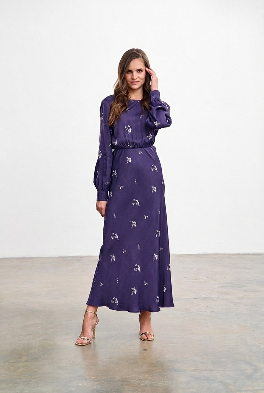 Długa sukienka After Dark to kreacja, która intryguje. Ciemna tkanina jest tłem dla subtelnych, jasnych kwiatów, tworzących romantyczny kontrast. Wiązanie w pasie idealnie podkreśla talię, a kopertowy dekolt dodaje szyku. Długie rękawy zakończone mankietem sprawiają, że sukienka świetnie sprawdzi się w chłodniejsze dni.