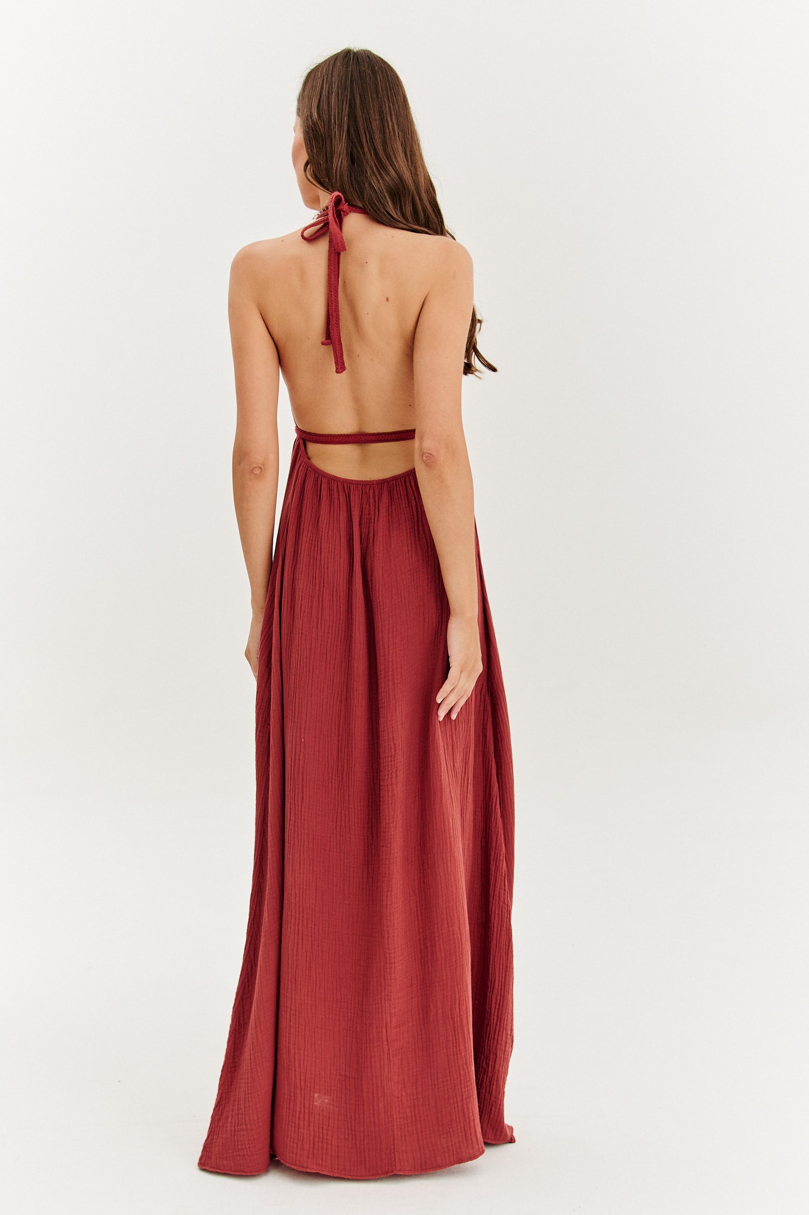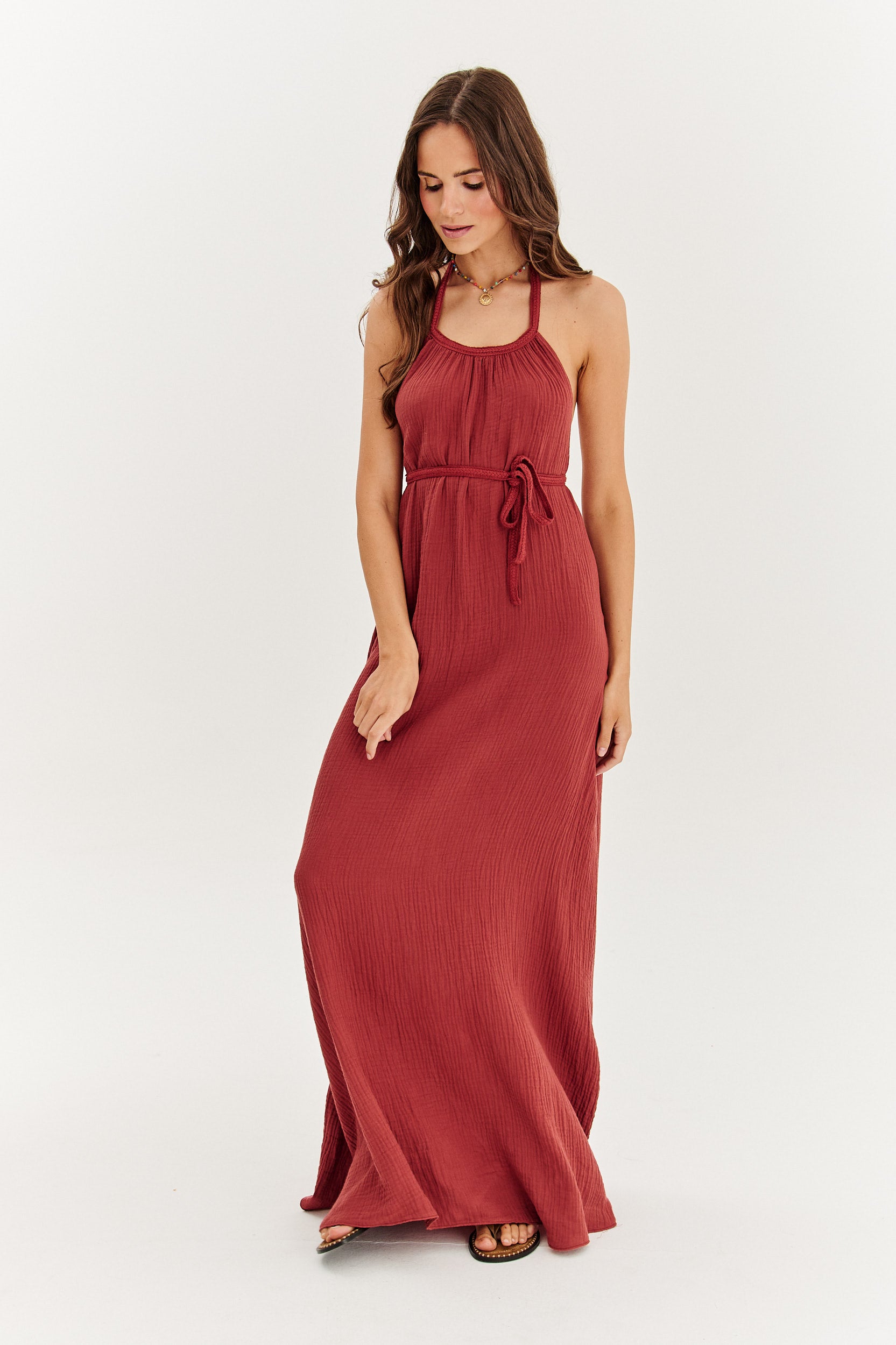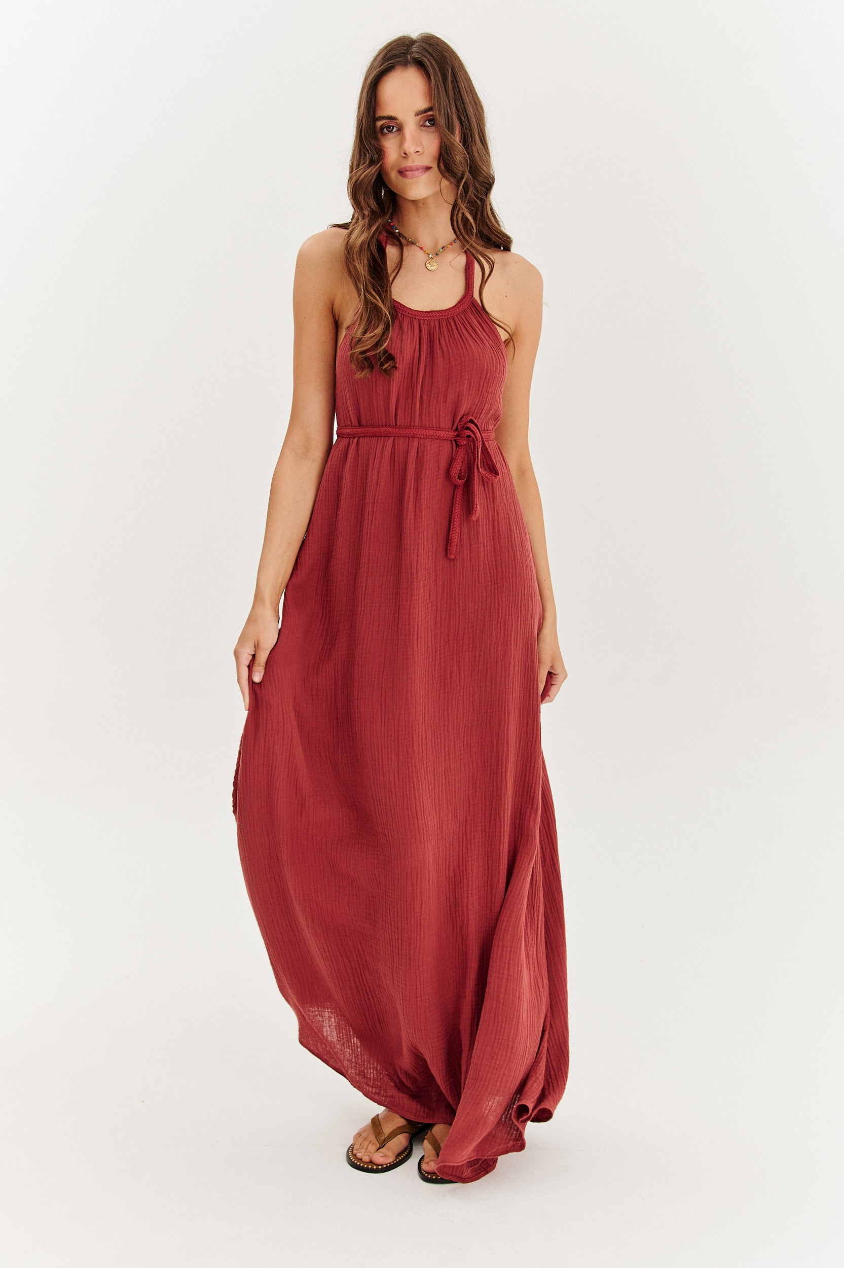 Długa sukienka muślinowa Driftwood to esencja letniej lekkości i naturalnego stylu. Uszyta w 100% z przewiewnej bawełny muślinowej w odcieniu ciepłego różu, zachwyca prostotą kroju z wiązaniem na szyi oraz ozdobnym plecionym paskiem, który podkreśla talię.