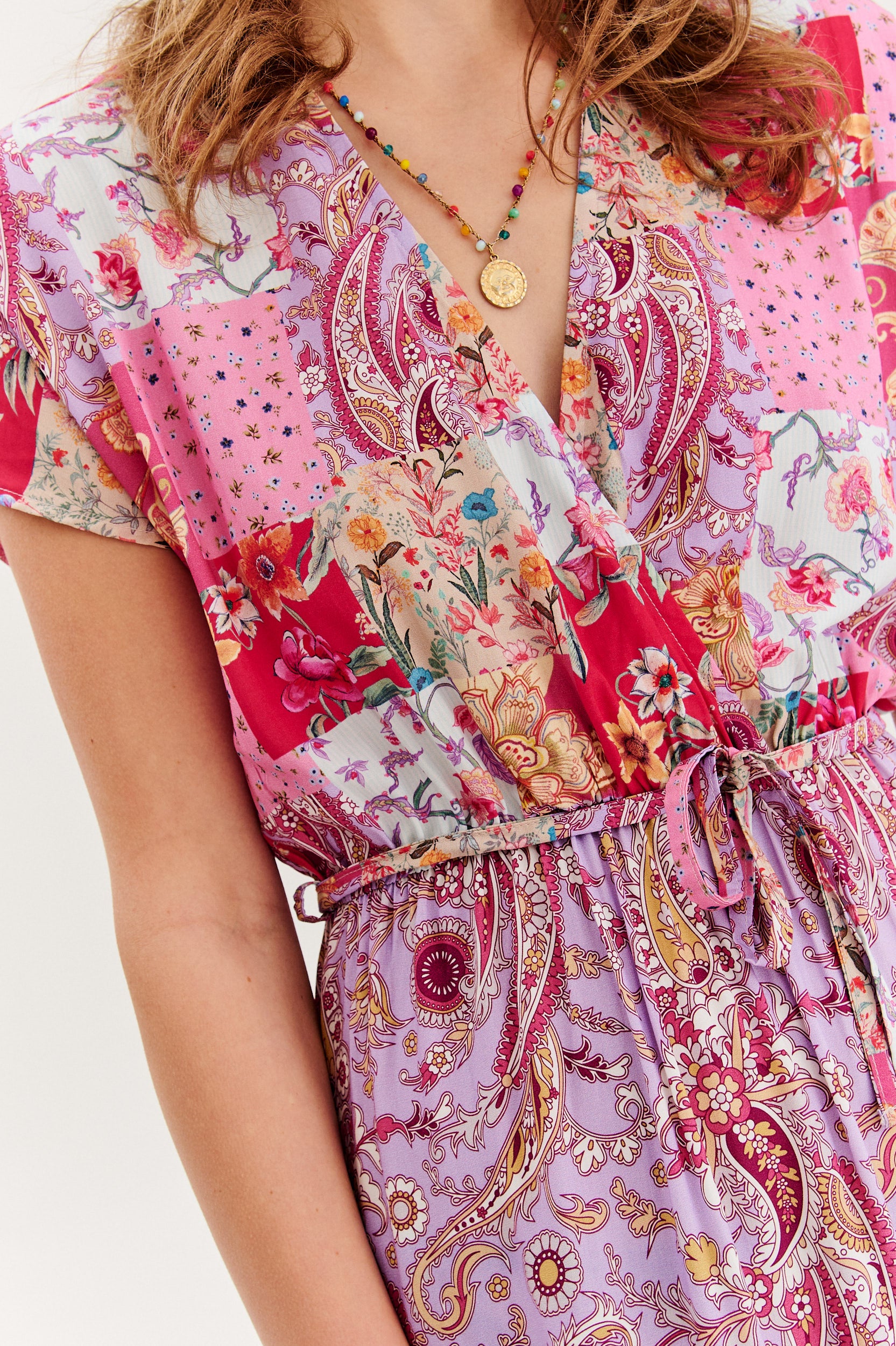 Długa sukienka Riviera Boogie to ukłon w stronę boho estetyki i letniego luzu. Uszyta z matowej wiskozy, zachwyca wzorzystą mozaiką w odcieniach różu, fioletu i złamanej bieli. Z kopertowym dekoltem, lekko kimono rękawem i wiązanym paskiem podkreślającym talię, jest wygodna, ale pełna charakteru.