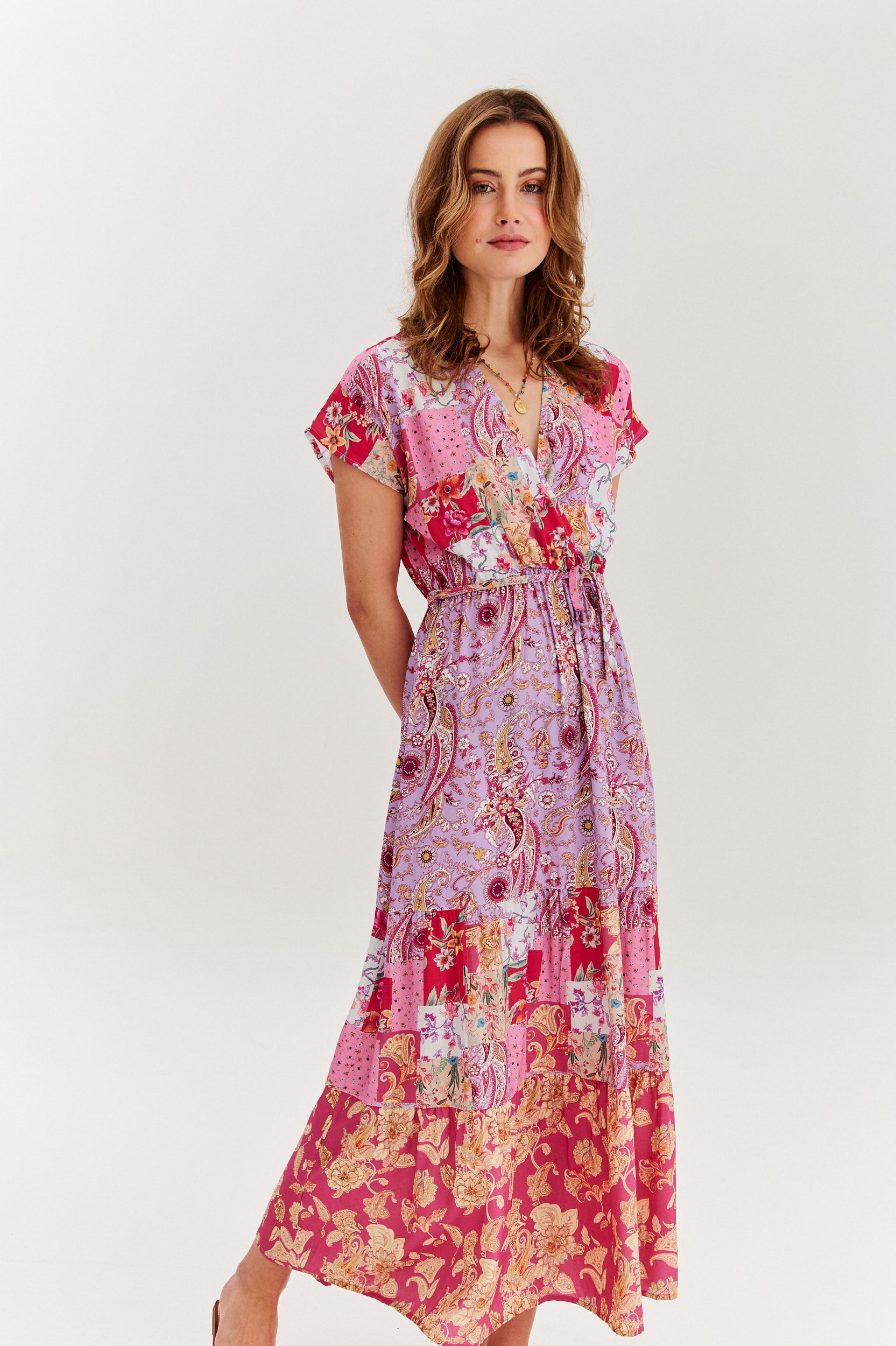 Długa sukienka Riviera Boogie to ukłon w stronę boho estetyki i letniego luzu. Uszyta z matowej wiskozy, zachwyca wzorzystą mozaiką w odcieniach różu, fioletu i złamanej bieli. Z kopertowym dekoltem, lekko kimono rękawem i wiązanym paskiem podkreślającym talię, jest wygodna, ale pełna charakteru.