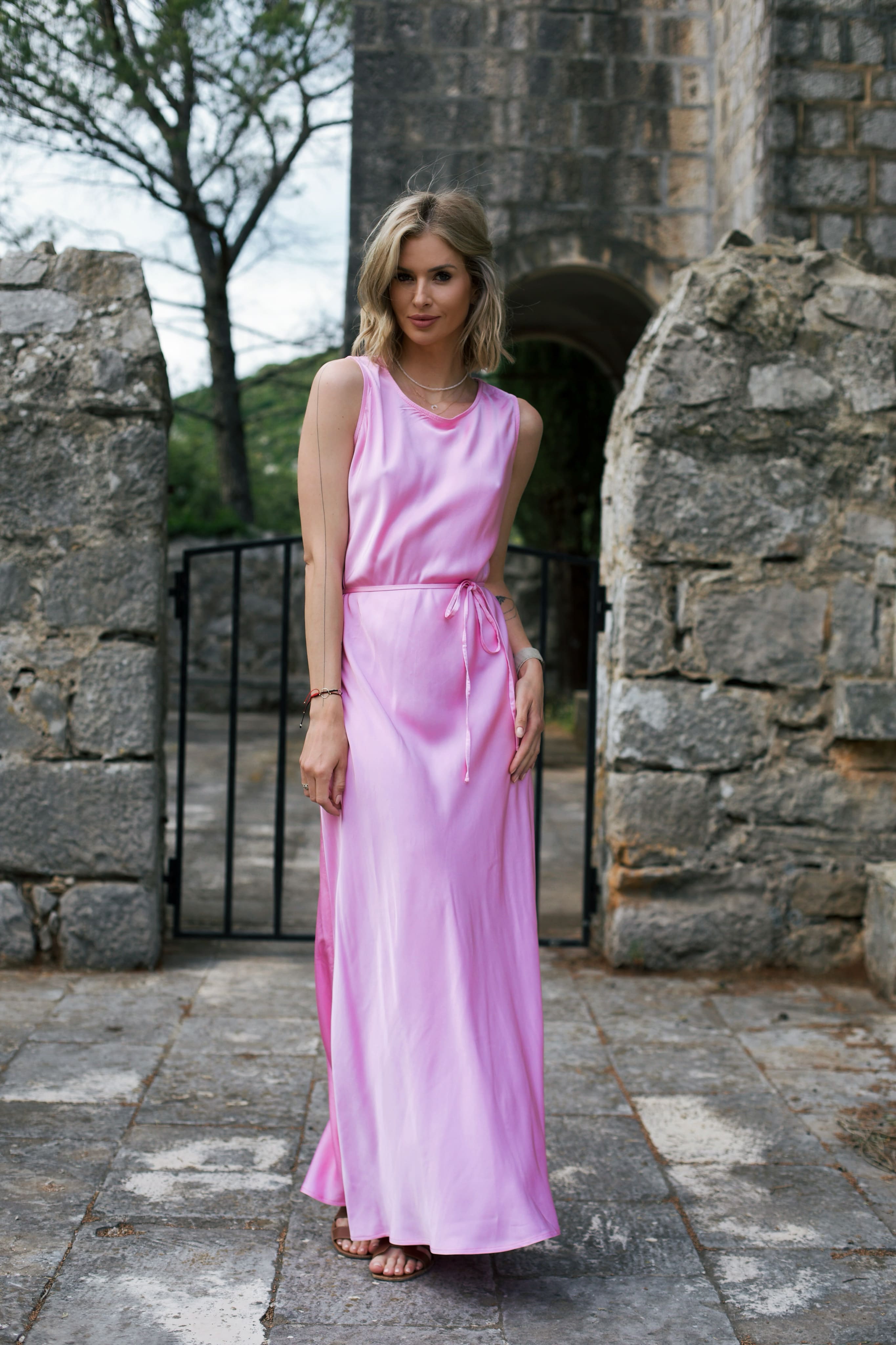 Długa sukienka Rosa Riviera to kwintesencja letniej subtelności. Jej delikatny, różowy odcień w połączeniu z prostą, ale kobiecą formą tworzy efekt lekkości i swobody. Wiązanie w talii nadaje sylwetce proporcji, a miękko układający się materiał zapewnia wygodę przez cały dzień – od porannego spaceru po kolację przy zachodzie słońca.