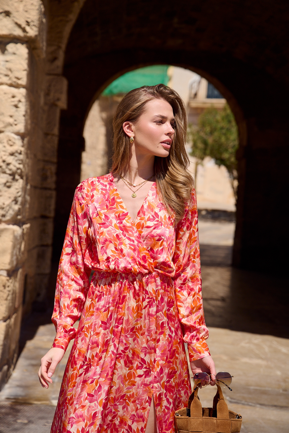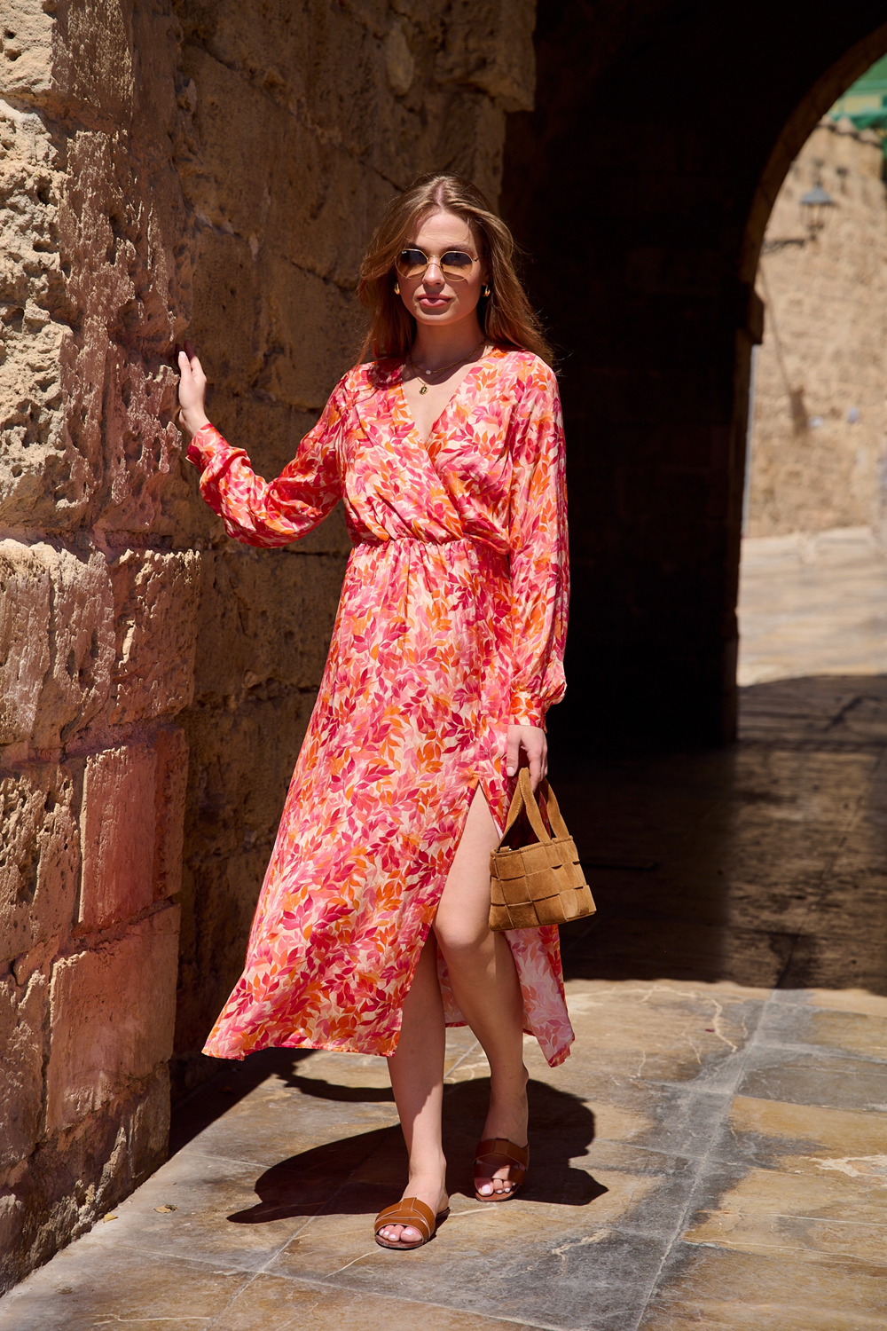 Długa sukienka taliowana Marigold Kiss – kwintesencja kobiecej energii i wiosennego rozkwitu. Zaprojektowana z myślą o tych, które kochają kolory i nie boją się wyróżniać. Jej ognisty print w odcieniach różu, pomarańczy i koralu przyciąga spojrzenia i podkreśla kobiecość.