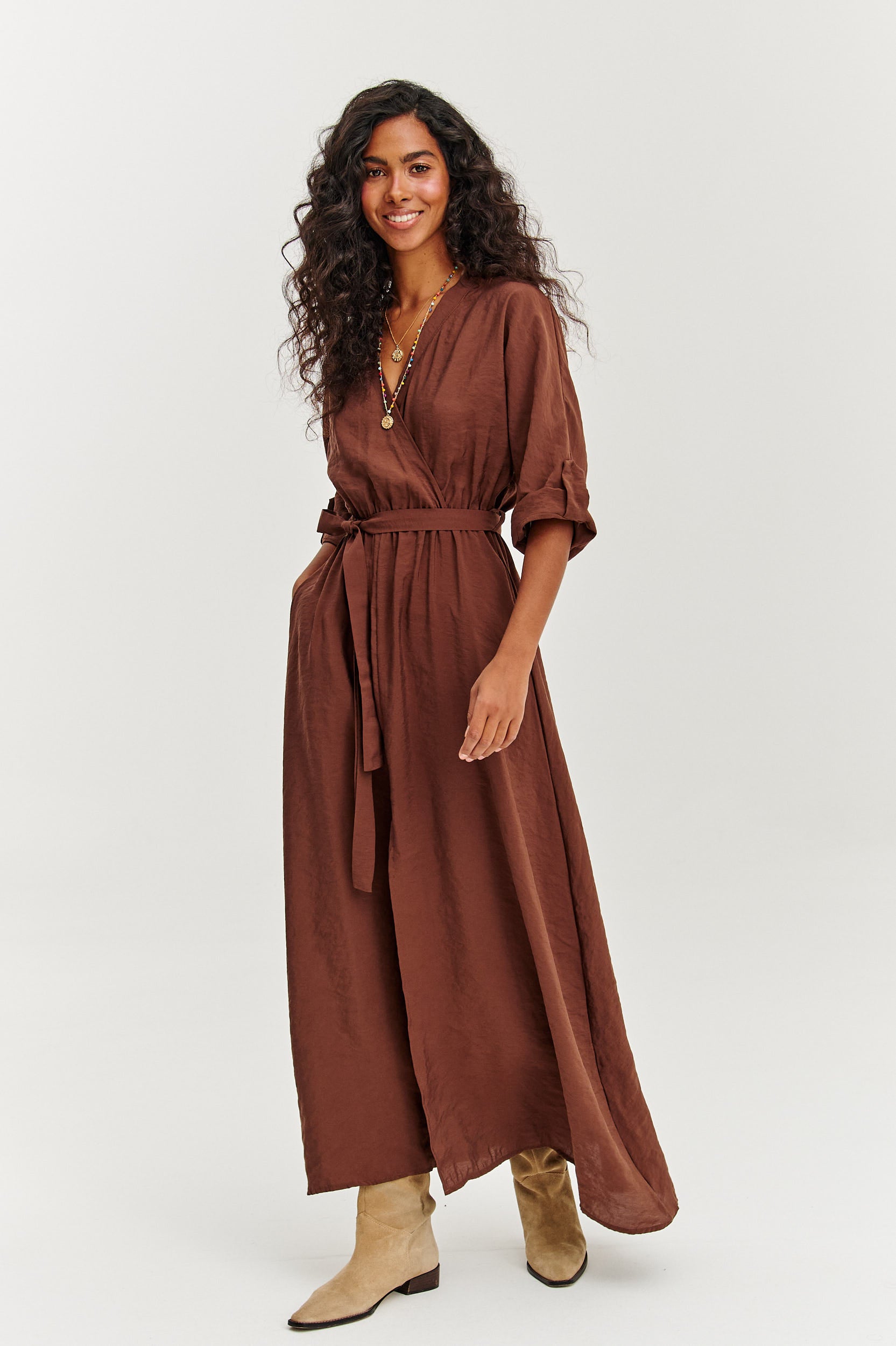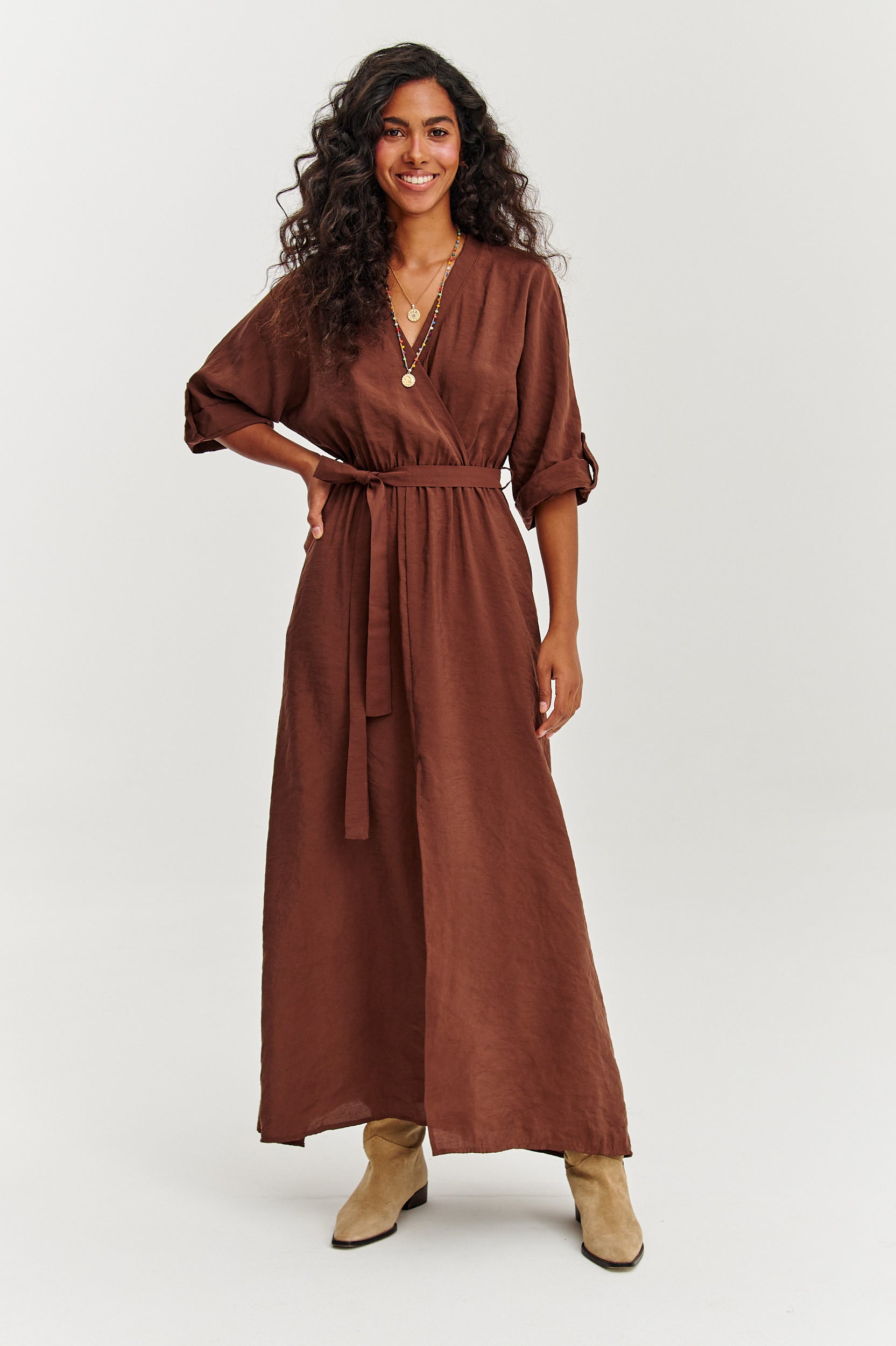 Długa sukienka z wiązaniem Earth Dancer to hołd dla kobiecej siły i naturalnej elegancji. Jej głęboki, ziemisty odcień przywołuje skojarzenia z wolnością i harmonią, a wygodny krój z kopertowym dekoltem oraz wiązaniem w talii pięknie podkreśla sylwetkę.