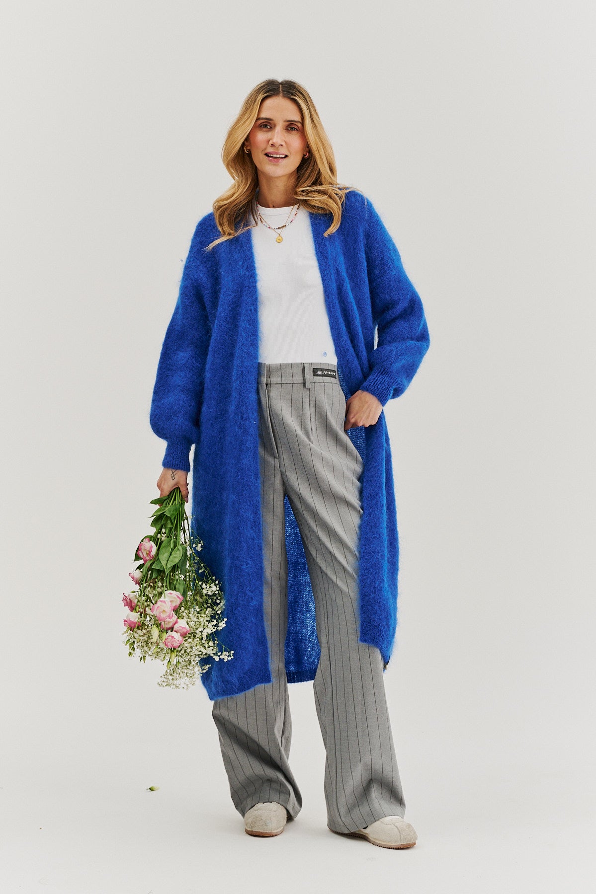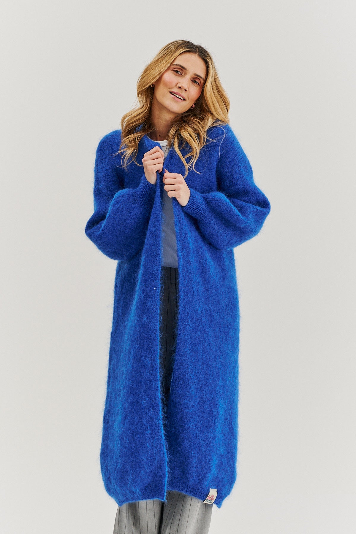Długi kardigan moherowy Sweet Mirage to esencja komfortu i elegancji w jednym. Wykonany z delikatnej moherowej przędzy, zachwyca swoją miękkością. Intensywny, niebieski kolor dodaje mu wyjątkowego charakteru, przyciągając uwagę i idealnie wpisując się w zimowe krajobrazy. Luźny fason oraz długie rękawy sprawiają, że kardigan jest idealnym wyborem na chłodniejsze dni – zarówno do noszenia na co dzień, jak i na bardziej wyjątkowe okazje.