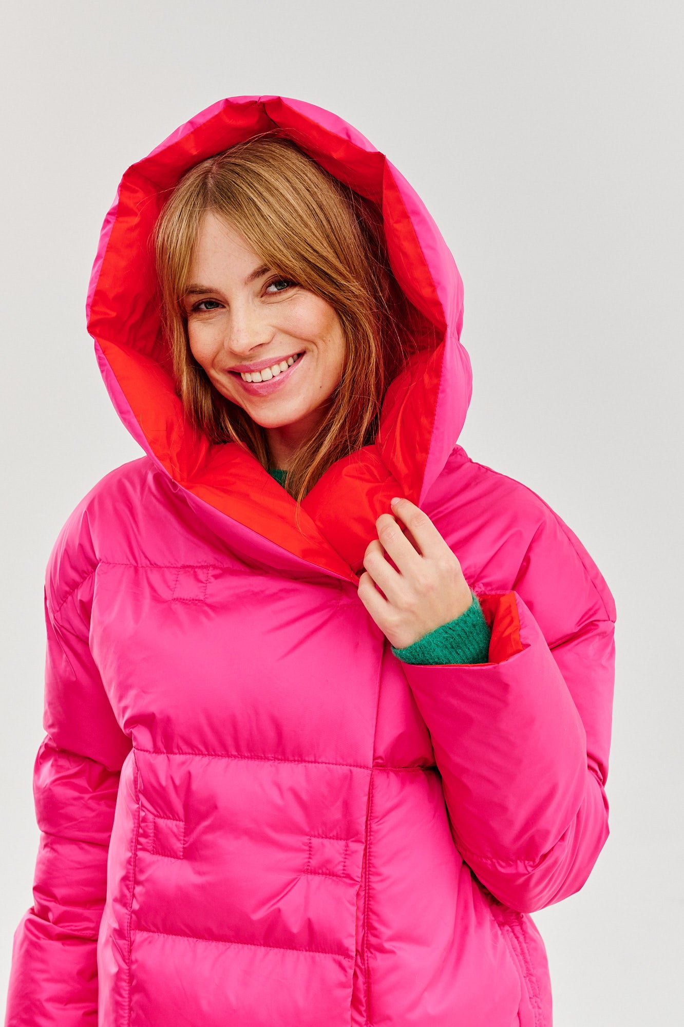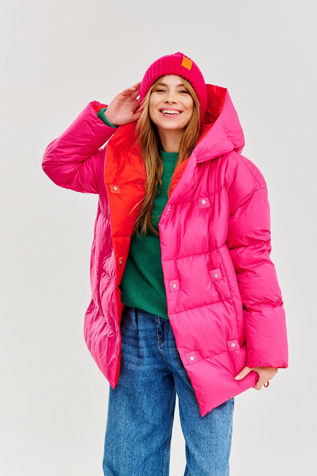 Dwustronna kurtka zimowa Alaska Orange Bliss to odważna propozycja dla miłośniczek koloru i radości nawet w najbardziej pochmurne dni. Posiada dwie zupełnie różne strony – jedna z nich przyciąga intensywnym odcieniem soczystej pomarańczy, podczas gdy druga emanuje energicznym różem, tworząc świeży i wyrazisty look. Dzięki temu kurtka pozwala na łatwą zmianę stylu w zależności od nastroju.