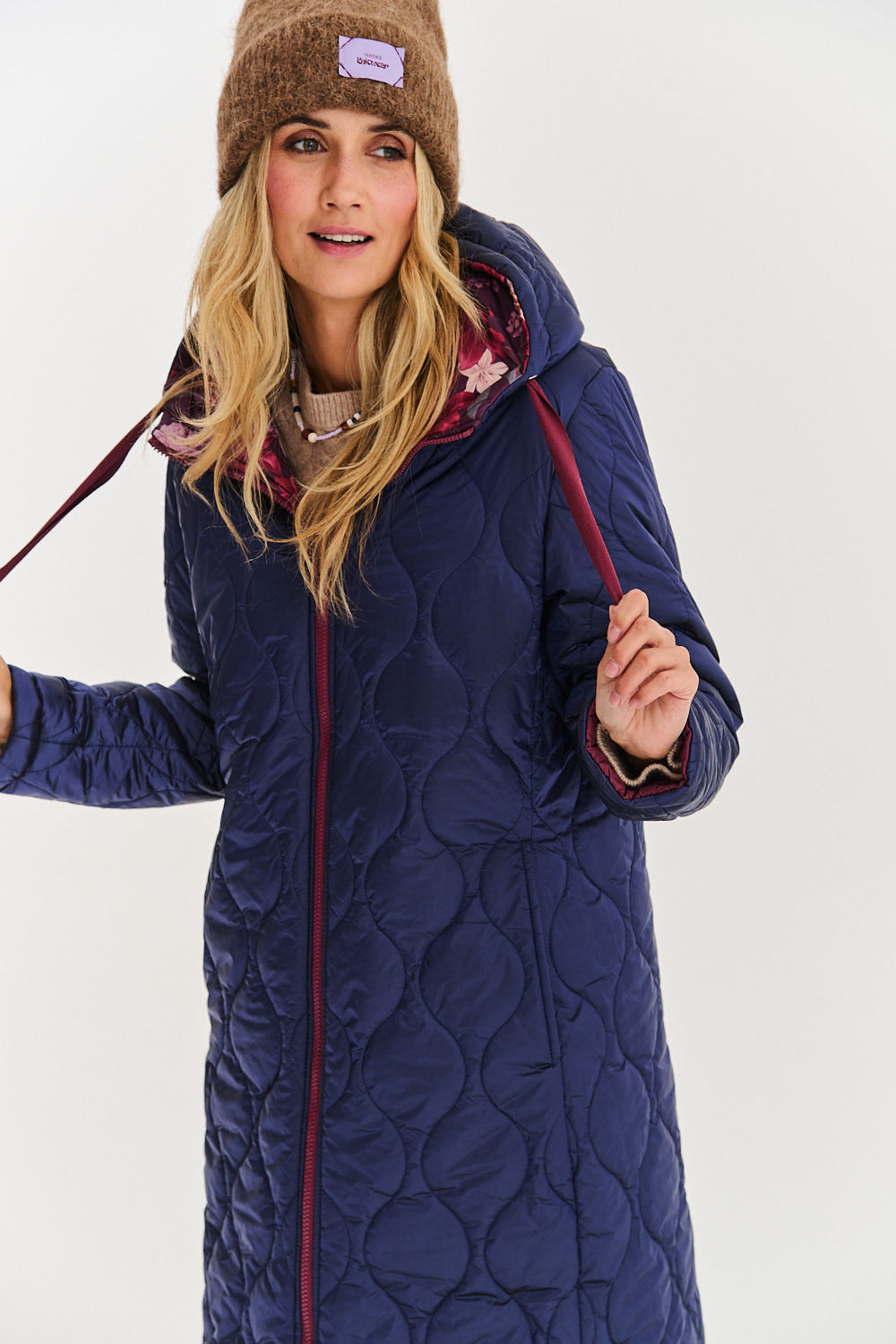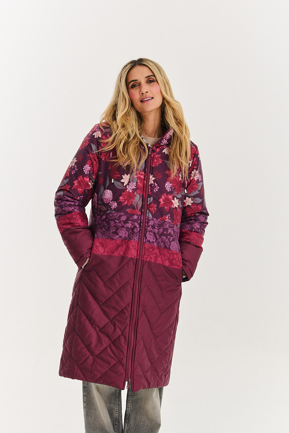 Dwustronny płaszcz Blush In The Dark to absolutny must-have dla niezdecydowanych i ceniących wszechstronność. Jedna strona to artystyczne połączenie wzoru "Moss Garden" na górze i gładkiego bordo na dole. Druga strona to jednolity granat z eleganckim pikowaniem w kształcie fali.
