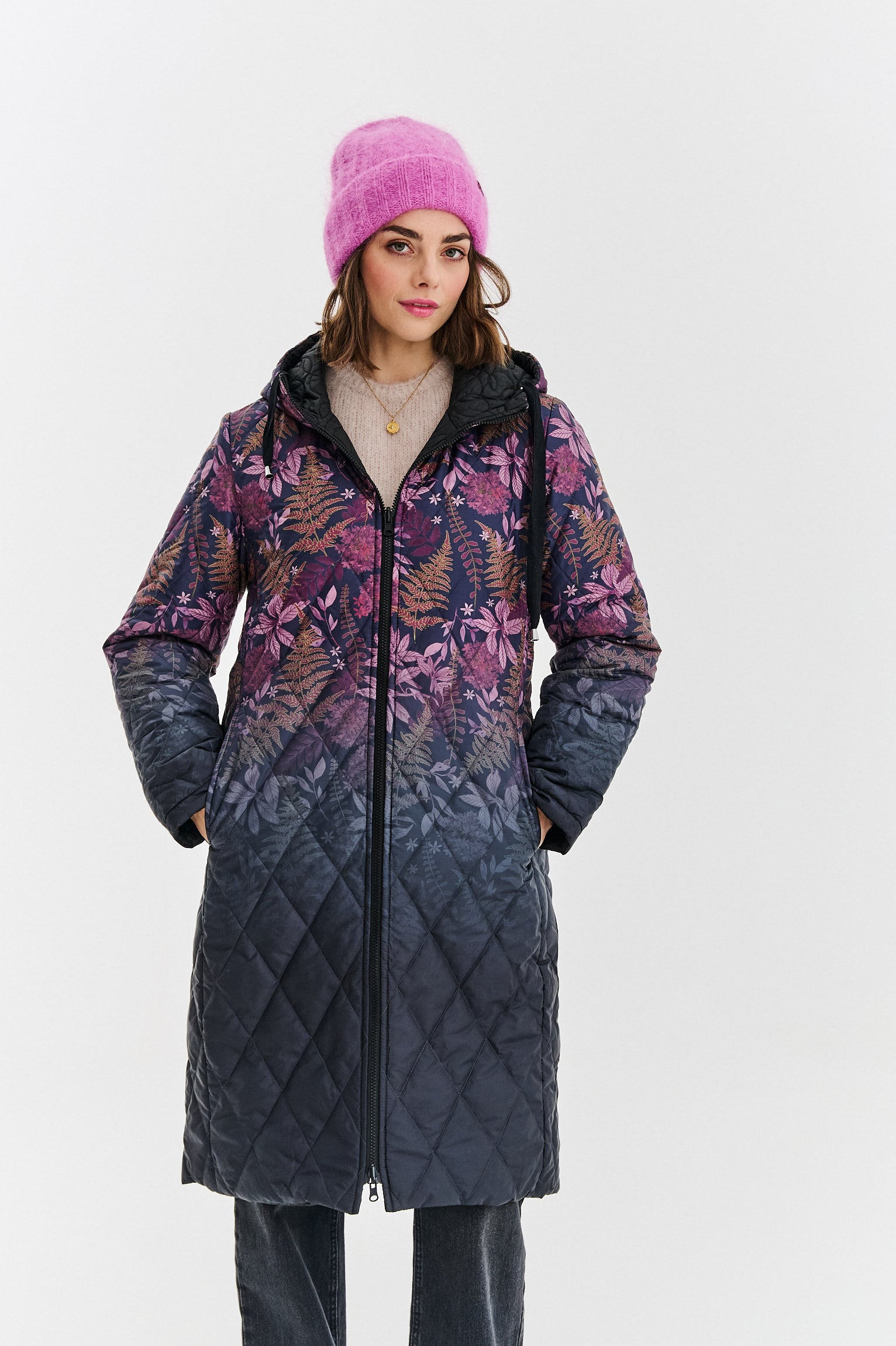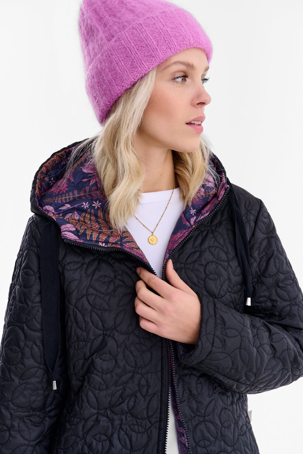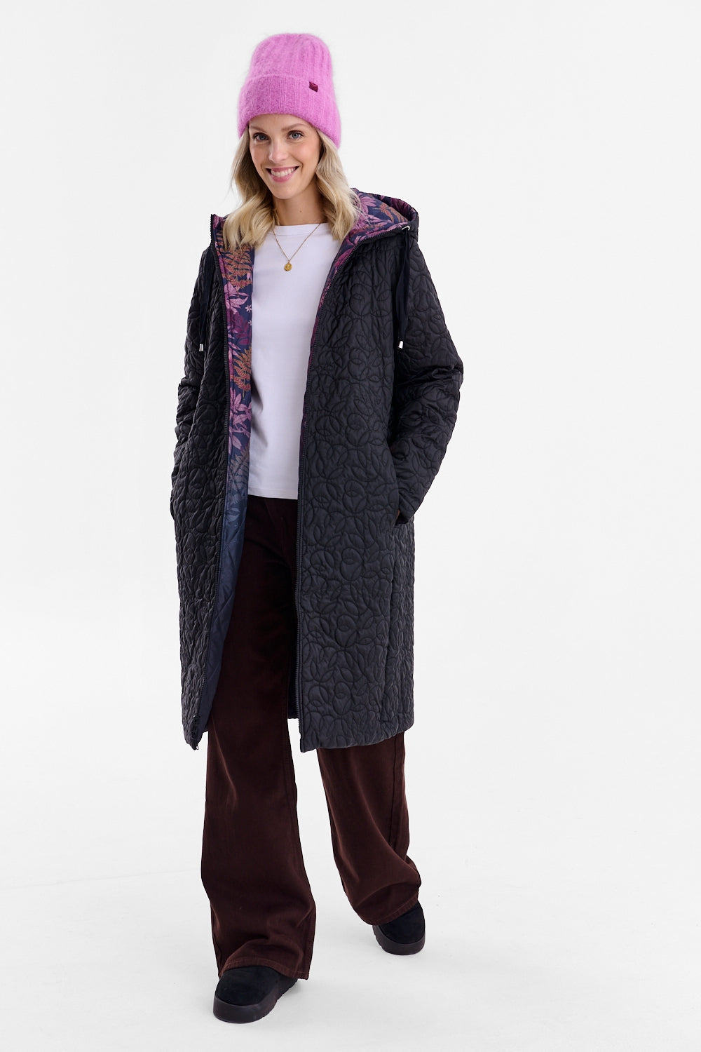 Dwustronny płaszcz pikowany Fern Flower to propozycja dla romantyczek i minimalistek w jednym. Długi, prosty krój z kapturem zapewnia ciepło i wygodę, a możliwość zmiany strony sprawia, że jest to niezwykle praktyczny element garderoby. Wzorzysta strona ożywi każdą stylizację, a czarna doda jej klasy i uniwersalności.