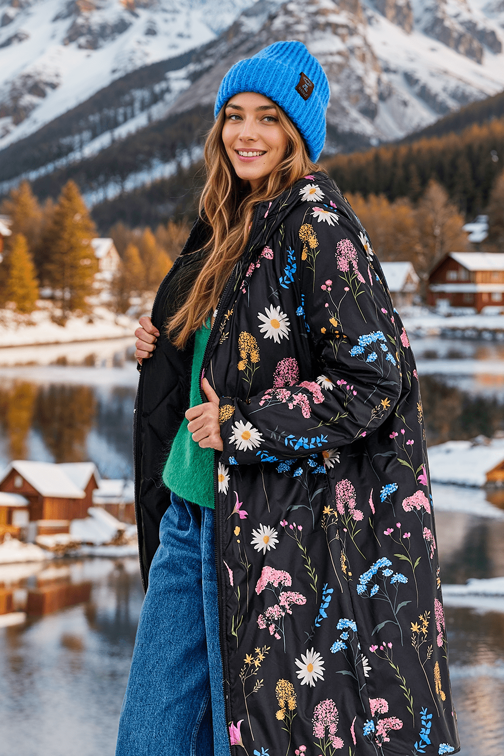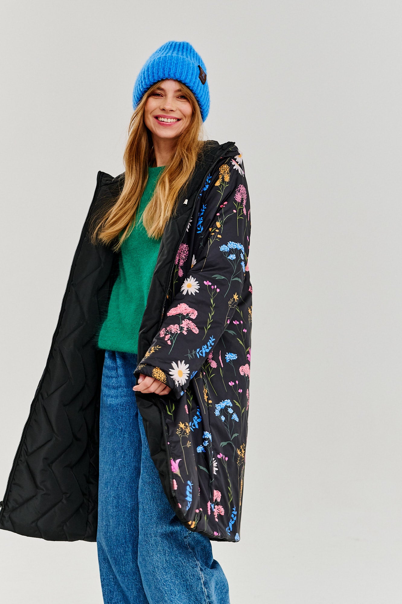 Dwustronny płaszcz zimowy Herbarium to wybór dla Ciebie, jeśli jesteś miłośniczką oryginalnych rozwiązań! Ten płaszcz sprosta Twoim oczekiwaniom i dostosuje się do każdej Twojej stylizacji. Dzięki przemyślanej konstrukcji można ją nosić na dwa sposoby – każda strona oferuje inny kolor lub wzór, co pozwala dopasować stylizację do nastroju lub okazji Jest zapinany na zamek, posiada kieszenie po obydwu stronach i obszerny kaptur. Płaszcz został wypełniony ociepliną syntetyczną 150 g.
