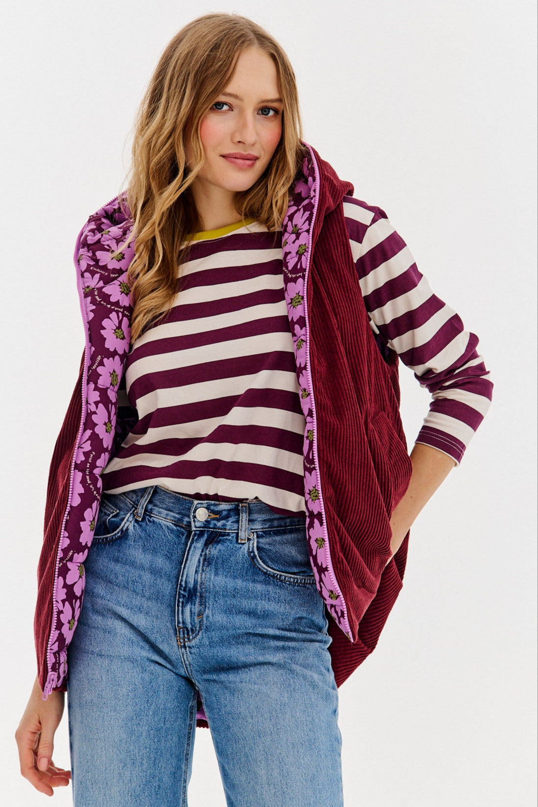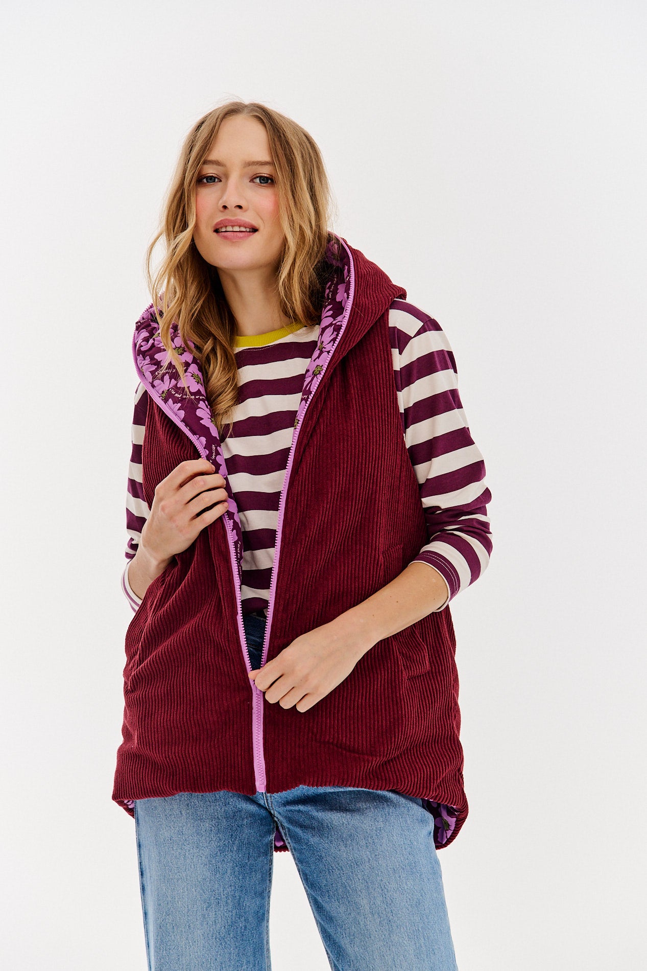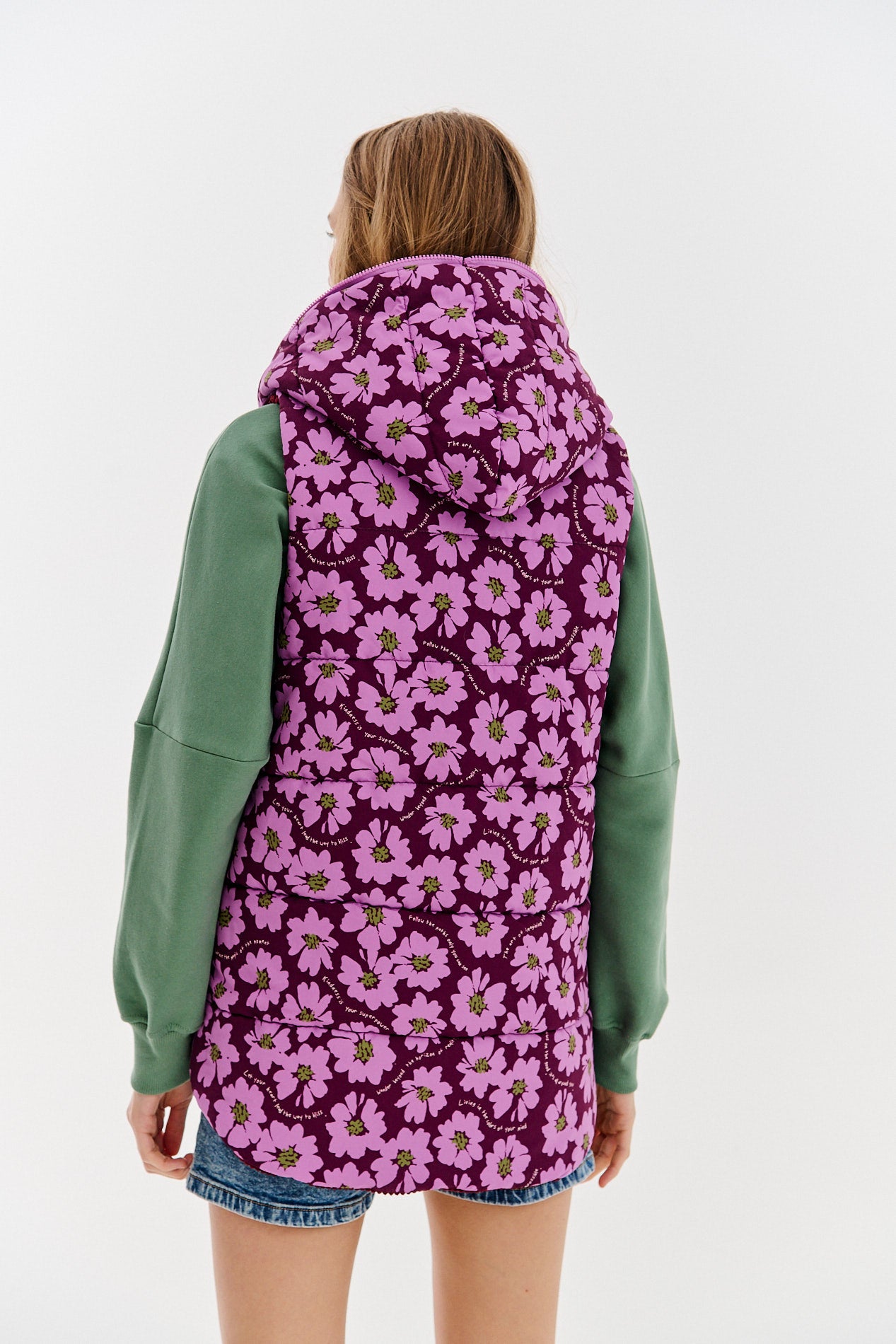 Kamizelka dwustronna Bloomy Balance to propozycja dla tych, którzy kochają zabawę modą i poszukują równowagi pomiędzy klasyką a kobiecą energią. Z jednej strony ozdobiona energetycznym kwiatowym printem w różu i fioletach, który od razu poprawia nastrój i przyciąga wzrok, z drugiej – stonowana, pikowana powierzchnia w odcieniu głębokiego bordo, którą wyróżniają subtelne detale. Lekka, a jednocześnie świetnie chroniąca przed chłodem – idealna na poranne spacery, szybkie wyjścia po mieście czy weekendowe wypady za miasto.