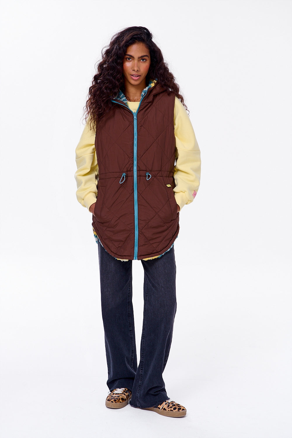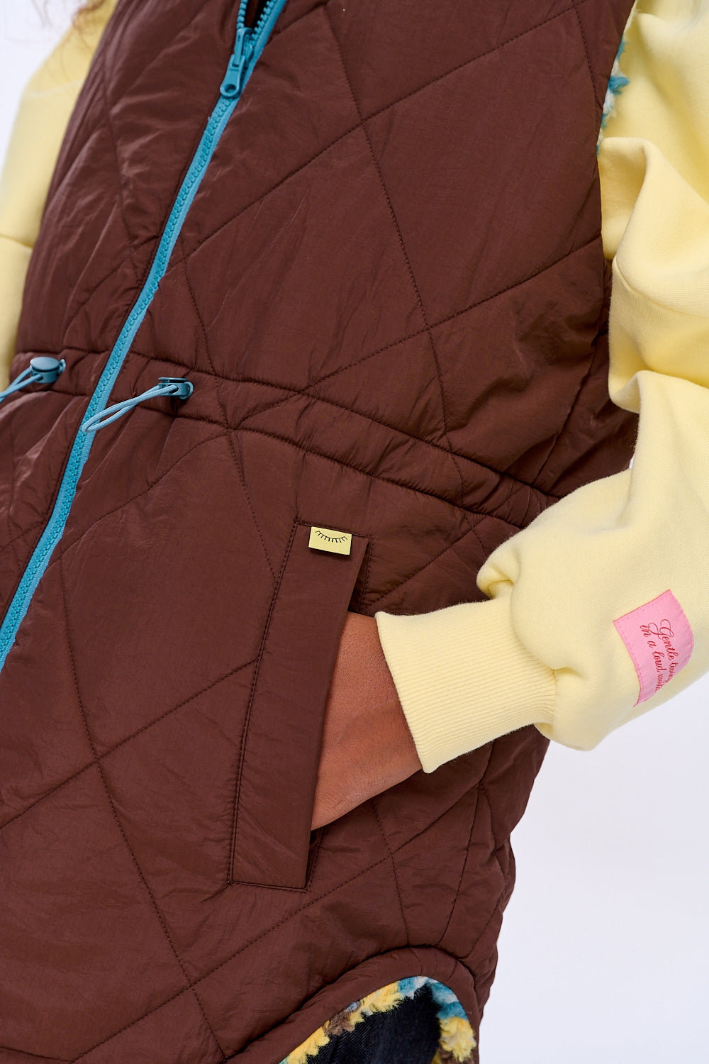 Przedłużony krój wysmukla sylwetkę i zapewnia komfort noszenia, a praktyczne kieszenie oraz kaptur dodają jej funkcjonalności. Możesz nosić ją zarówno na sportowo, jak i w casualowych zestawieniach – zmieniając stronę kamizelki, w kilka sekund odmienisz cały look.