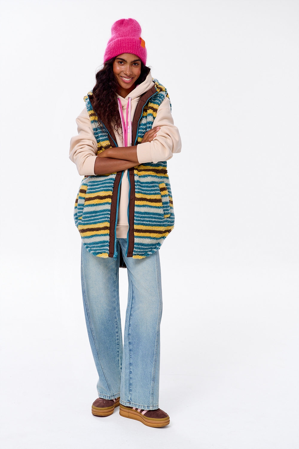 Kamizelka dwustronna Teddy Dunes to połączenie funkcjonalności i wyjątkowego designu inspirowanego naturą. Z jednej strony klasyczna, gładka i stonowana – idealna do codziennych, minimalistycznych stylizacji. Z drugiej – miękki, teddy w odcieniach piasku, błękitu i złamanej bieli, przypominający krajobraz nadmorskich wydm.