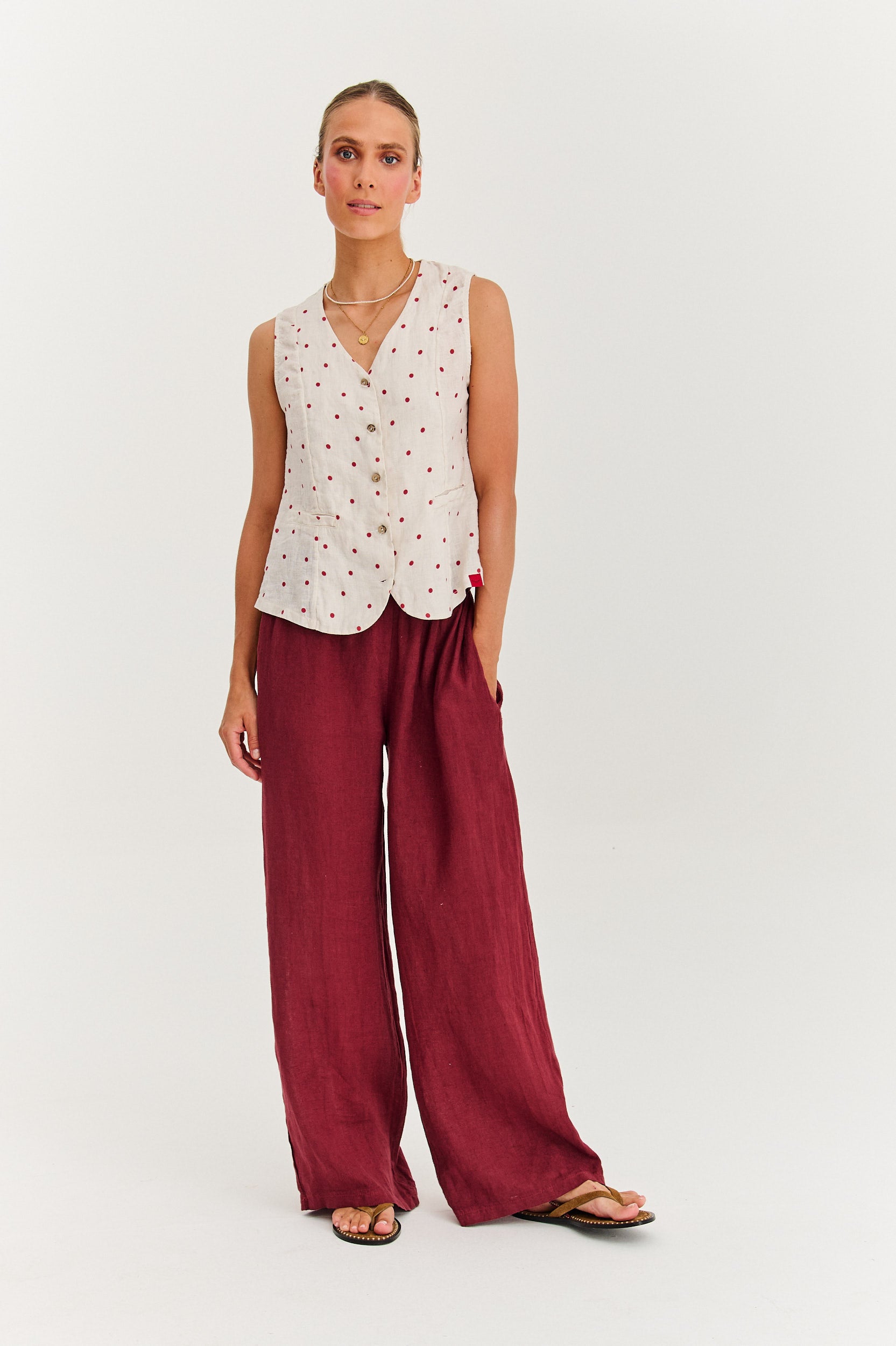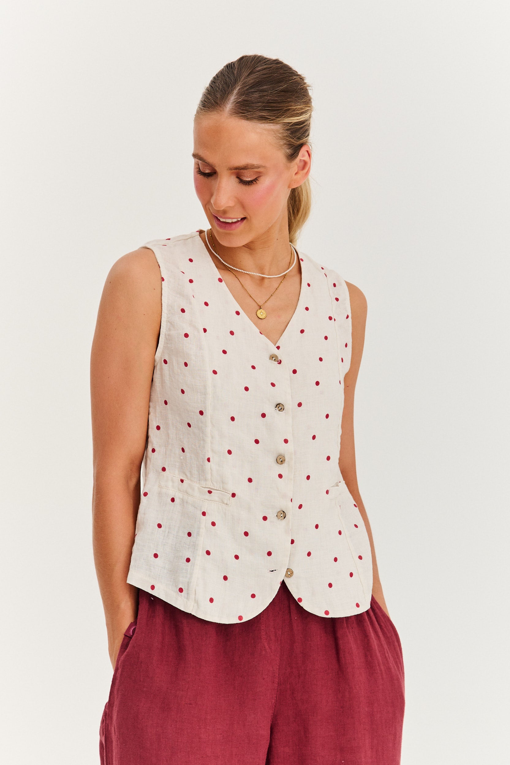 Kamizelka lniana Berry Drop to ukłon w stronę vintage w lekkim, letnim wydaniu. Klasyczny fason z głębokim dekoltem i taliowanym krojem uzupełnia print w ciemnoróżowe kropki, które przywodzą na myśl dojrzałe owoce i włoskie lody malinowe.