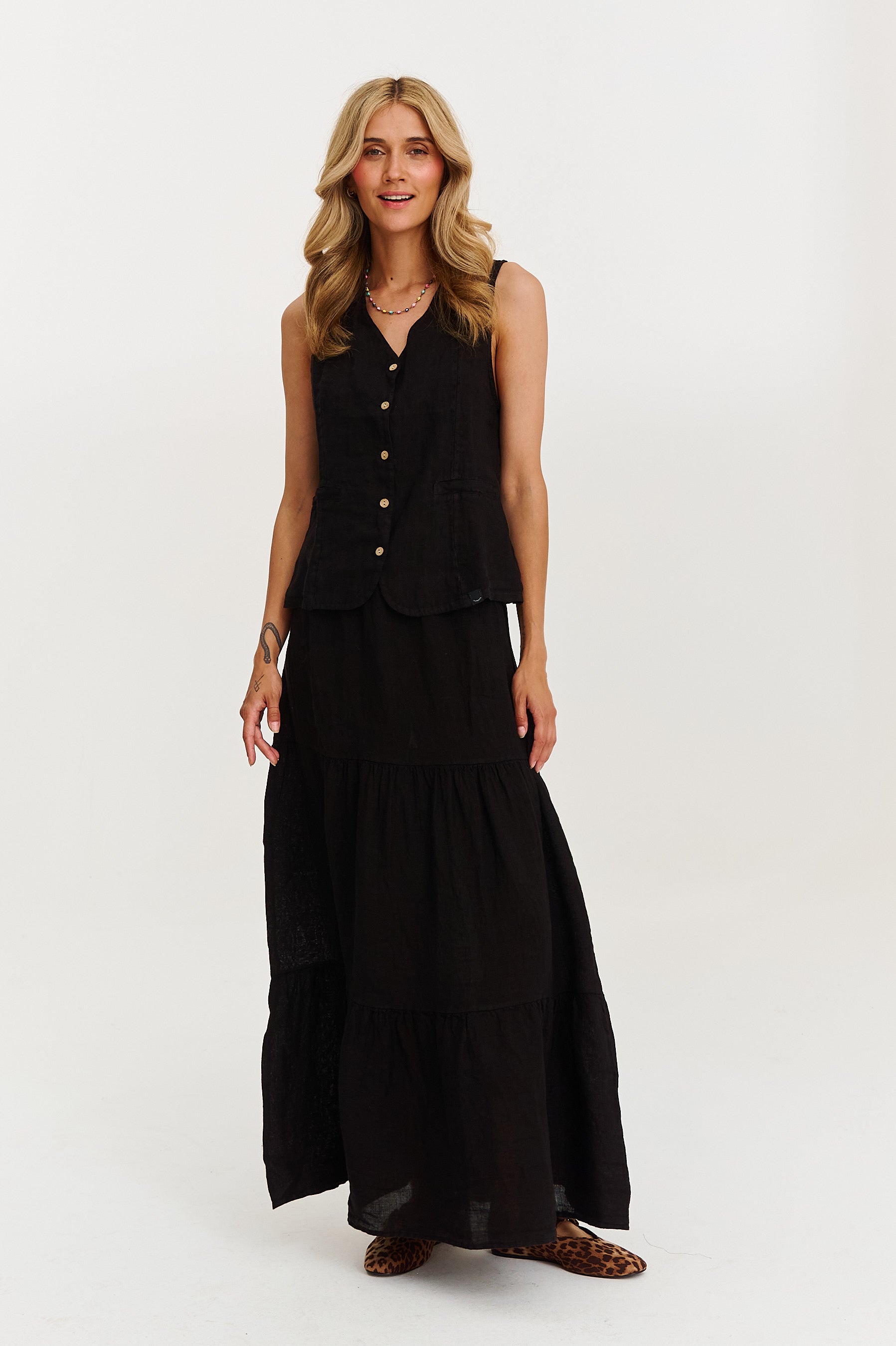 Kamizelka lniana Black Lotus to kobiecy ukłon w stronę klasyki i współczesnej nonszalancji. Skrojona tak, by subtelnie podkreślać talię, zapinana na guziki i utrzymana w głębokim kolorze ponadczasowej czerni – to must-have w letniej garderobie z charakterem.
