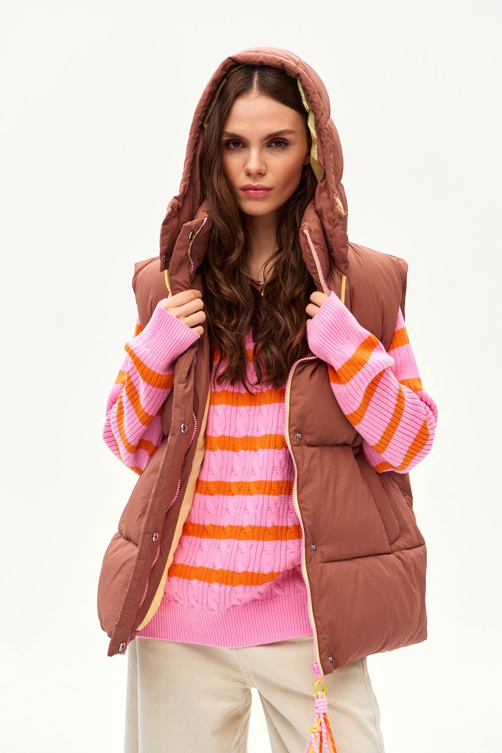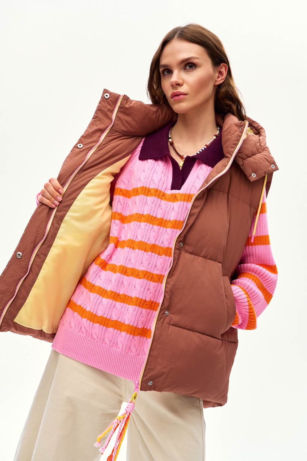 Kamizelka pikowana Golden Hour to idealny wybór dla fanek kolorów ziemi i tekstur. Przyciąga wzrok i zapewnia komfort cieplny. Żółta podszewka dodaje jej nowoczesnego, energetycznego charakteru.