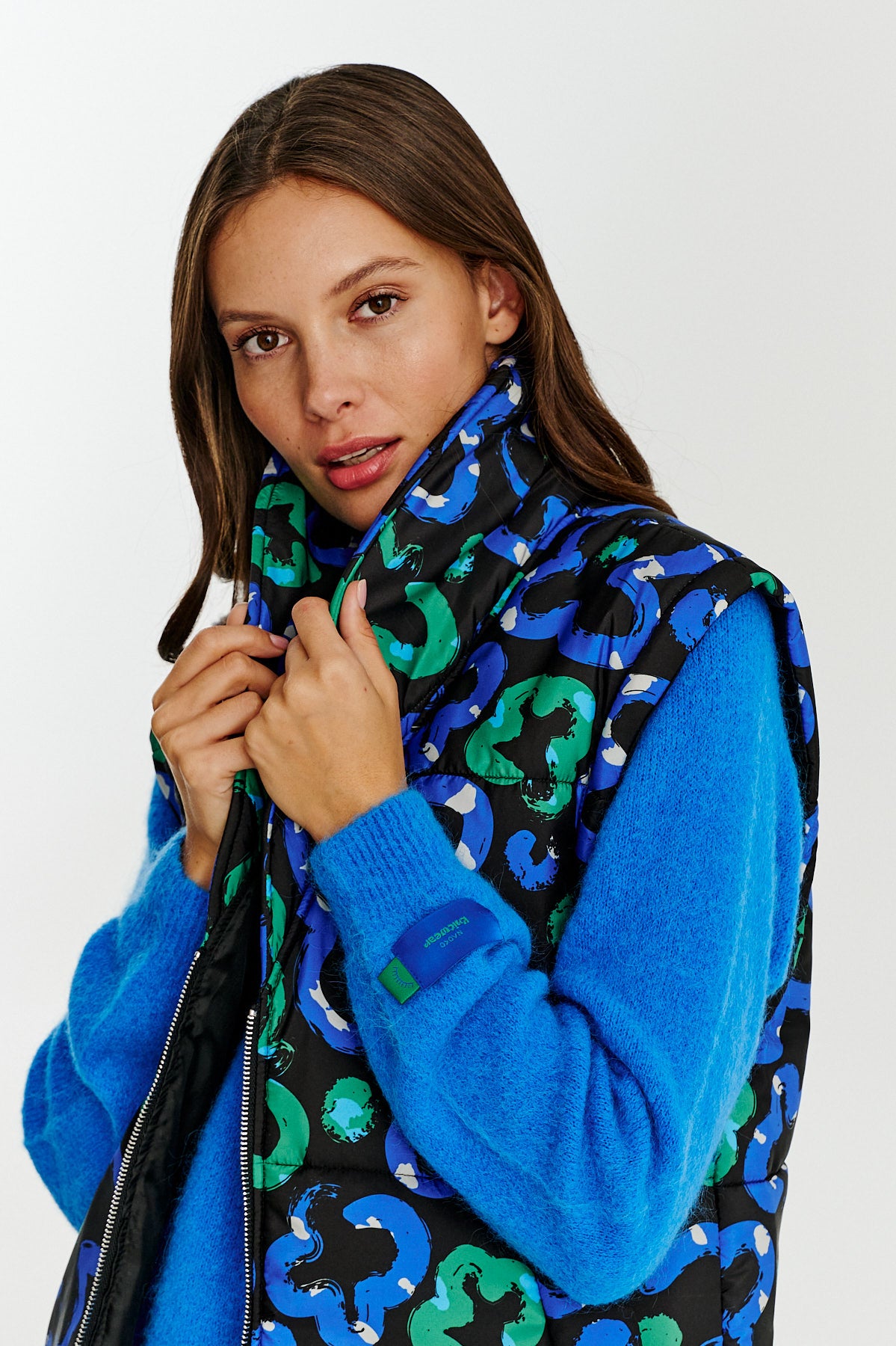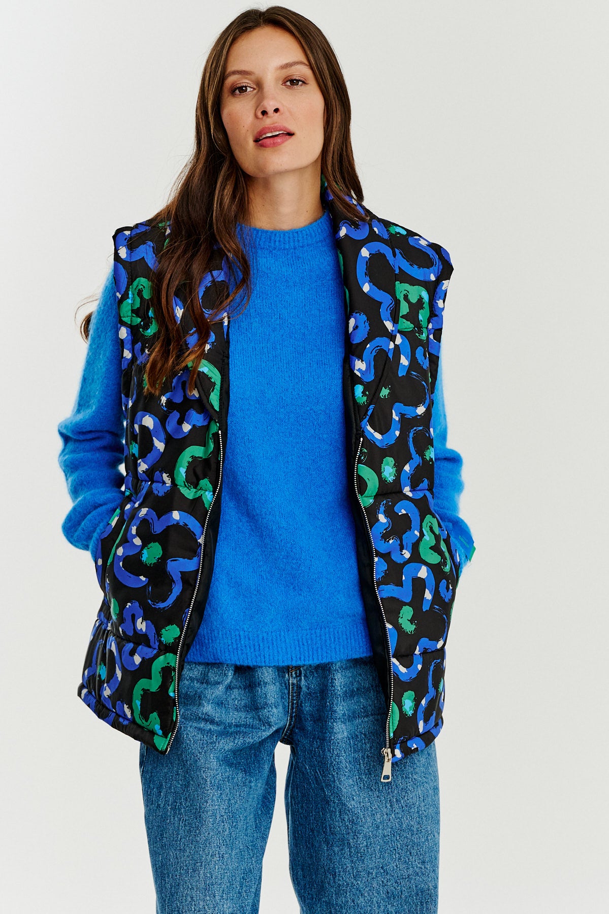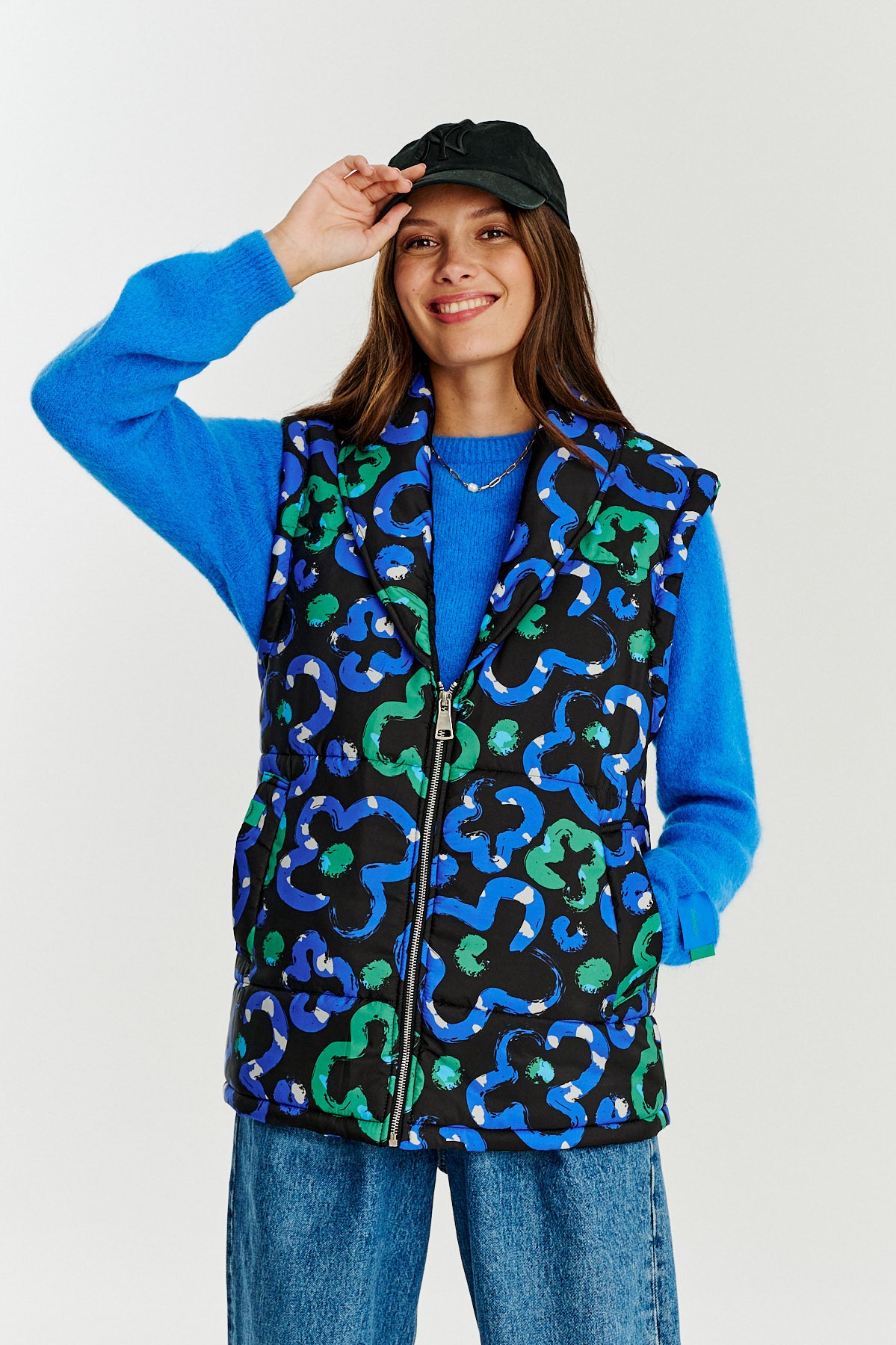 Kamizelka Wildflower Horizon to wyrazista propozycja dla osób ceniących oryginalne wzory i wygodę. Wyróżnia ją charakterystyczny, wielokolorowy wzór inspirowany dzikimi kwiatami, w odcieniach zieleni, niebieskiego i czerni. Kamizelka posiada zapięcie na zamek oraz kołnierz szalowy, który dodaje jej elegancji.