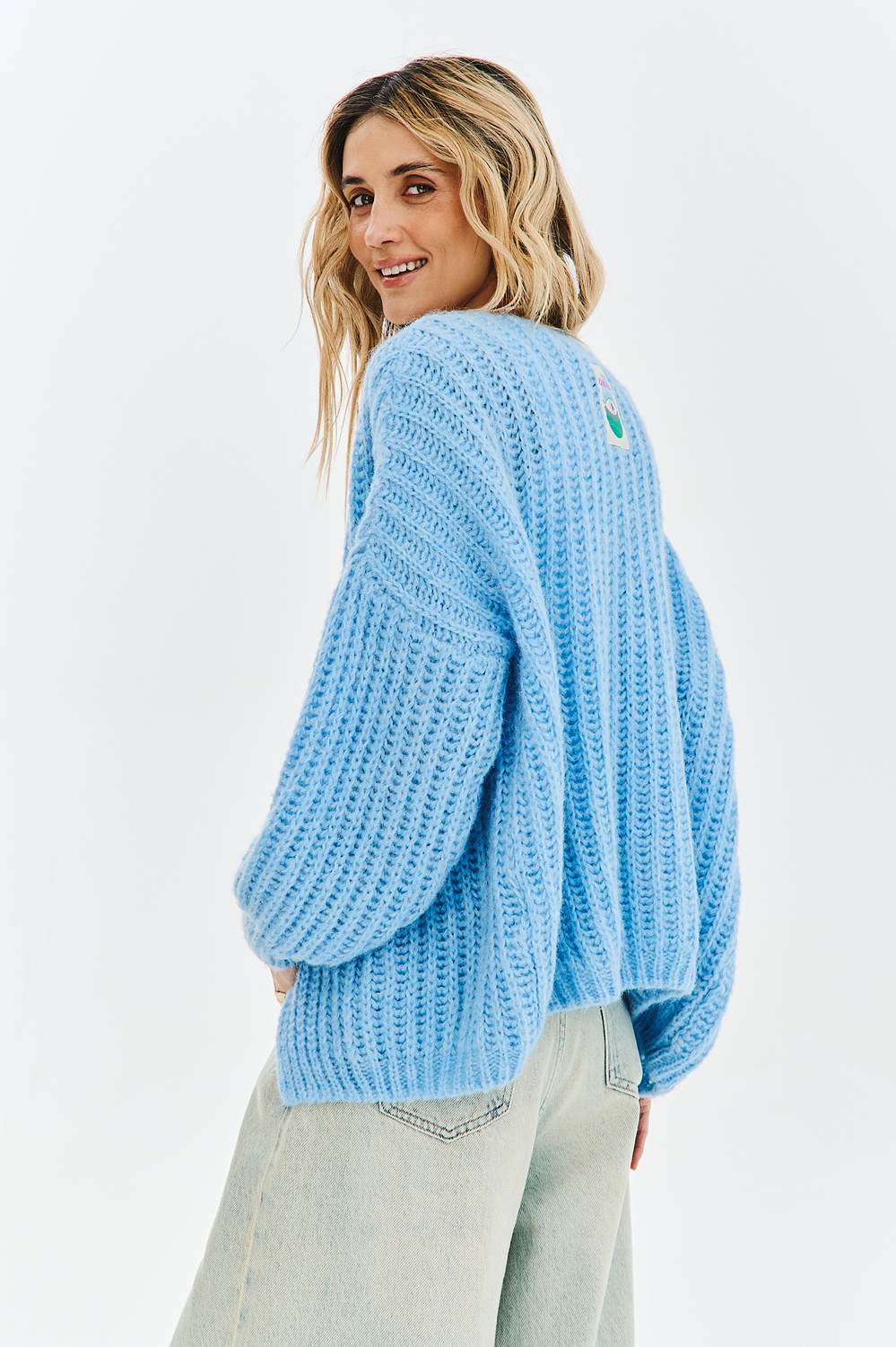Kardigan Air Kissed zachwyca intensywnym odcieniem nieba. Wykonany z mięsistej przędzy o wyraźnym splocie, posiada luźny krój z bufiastymi rękawami, które nadają mu nowoczesnej formy. Brak zapięcia sprawia, że jest niezwykle swobodny.