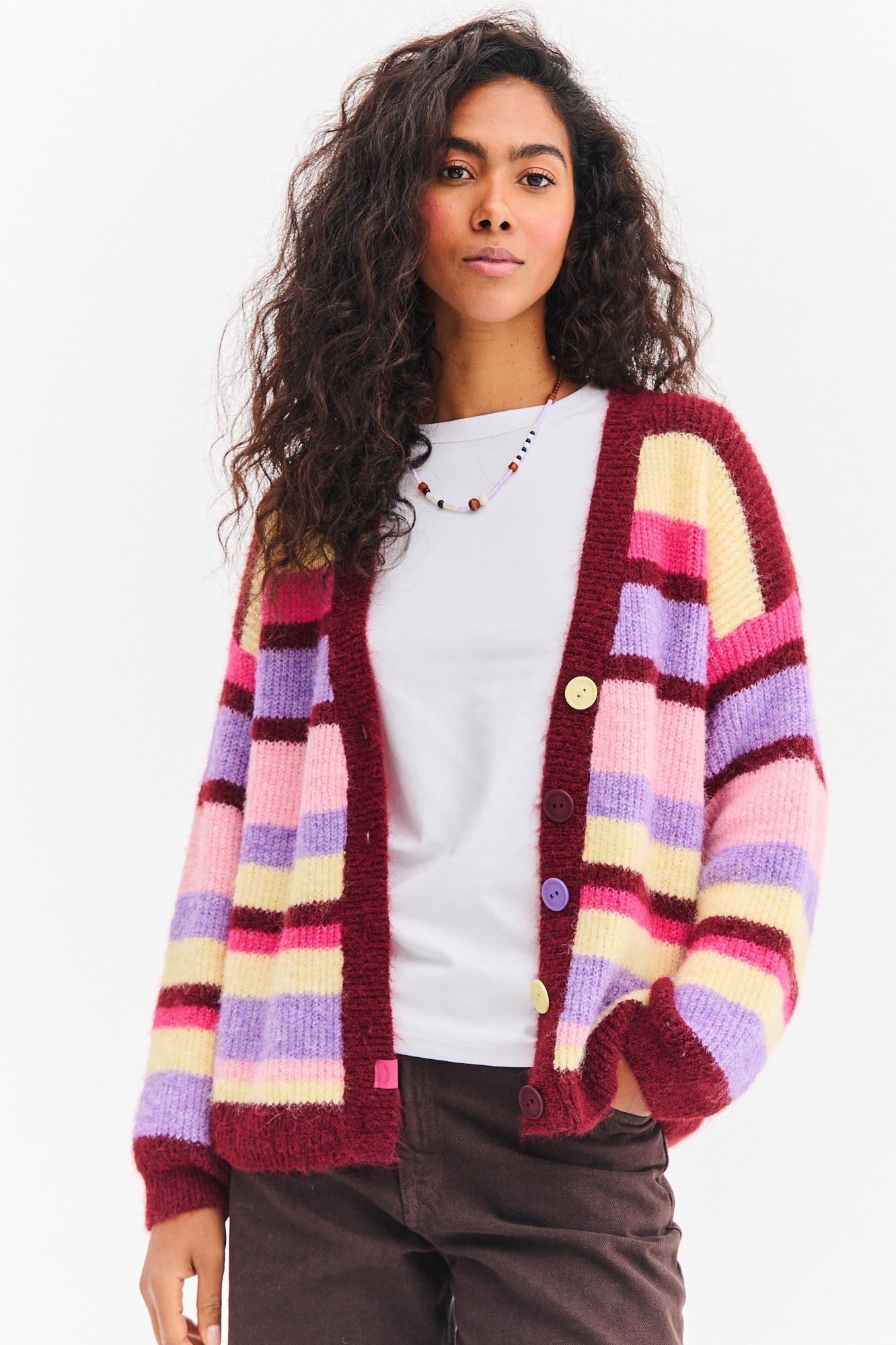 Kardigan Color Spell to propozycja z naszej bajkowej kolekcji, która udowadnia, że jesień nie musi być szara. Ten zapinany na guziki sweter łączy w sobie intensywne kolory w odważny, poziomy wzór. Głębokie bordo lamówek i dekoltu pięknie domyka kompozycję.