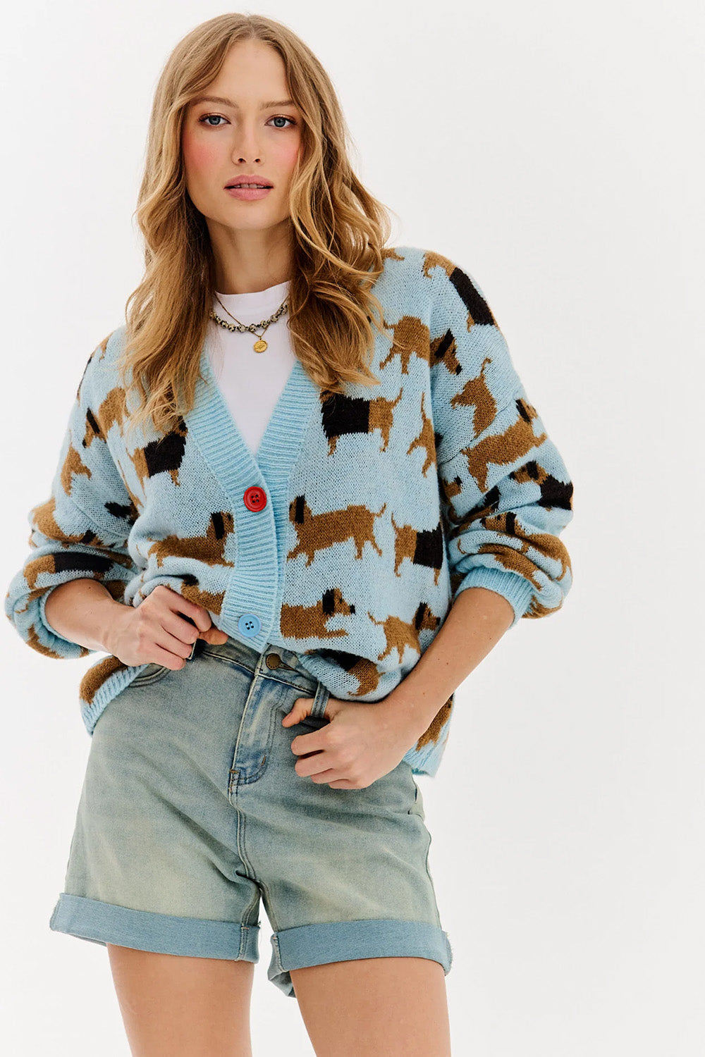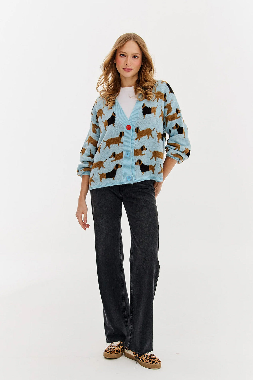 Kardigan wyróżnia się subtelnym, pastelowym błękitem w tle i wzorem przedstawiającym różnokolorowe jamniki – karmelowe, czekoladowe i czarne. Zapięcie na guziki w dwóch kontrastowych kolorach – niebieskim i czerwonym – dodaje mu charakteru, a naszywka „Happiness looks good on you" z tyłu przypomina, że moda ma sprawiać radość. Kardigan doskonale łączy się z jeansami, dresami czy sukienkami, tworząc urocze i komfortowe stylizacje.
