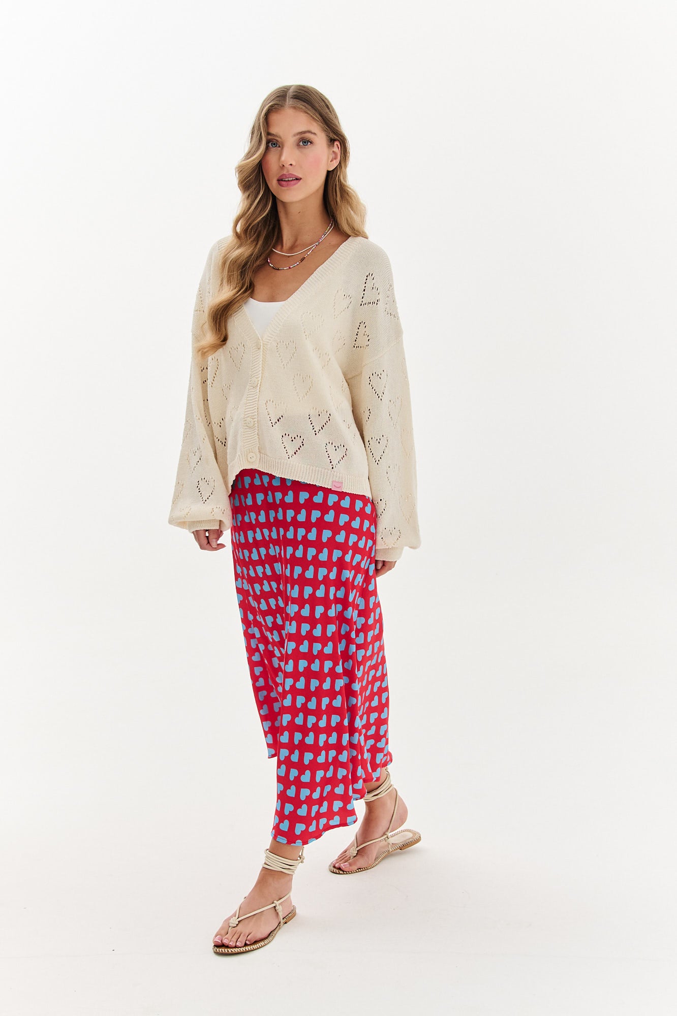 Kardigan Little Star to delikatna i romantyczna propozycja z ażurowym wzorem w serduszka, która urzeka subtelnością. Uszyty z miękkiej, kremowej dzianiny bawełnianej, idealnie sprawdzi się jako lekka narzutka na chłodniejsze dni lata lub ciepłe wieczory. Klasyczny fason z długim rękawem i dekoltem w serek pięknie podkreśla kobiecą sylwetkę, a pastelowe detale dodają mu wdzięku.