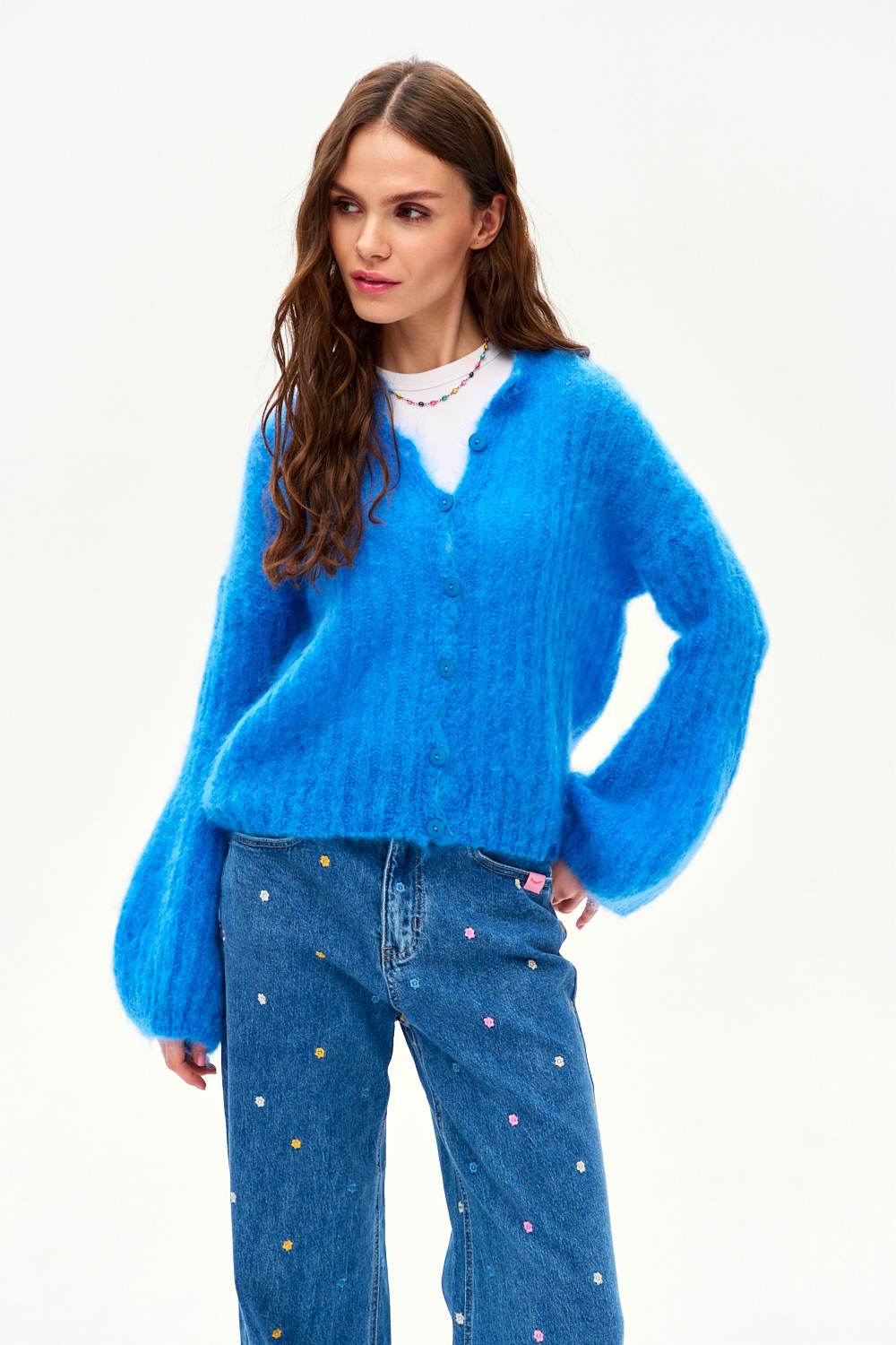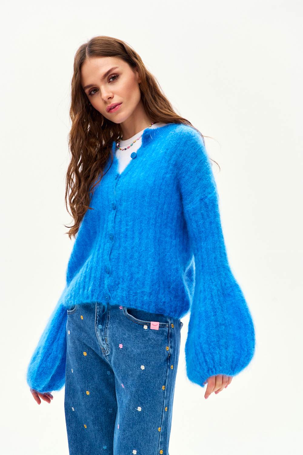Kardigan moherowy Here Comes Joy przyciąga wzrok intensywnym, kobaltowym kolorem. Szerokie, balonowe rękawy to detal, który definiuje ten projekt, nadając mu modowego sznytu. Jest miękki, puszysty i niesamowicie ciepły – idealny kompan na każdą porę roku.