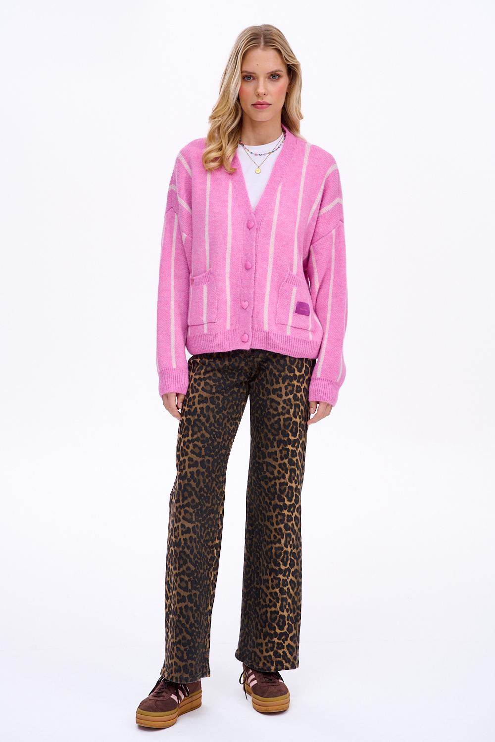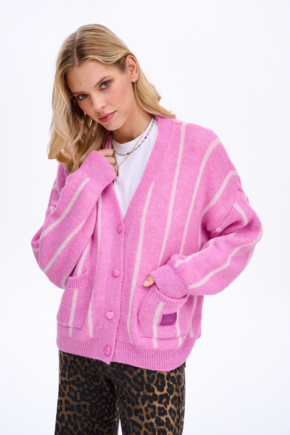 Kardigan Pink Whisper to kwintesencja przytulnego stylu z nutą retro. Jego luźny, oversize'owy krój z dekoltem w serek i zapięciem na guziki sprawia, że jest niezwykle wygodny i praktyczny. Dwie naszyte z przodu kieszenie dodają mu swobodnego charakteru, a miękka dzianina otula ciało.