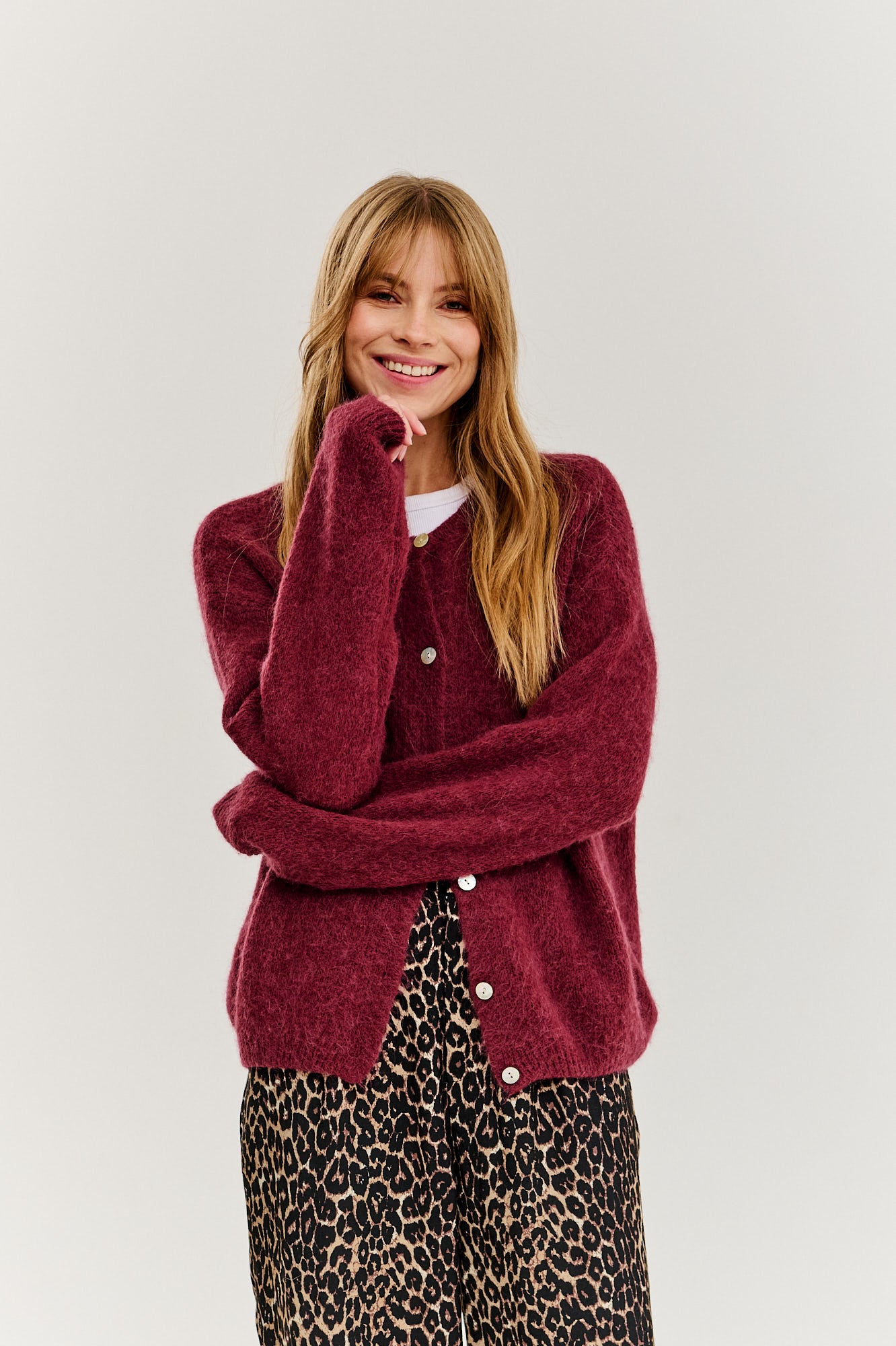 Bordowy sweter Twilight Tango to idealny wybór na codzienne, luźne stylizacje. Jego miękka, przyjemna w dotyku tkanina otula ciepłem, co czyni go doskonałym towarzyszem na chłodniejsze dni. Klasyczny fason z długim rękawem i guziczkami sprawia, że sweter z łatwością dopasowuje się do wielu różnych stylów. Bordowy odcień dodaje elegancji, a jednocześnie zachowuje neutralność, co sprawia, że sweter pasuje do różnych elementów garderoby.