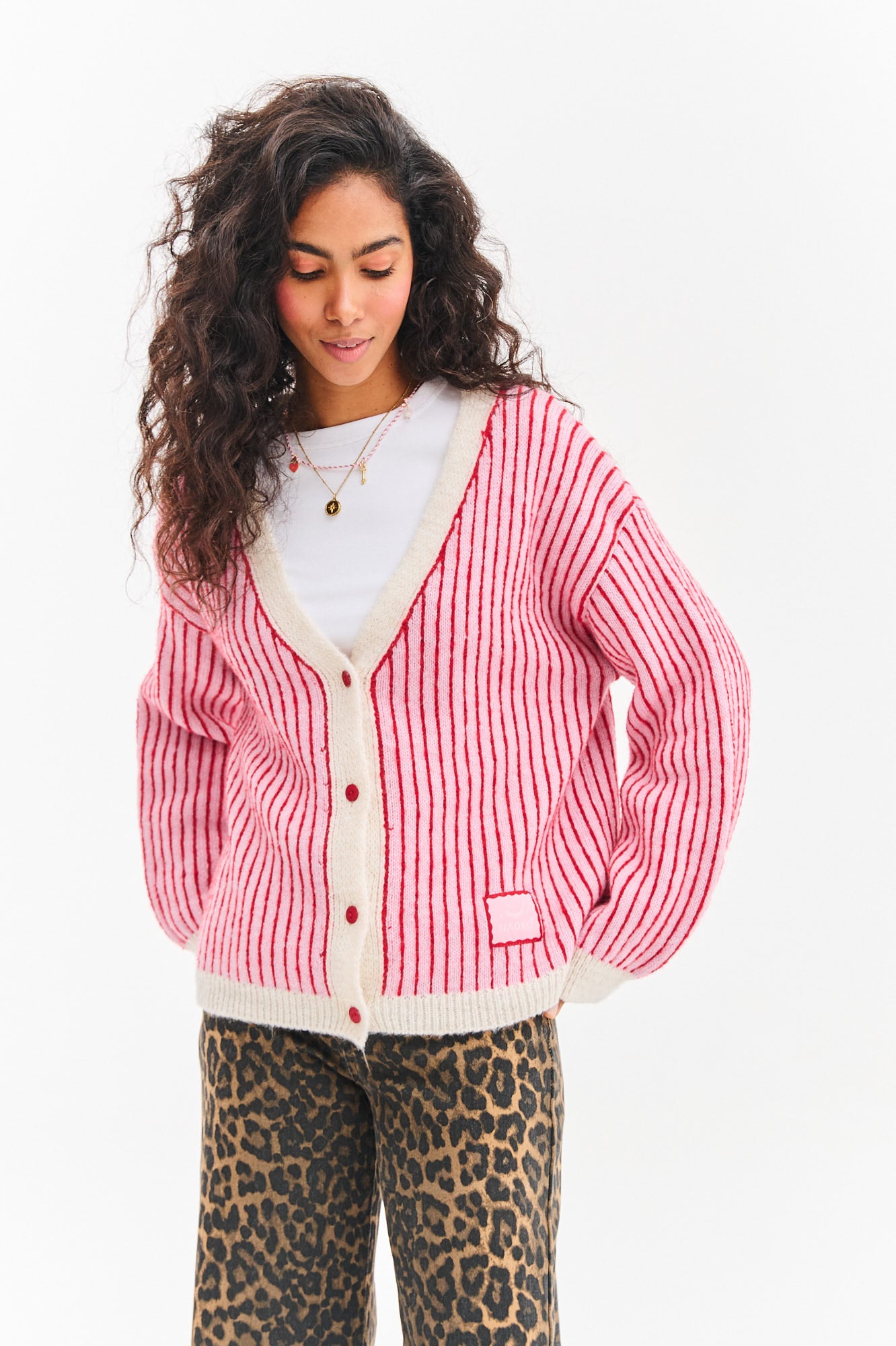 Kardigan Soft Embrace to idealne połączenie klasyki z nowoczesnym twistem. Wyrazisty wzór w czerwono-kremowe prążki przyciąga wzrok, a mięsista, prążkowana dzianina otula ciepłem. Kontrastowe, kremowe wykończenia przy dekolcie, mankietach i u dołu dodają mu elegancji.