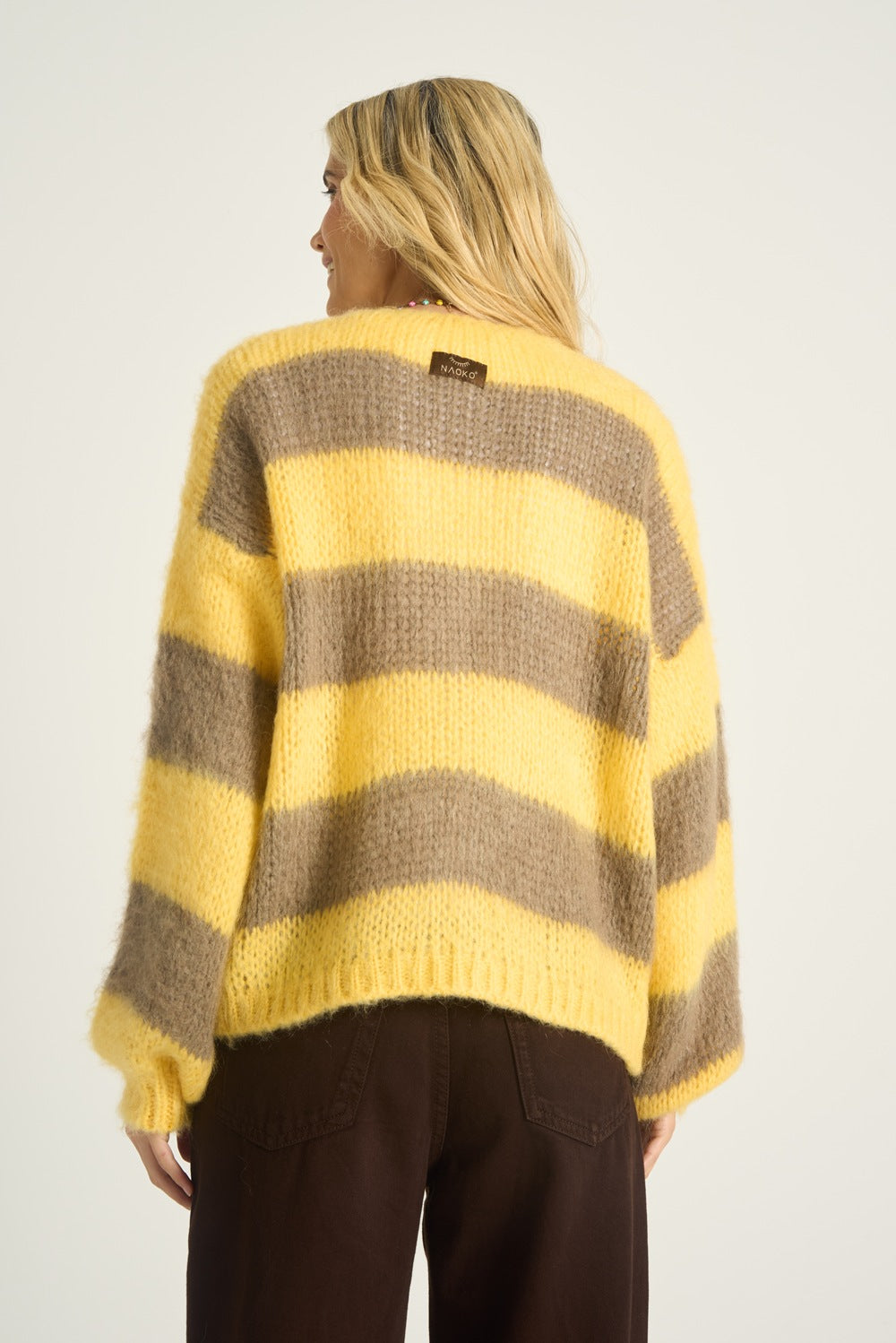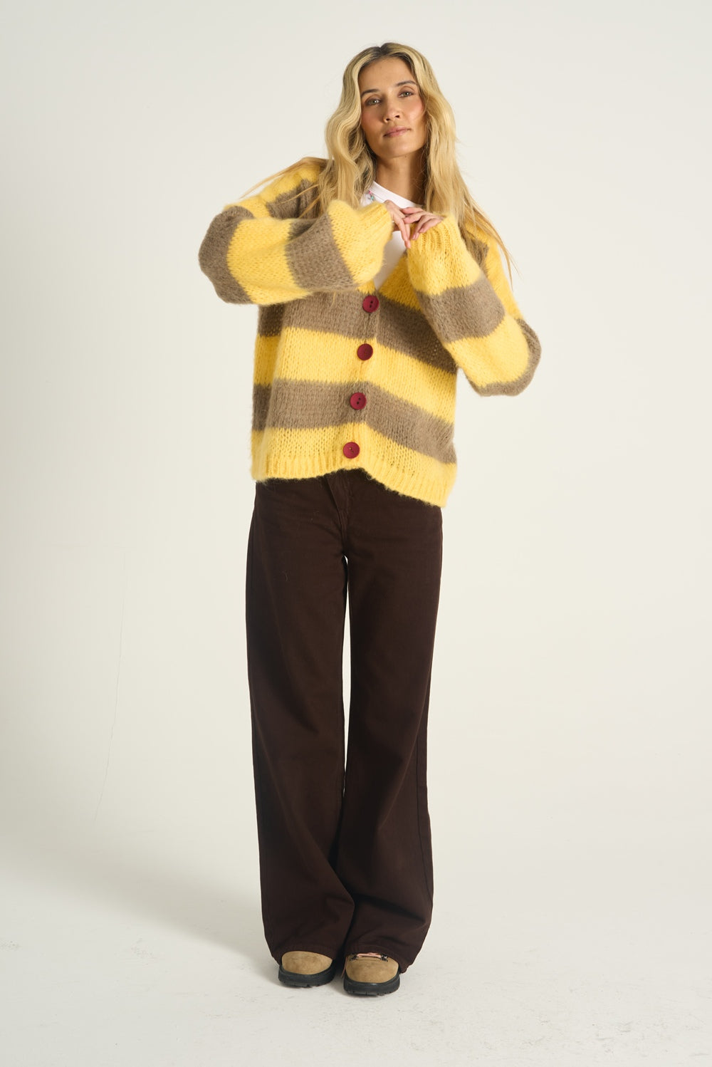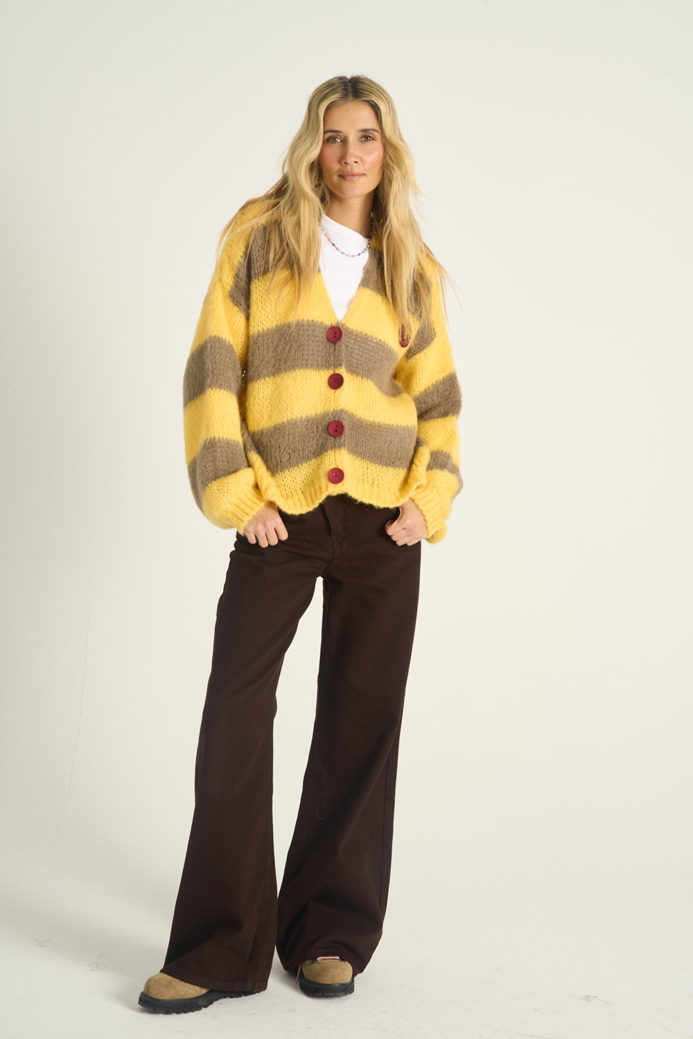 Kardigan z moherem Gryffindor Spirit to propozycja dla odważnych i szlachetnych. Klasyczny fason z dekoltem w serek i zapięciem na guziki został ożywiony szerokimi pasami w charakterystycznych barwach Gryffindoru. Domieszka moheru sprawia, że jest miękki i ciepły.