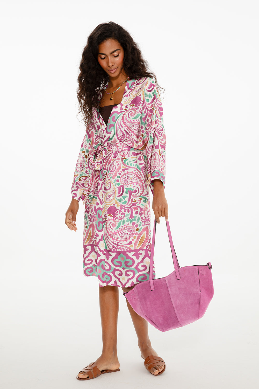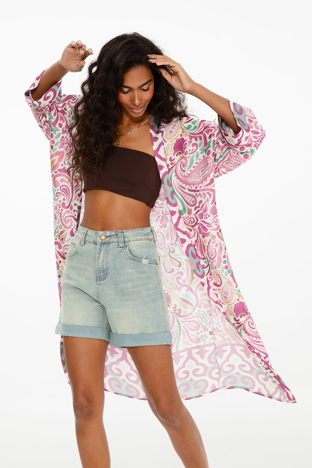 Kimono Boho Summer to kwintesencja wakacyjnej nonszalancji i artystycznej duszy. Uszyte z lekkiej tkaniny, zdobione kolorowym, paisleyowym printem w odcieniach różu, zieleni i cytryny – otula jak ciepły letni poranek nad oceanem.