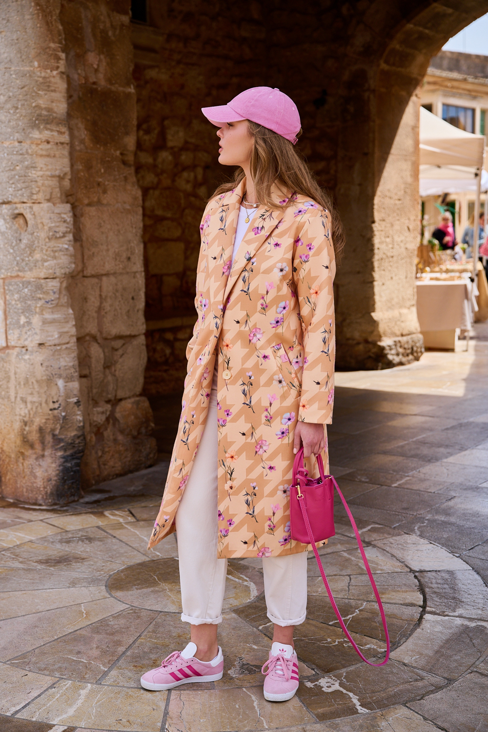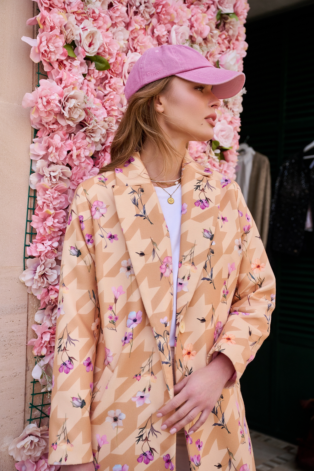 Klasyczny płaszcz Blooming Soul to połączenie elegancji i romantyzmu w najpiękniejszej odsłonie. Beżowa baza w delikatny wzór pepitki została subtelnie ozdobiona kwiatowymi akcentami, które dodają całości lekkości i kobiecego wdzięku. To płaszcz, który wprowadza do codziennych stylizacji powiew świeżości i artystycznego uroku. Długi fason o klasycznym kroju pięknie układa się na sylwetce, zapewniając komfort noszenia i efektowny wygląd. Dwurzędowe guziki podkreślają elegancki charakter modelu, a starannie dopracowane detale, jak różowa podszewka, czynią go jeszcze bardziej wyjątkowym.