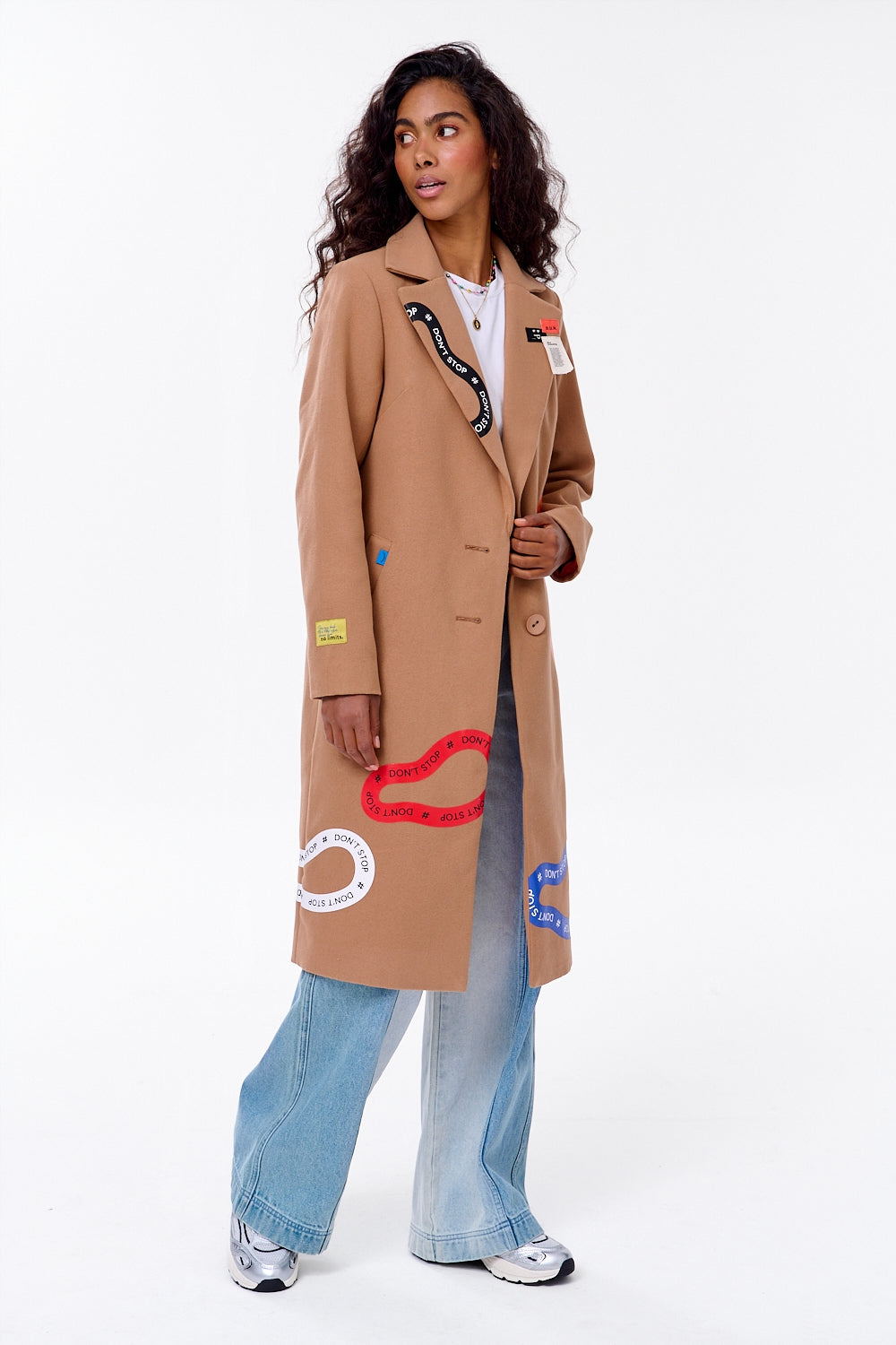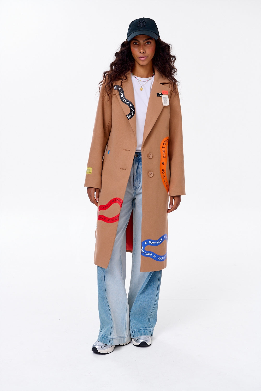 Klasyczny płaszcz Don’t Stop to odważna reinterpretacja ponadczasowego fasonu. Beżowa baza została przełamana geometrycznymi aplikacjami i dynamicznymi hasłami „Don’t Stop”, które nadają projektowi charakteru, energii i streetwearowego sznytu. To płaszcz, który łączy w sobie elegancję i bunt – idealny dla tych, którzy lubią eksperymentować z modą i wyrażać siebie poprzez styl.