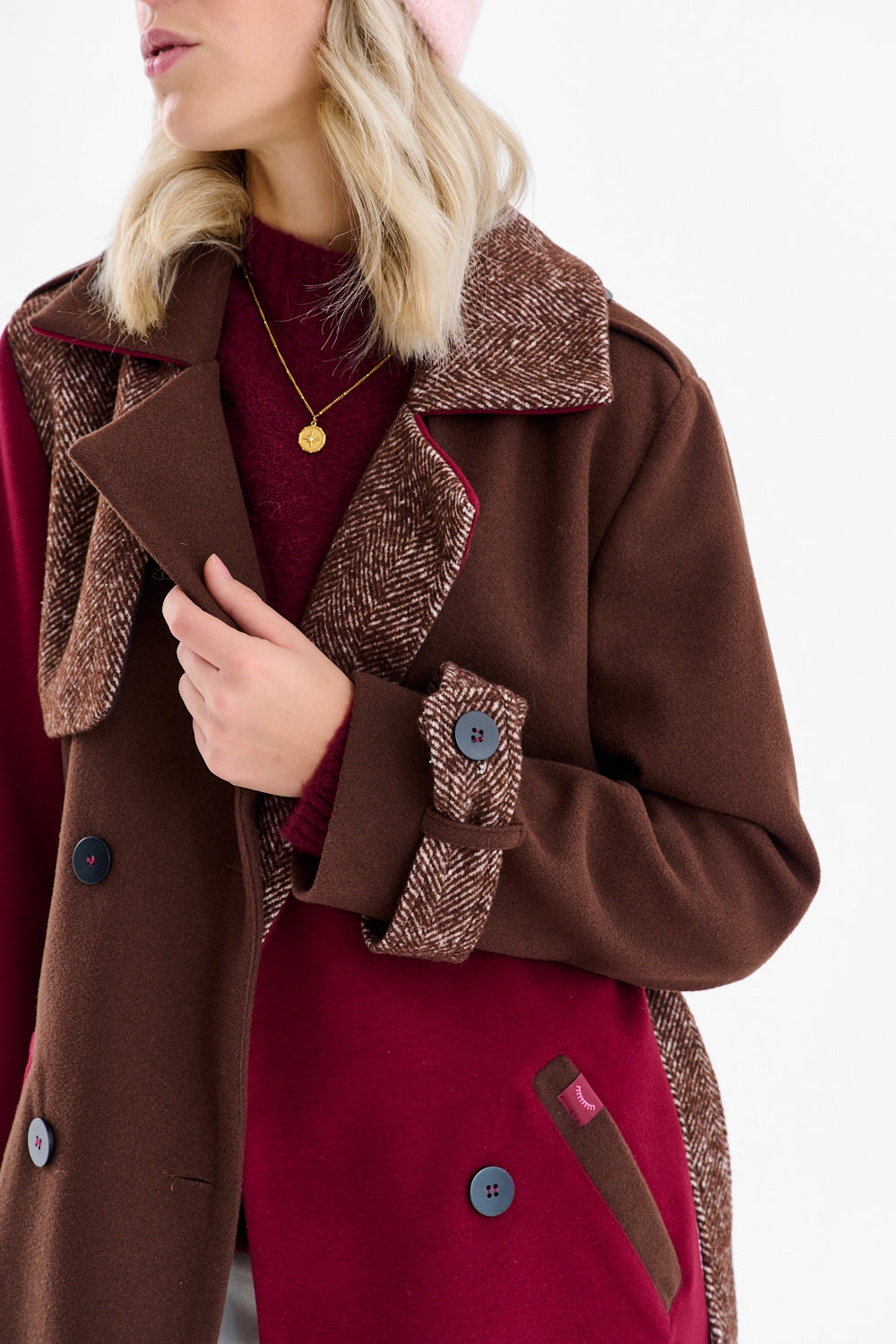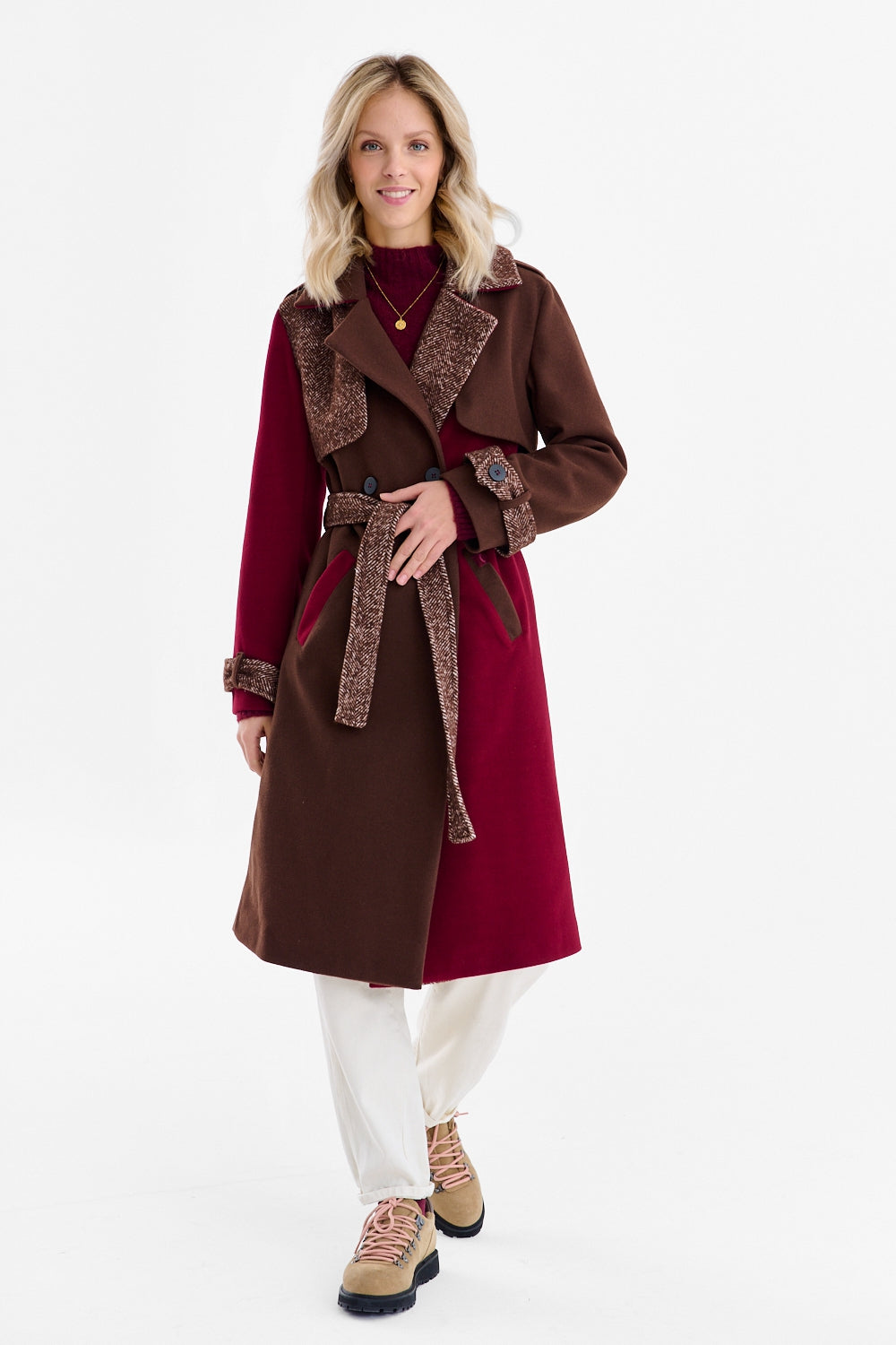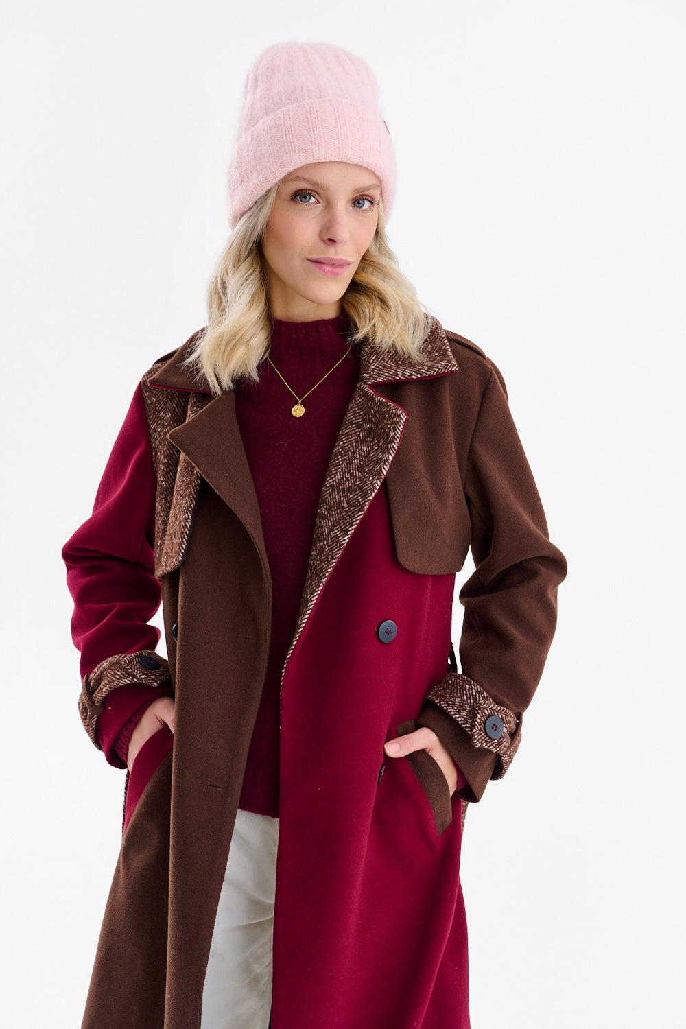 Klasyczny trencz Rulebreaker to kwintesencja jesiennej elegancji. Ten dwurzędowy model łączy w sobie dwa szlachetne kolory: ciepły, czekoladowy brąz oraz intensywne, winne bordo. To propozycja dla kobiet, które szukają klasyki przełamanej nowoczesnym designem.
