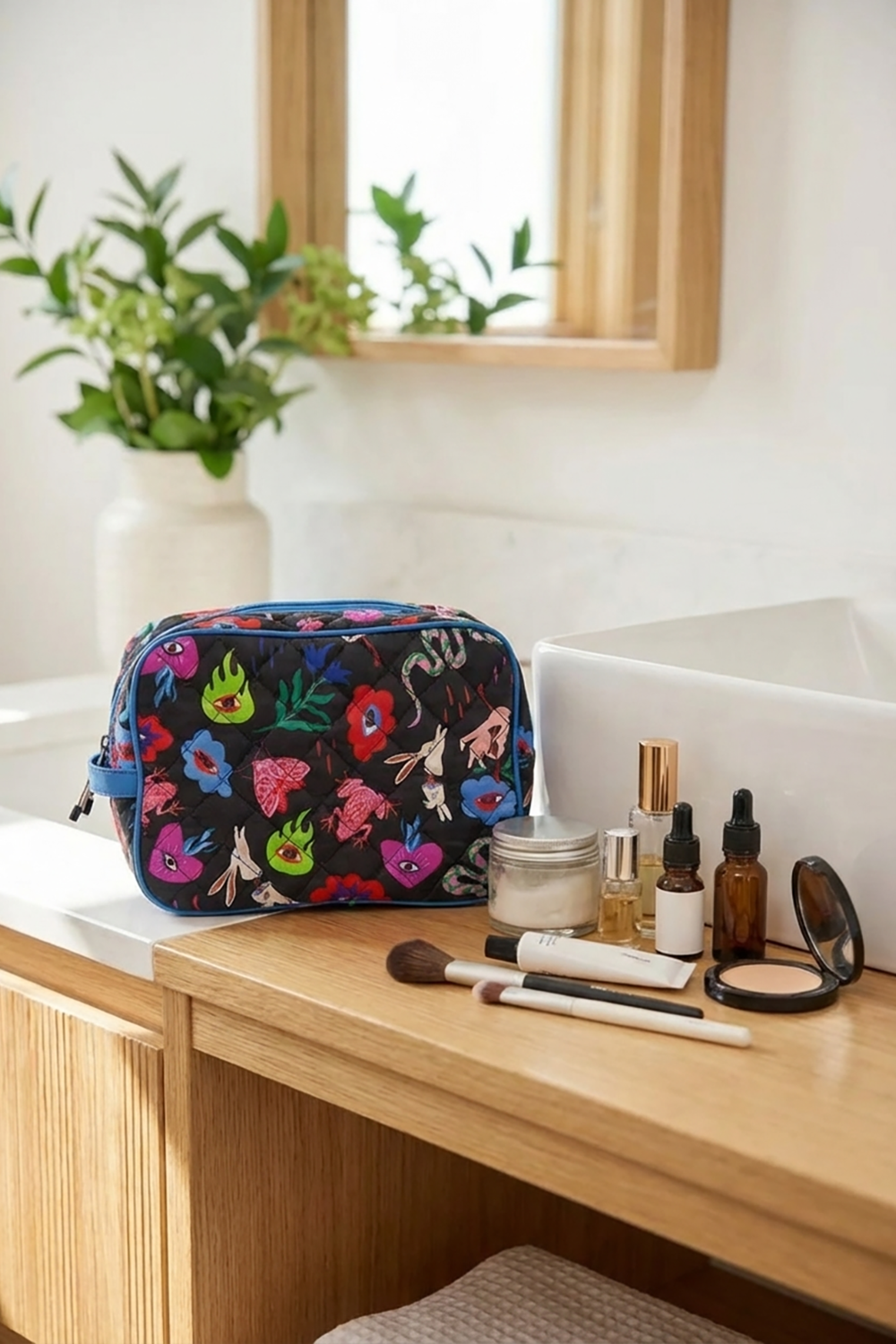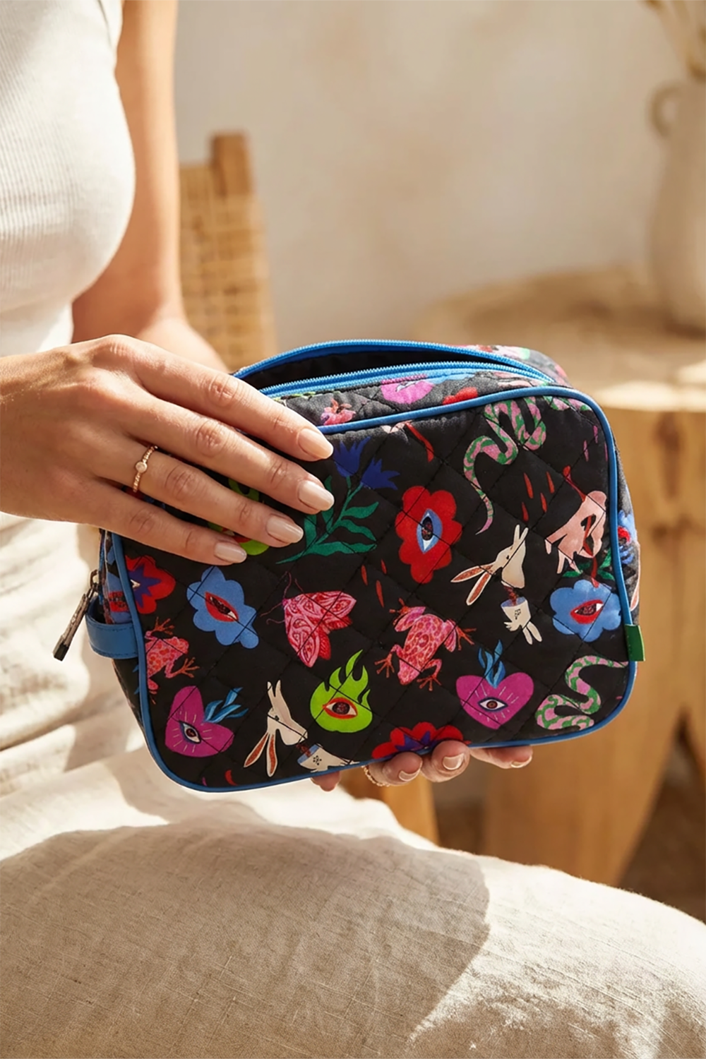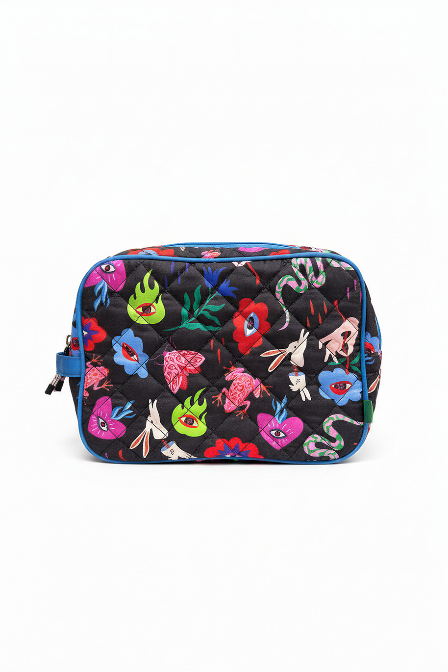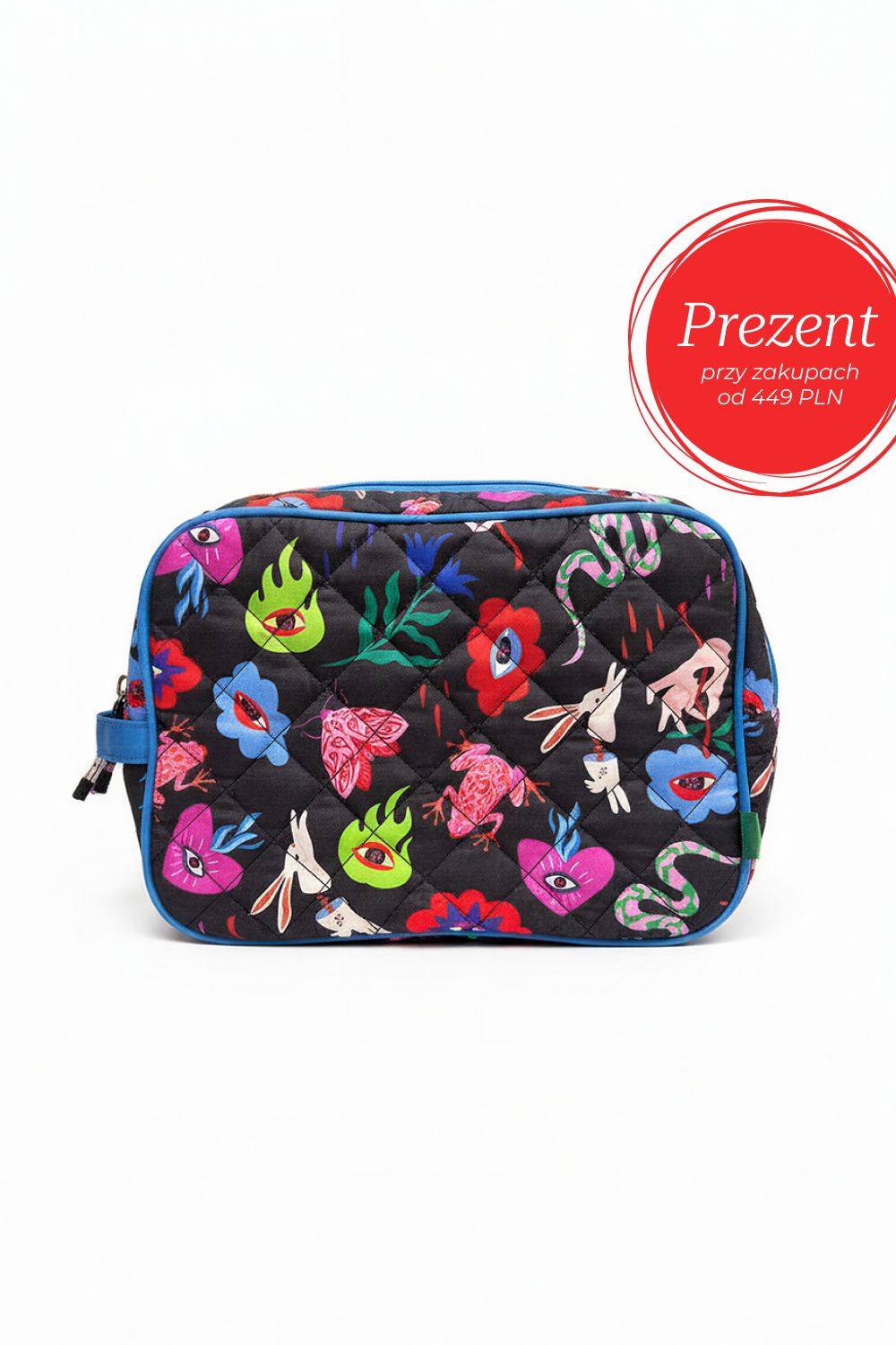 Kosmetyczka Hocus Lotus to coś więcej niż miejsce na kosmetyki – to Twój osobisty talizman. Pikowany materiał w czarnym kolorze został ozdobiony kolorowymi, magicznymi motywami, a kontrastowy, niebieski zamek dodaje jej nowoczesnego charakteru. Jest pojemna i wytrzymała, idealna na każdą wyprawę.
