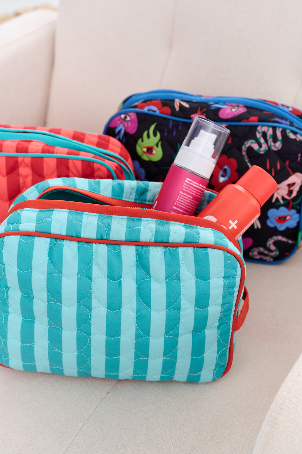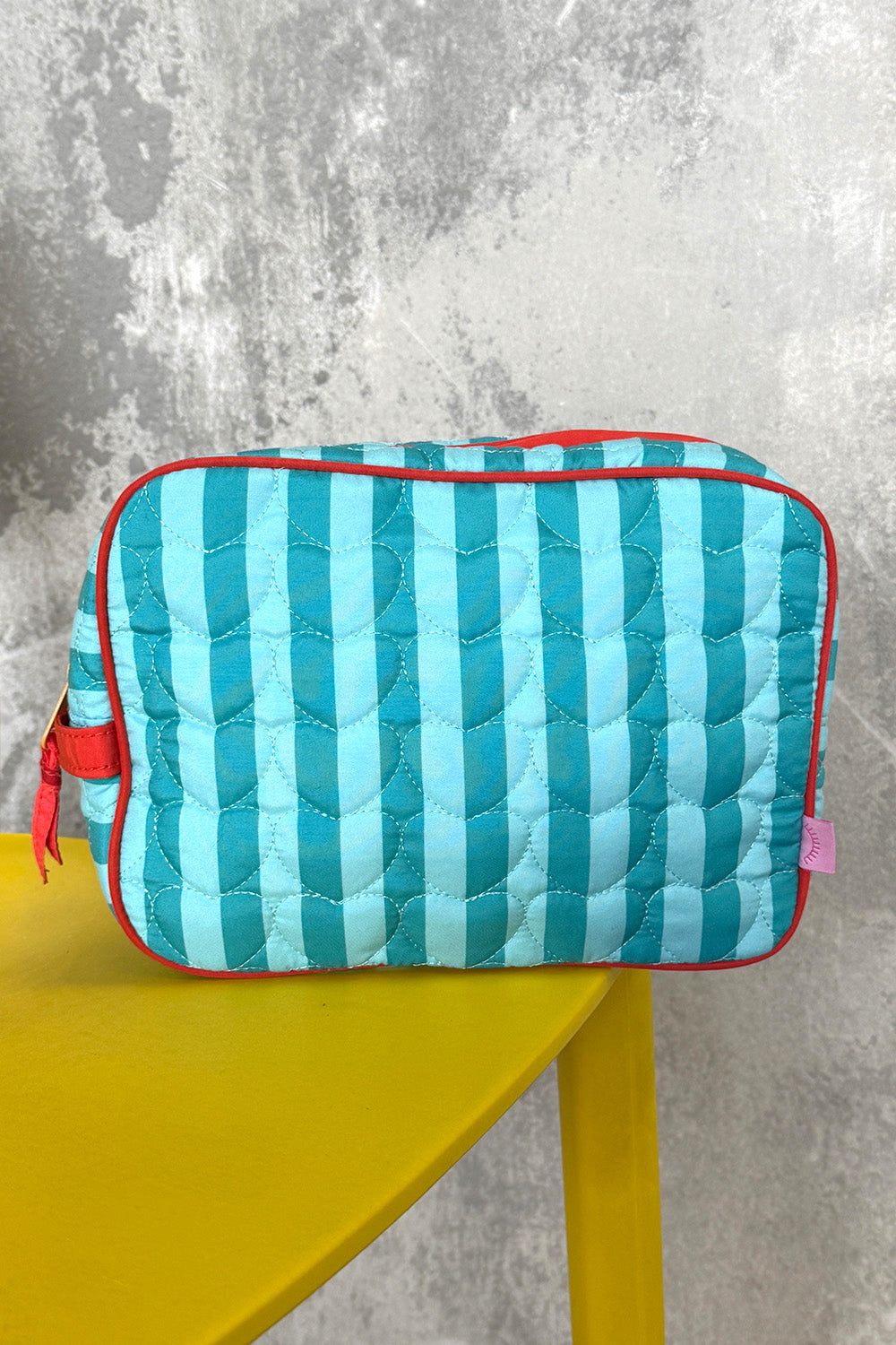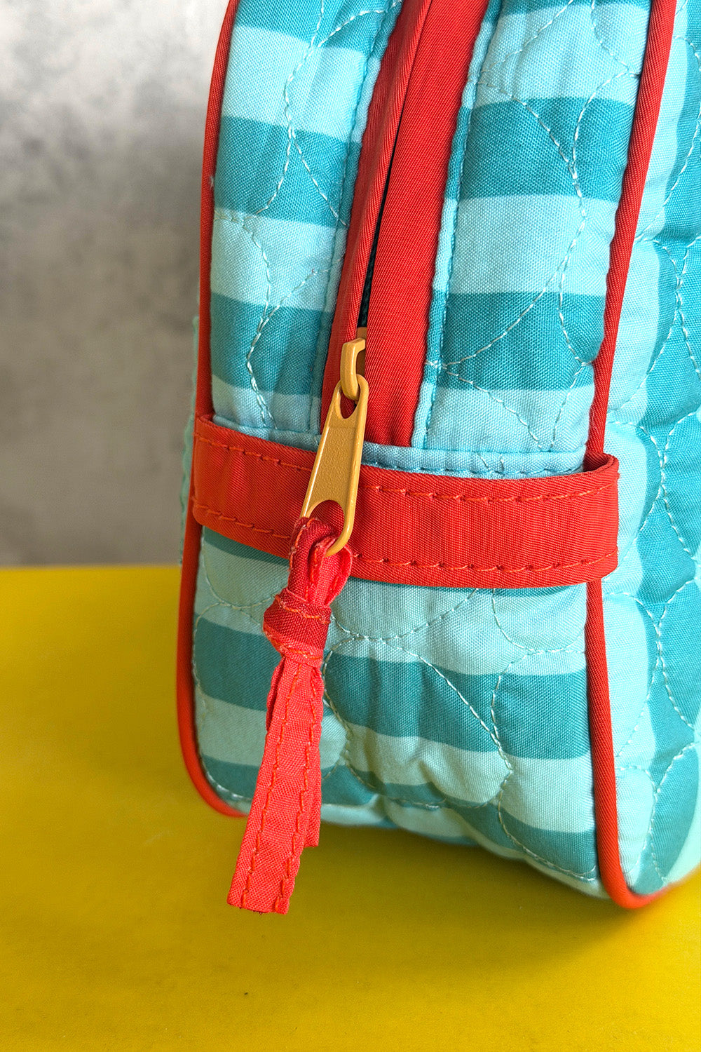 Kosmetyczka Sugar Pop to idealny dodatek, który wniesie kolor do Twojej łazienki. Wykonana z miękkiego, pikowanego materiału w dwukolorowe, turkusowe pasy, jest równie praktyczna, co stylowa. Zmieścisz w niej wszystkie swoje ulubione kosmetyki i akcesoria.